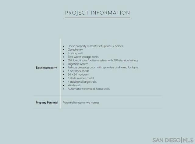 • 2.76 acres • Horse property currently set up for 6-7 horses • Gated entry • Existing well • Two water storage tanks • 35 kilowatt solar/battery system with 220 electrical wiring • Irrigation system • Full-size dressage court with sprinklers and wired for lights • 3 haystack sheds • 24’ x 24’ haybarn • 3 stalls in mare motel • 4 additional large stalls • Wash rack • Automatic water to all horse stalls