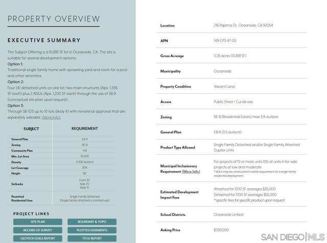 The Subject Offering is a 10,891 SF lot in Oceanside, CA. The site is suitable for several development options: Option 1: Traditional single-family home with sprawling yard and room for a pool and other amenities. Option 2: Four (4) detached units on one lot; two main structures (Apx. 1,336 SF each) plus 2 ADUs (Apx. 1,200 SF each) through the use of SB 9 (conceptual site plan upon request). Option 3: Through SB 1123 up to 10 lots (likely 4) with ministerial approval that are separately saleable. Boundary, topo, geotech, title, and conceptual site plans upon request.
