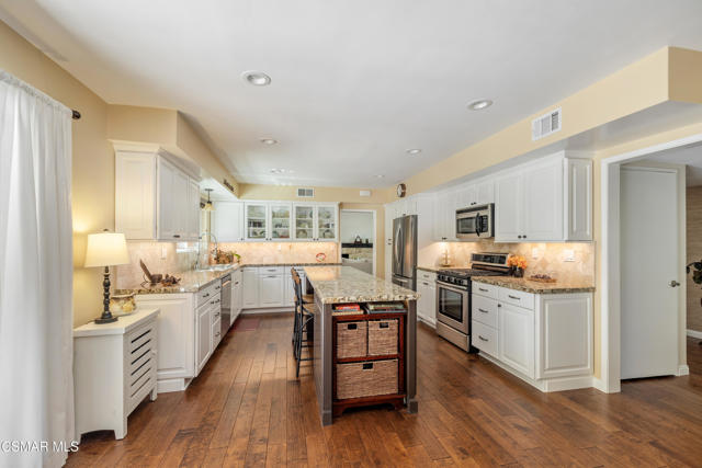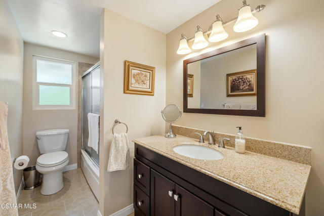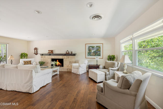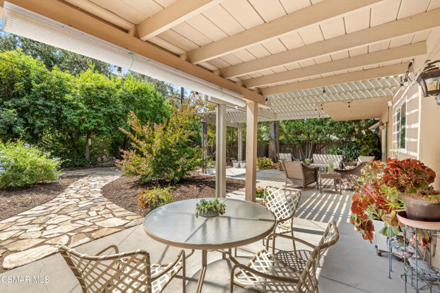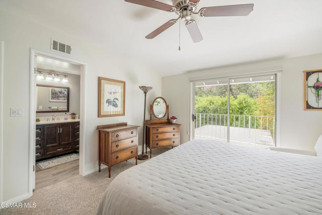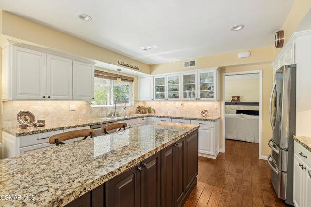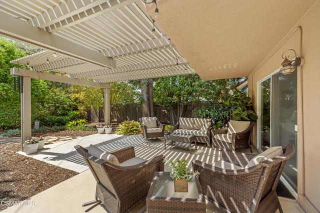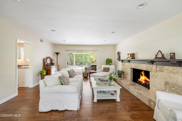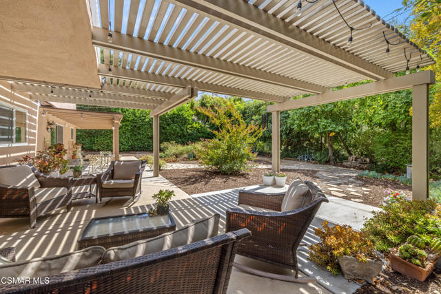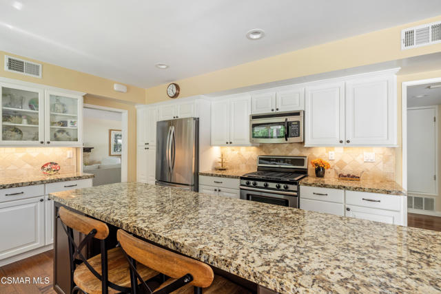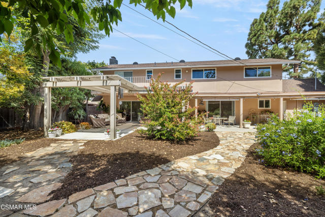 Back To Nature! Welcome home to this gorgeous 4 bedroom, 3-bathroom home in the heart of Thousand Oaks. Once you enter you will notice the open and bright living room featuring a travertine fireplace. Gourmet kitchen comes with granite counters, spacious island with seating and storage. Stainless steel appliances, travertine tiled backsplash and glass front cabinets. Downstairs full bedroom/bathroom with updated vanity and tiled shower can also be used as an office, den or hobby room. Upstairs you will enjoy two secondary bedrooms and hallway bathroom with updated vanity and tiled shower tub. Primary bedroom boasts inviting balcony, while primary bathroom has updated vanity and spacious tiled shower. Take a stroll on the walkway through the peaceful backyard, while enjoying the native plant garden and oak trees that accompany the approximately 1/3 acre of serenity. Plenty of seating and entertaining under the Aluma Wood patio cover, in this quiet location which backs to the creek and accompanying open space. Other amenities include dual paned windows, custom shades/blinds, wood flooring, indoor laundry, 2-car garage, fresh paint, newer HVAC, ceiling fans and recessed lights. Close to schools, library, parks and shopping. Come and view this welcoming home today!