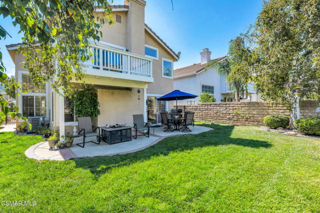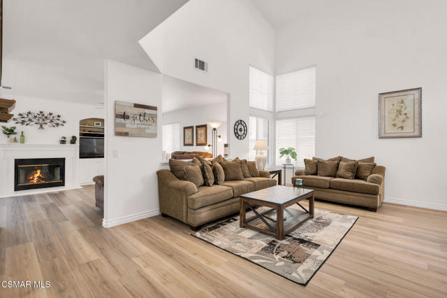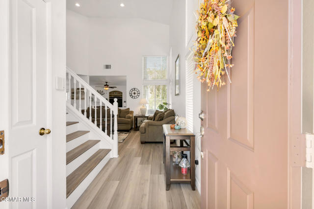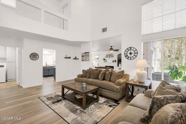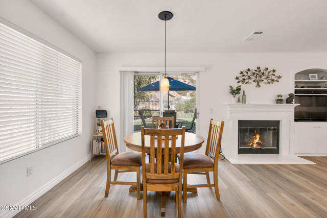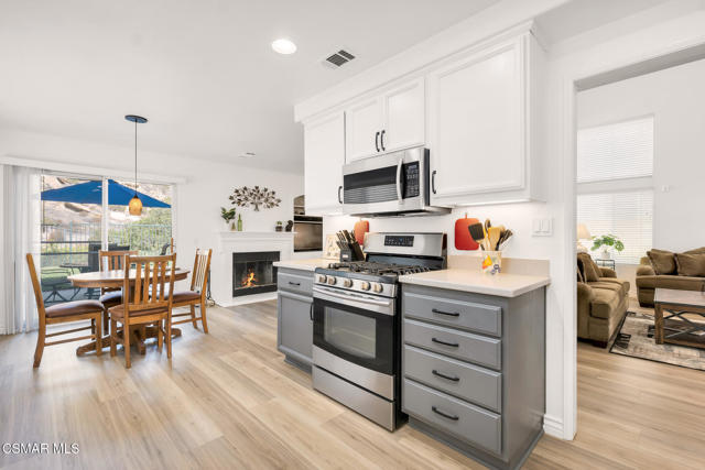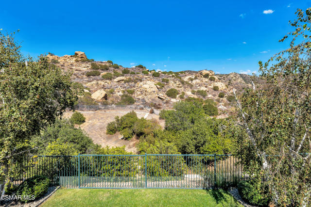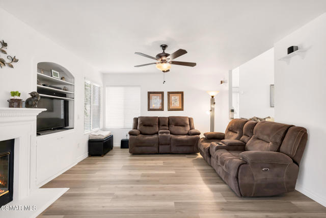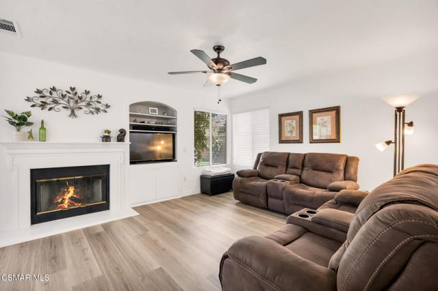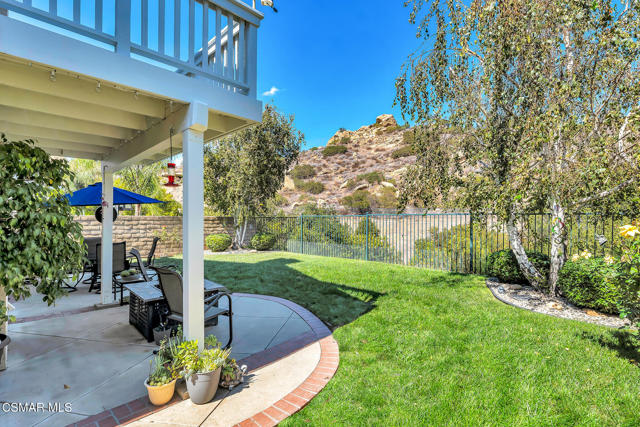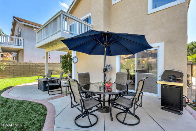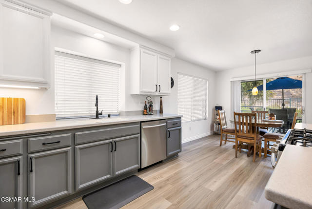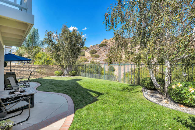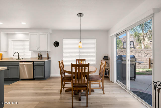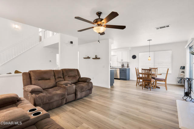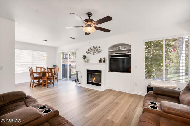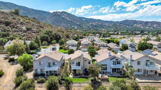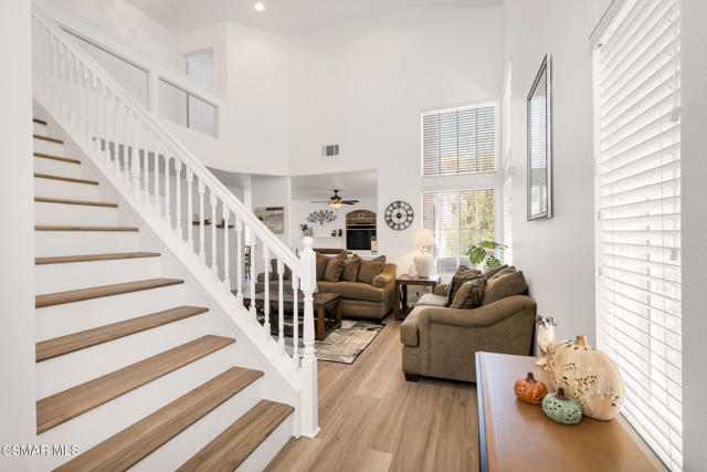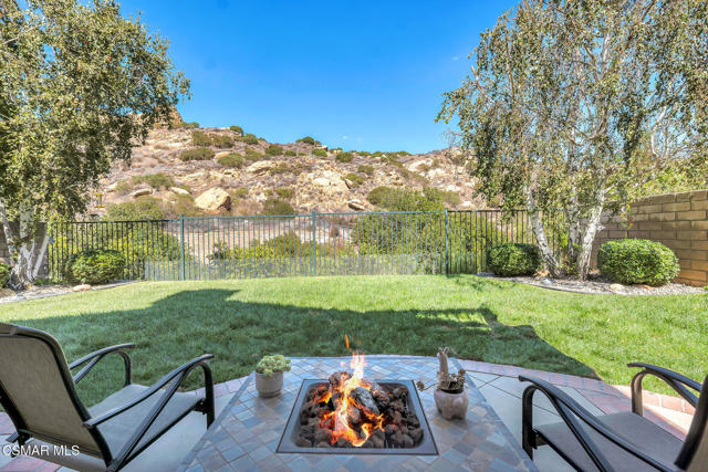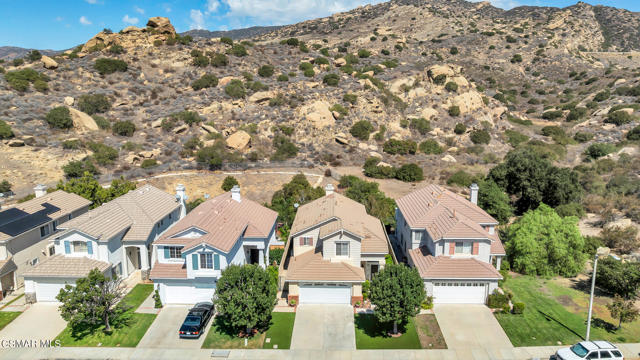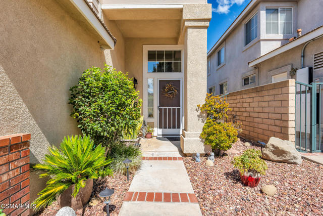 Tucked at the end of a cul-de-sac with beautiful hilltop views in the lovely Hopetown community, this two-story home offers 3 bedrooms, 2.5 bathrooms, and approximately 1,659 sq. ft. of living space on a 4,356 sq. ft. lot. Curb appeal begins with a turf front yard, rock planter, brick-lined walkway, and brick accents surrounding the two-car garage with roll-up door. A small front patio provides a welcoming spot to sit and enjoy the neighborhood. Inside, soaring ceilings in the living room and abundant dual-paned windows with blinds fill the home with natural light. Luxury vinyl plank flooring extends throughout the main level, stairway, and upper hall. A powder room with a white quartz vanity and blue cabinetry, along with a laundry room featuring storage and direct access to the garage, add function and convenience. The garage offers a coated floor, built-in storage, and a side yard door. Open to the dining nook and kitchen, the family room offers a gas fireplace with white mantle, ceiling fan with light, media niche, and a corner window framing picturesque views of nearby hills and rock formations. The kitchen is appointed with light gray Corian countertops, two-toned white and gray soft-close cabinetry, recessed and under-cabinet lighting, a garden window, and stainless Samsung appliances including a 5-burner range/oven, microwave, dishwasher, and refrigerator. A sliding door from the nook leads to the backyard, where a brick-lined patio, grassy lawn, covered sitting space, and two corner planters with trees provide the perfect setting for outdoor living. With no neighbors directly behind, the iron rear fence opens to unobstructed views of the surrounding hills and rock formations. Upstairs, the primary suite features vaulted ceilings, a ceiling fan, walk-in closet with attic access, and a sliding glass door to a private viewing deck with scenic hillside outlooks. The remodeled bath showcases quartz countertops with tile surrounds, dual sinks, a soaking tub, and an oversized shower with rain head, water wand, and shampoo niche. Two secondary bedrooms and a hall bath with tub/shower combination complete the upper level. Additional highlights include raised panel interior doors, custom 4' baseboards, a white spindle staircase, and modern lighting throughout. This move-in ready home also offers a convenient location near parks, trails, shopping, dining, and the 118 Freeway for commuters.