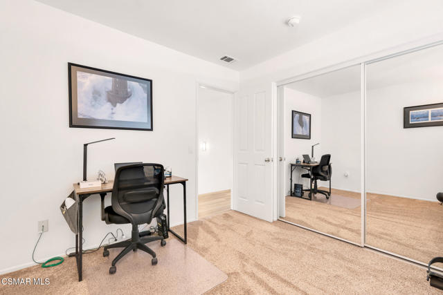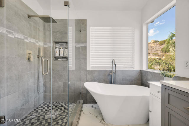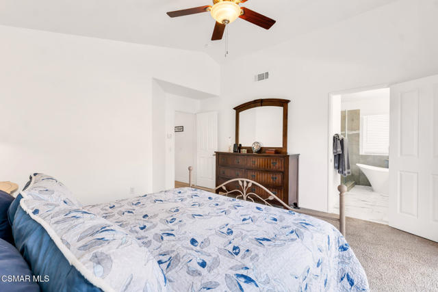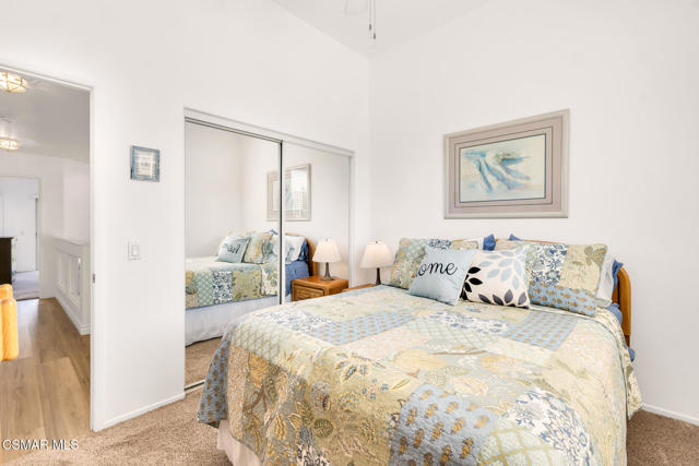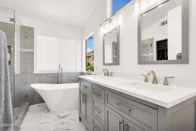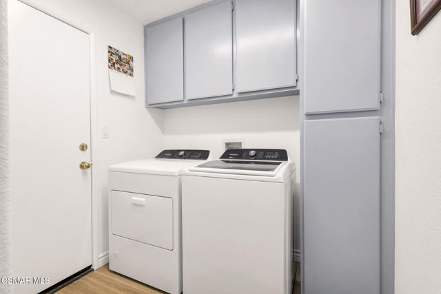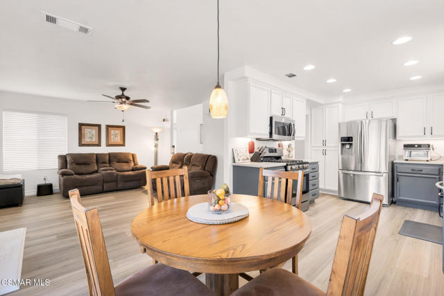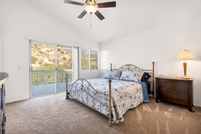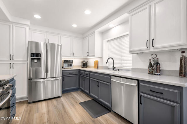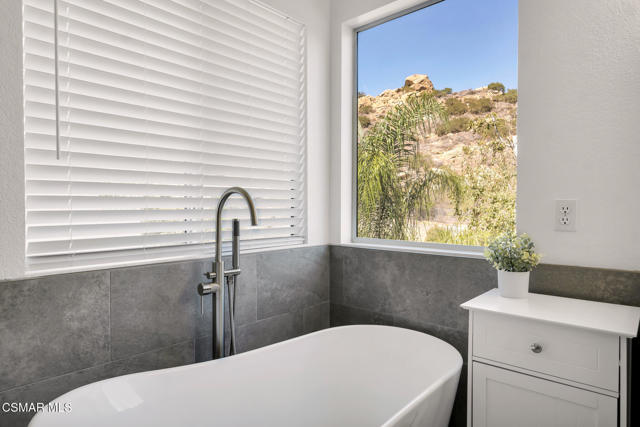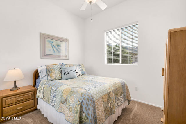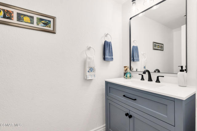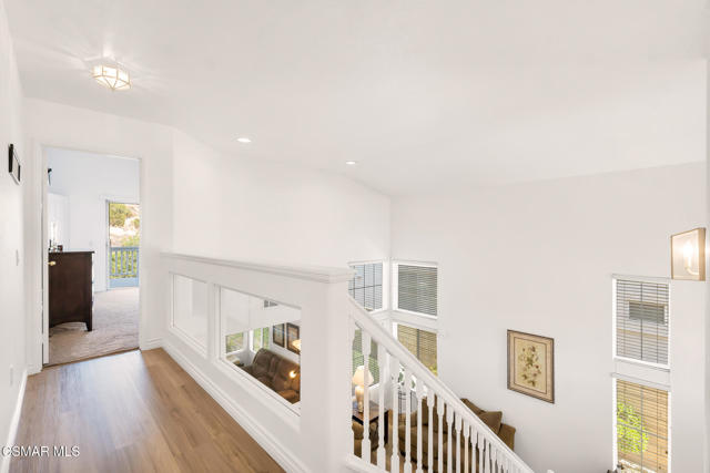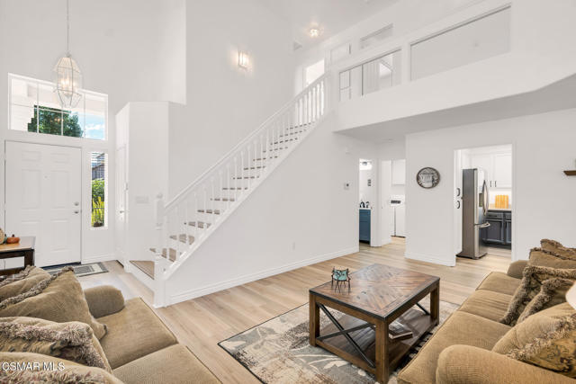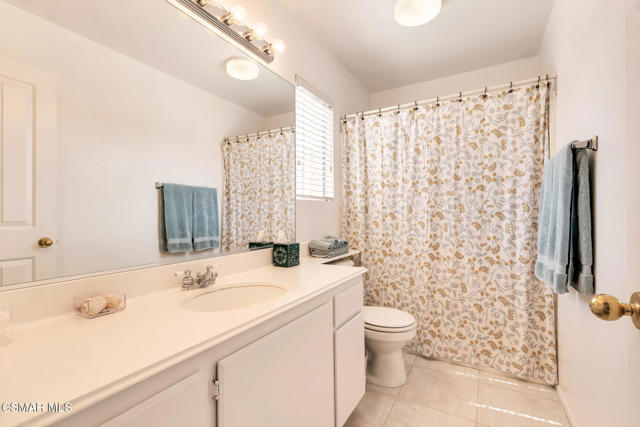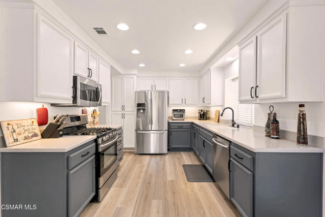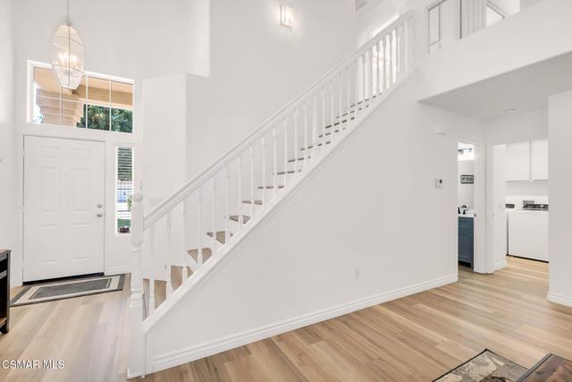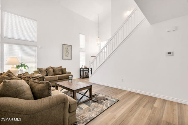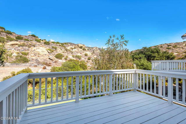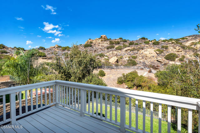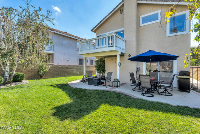 Tucked at the end of a cul-de-sac with beautiful hilltop views in the lovely Hopetown community, this two-story home offers 3 bedrooms, 2.5 bathrooms, and approximately 1,659 sq. ft. of living space on a 4,356 sq. ft. lot. Curb appeal begins with a turf front yard, rock planter, brick-lined walkway, and brick accents surrounding the two-car garage with roll-up door. A small front patio provides a welcoming spot to sit and enjoy the neighborhood. Inside, soaring ceilings in the living room and abundant dual-paned windows with blinds fill the home with natural light. Luxury vinyl plank flooring extends throughout the main level, stairway, and upper hall. A powder room with a white quartz vanity and blue cabinetry, along with a laundry room featuring storage and direct access to the garage, add function and convenience. The garage offers a coated floor, built-in storage, and a side yard door. Open to the dining nook and kitchen, the family room offers a gas fireplace with white mantle, ceiling fan with light, media niche, and a corner window framing picturesque views of nearby hills and rock formations. The kitchen is appointed with light gray Corian countertops, two-toned white and gray soft-close cabinetry, recessed and under-cabinet lighting, a garden window, and stainless Samsung appliances including a 5-burner range/oven, microwave, dishwasher, and refrigerator. A sliding door from the nook leads to the backyard, where a brick-lined patio, grassy lawn, covered sitting space, and two corner planters with trees provide the perfect setting for outdoor living. With no neighbors directly behind, the iron rear fence opens to unobstructed views of the surrounding hills and rock formations. Upstairs, the primary suite features vaulted ceilings, a ceiling fan, walk-in closet with attic access, and a sliding glass door to a private viewing deck with scenic hillside outlooks. The remodeled bath showcases quartz countertops with tile surrounds, dual sinks, a soaking tub, and an oversized shower with rain head, water wand, and shampoo niche. Two secondary bedrooms and a hall bath with tub/shower combination complete the upper level. Additional highlights include raised panel interior doors, custom 4' baseboards, a white spindle staircase, and modern lighting throughout. This move-in ready home also offers a convenient location near parks, trails, shopping, dining, and the 118 Freeway for commuters.