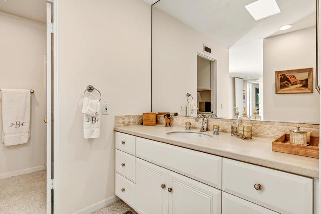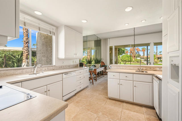 Mid-Century modern furnished Condo built in 1967 designed by legendary architect William Krisel who helped define famous Palm Springs modern architecture. This Indian Wells Country Club Sandpiper Condo has fantastic location, 2 bedrooms, 2 bath, large atrium patio, 2 car garage and 1864 Sq. Ft. of interior living with extended patio overlooking the beautiful pool and mountain views. Walk into light and bright open floor plan with high ceilings, wall of glass sliders in the spacious Great Room, high ceilings, stone fireplace, and built-in custom cabinetry galore. Formal Dining area with views. Kitchen has picturesque south mountain views, light countertops, white appliances, informal wet bar, and seating. Light tile floors throughout; carpets in the bedrooms. Primary Bedroom with walk-out private atrium and mountain views. Primary Bath has light countertops, dual sinks, big walk-in closet, large vanity, and separate toilet area with tub/shower. Guest Bedroom has walk- in closet, and ensuite bath with white tiled shower. Large Laundry Room for extra storage. Enjoy the privacy of Indian Wells Country Club!