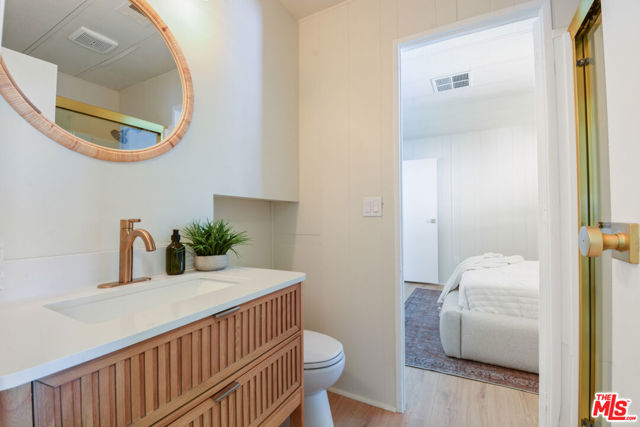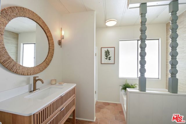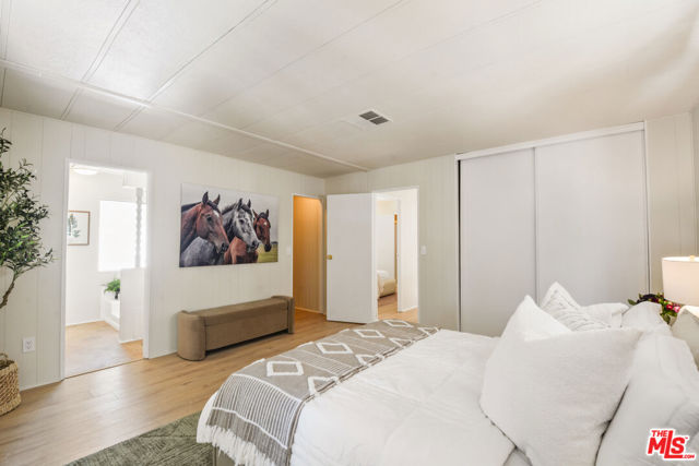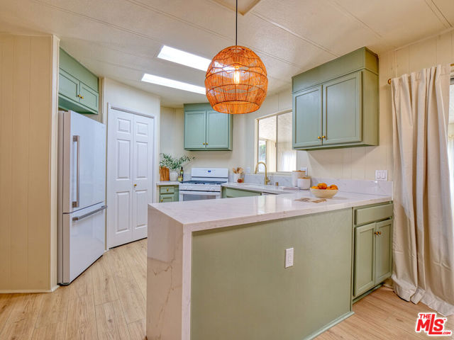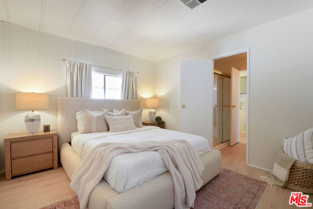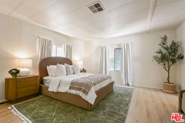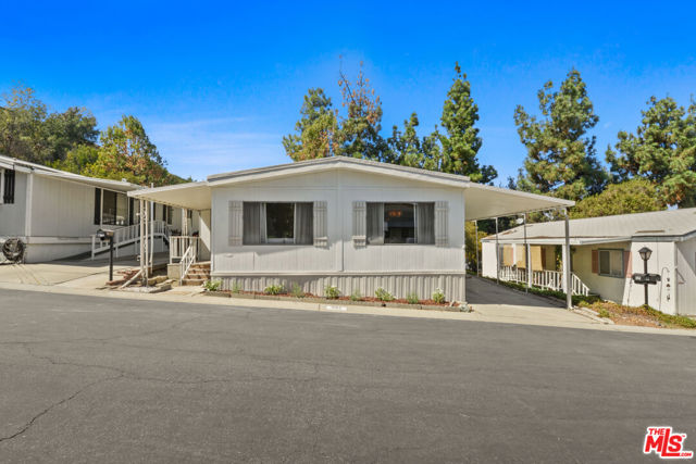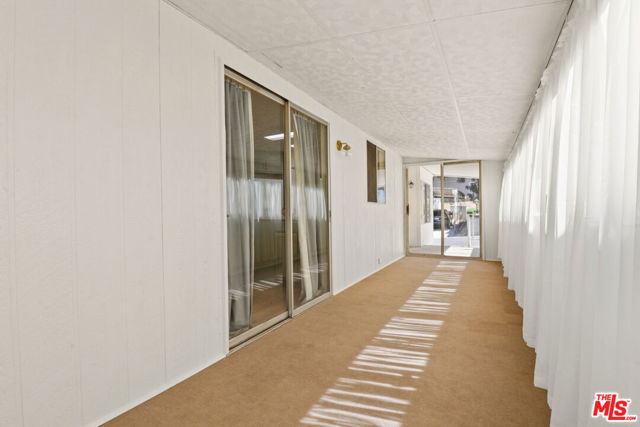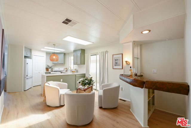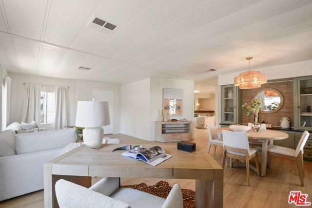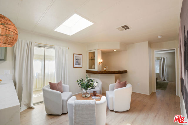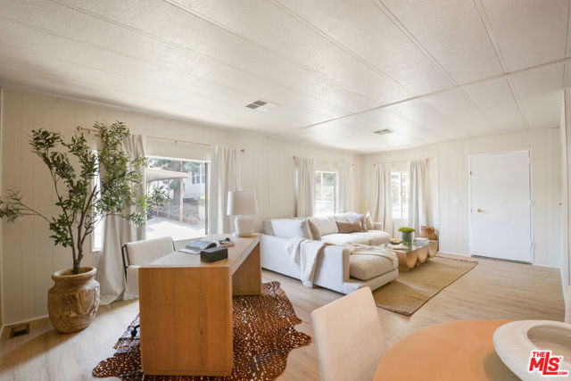 This beautifully remodeled double-wide coach is situated on an exceptionally private lot that backs up to the community park area, ensuring maximum privacy with no neighbors behind you. The home has been fully renovated, featuring new vinyl flooring throughout and a modernized kitchen equipped with custom cabinetry, brand-new appliances, and a quartz countertop with a stunning waterfall edge. Both bathrooms are newly updated, offering shower doors, new vanities with quartz counters, and stylish brass fixtures. The airy, light-filled interior features an open floor plan, complete with a built-in dining room hutch and an updated original bar. The primary bedroom features two closets, one of which is a walk-in closet. A spacious enclosed patio off the property is perfect for a bonus room. Additional features include central air conditioning and heating, plus two side storage units for extra space.