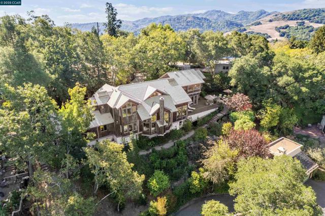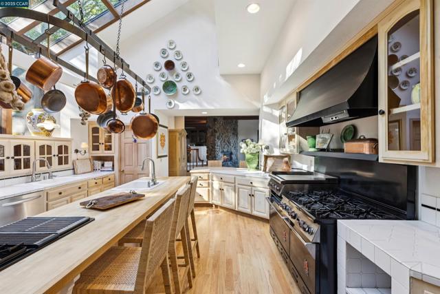Nestled near the popular Orindawoods community and in the prestigious Orinda Country Club neighborhood, this beautifully appointed home offers a serene retreat with stunning views of the surrounding hills. As you enter, you’re welcomed by soaring ceilings, expansive windows, and a mix of rich hardwood floors and wool carpeting that immediately set a tone of understated luxury. Rich wood doors and millwork lend character and warmth throughout the home. A dream kitchen straight out of a Nancy Meyers movie sets the tone for this home’s heart and soul. Bathed in natural light pouring through a vaulted ceiling and dramatic skylight, the space is as charming as it is practical—a chef’s delight— equipped with professional-appliances and plenty of room to create. Just off the kitchen, the family room invites relaxation with its floor-to-ceiling rock fireplace and direct access to the backyard. A few steps away, an elevated pub-style bar offers a handsome setting for entertaining. A room meant for gathering—the formal dining room is a showstopper, with 17' ceilings and dramatic picture windows that flood the space with natural light. Outside, the grounds feel lush and alive. Mature vegetation surrounds you—citrus trees, hydrangeas, roses, and more—framing every path and corner in green.