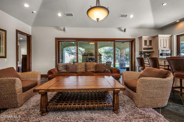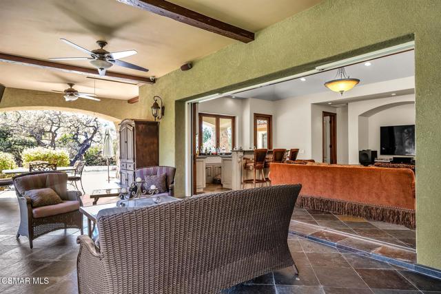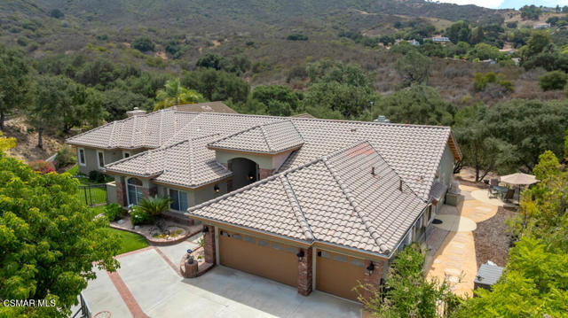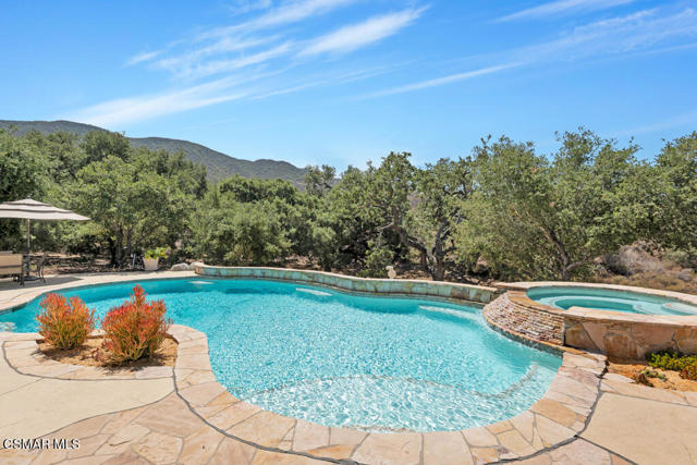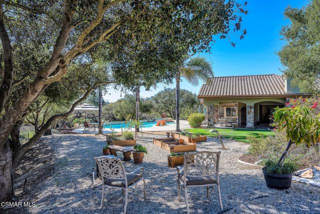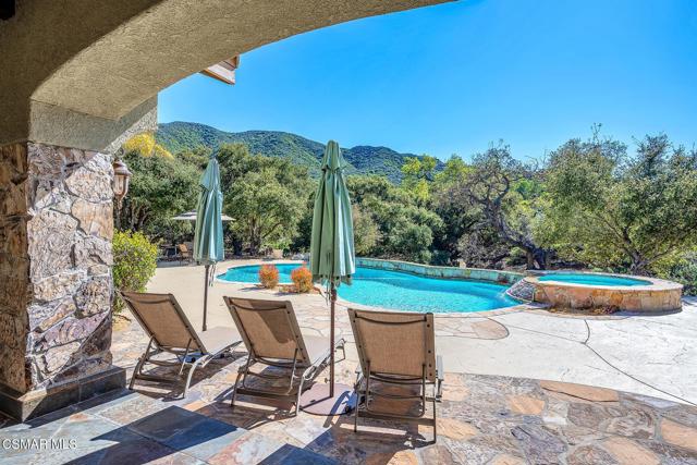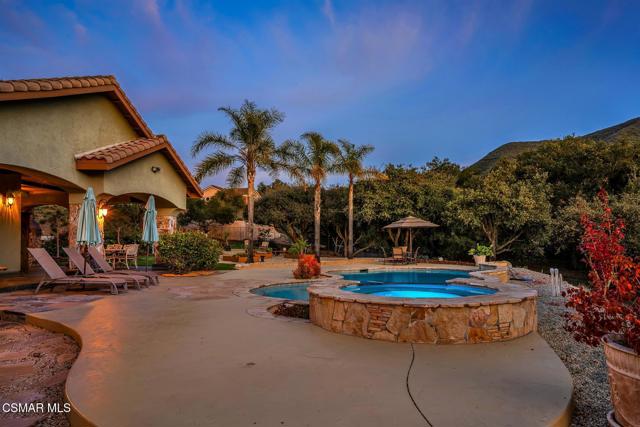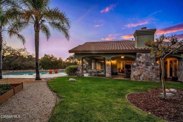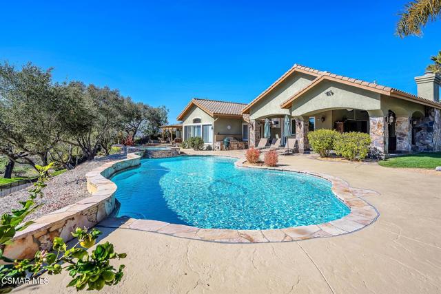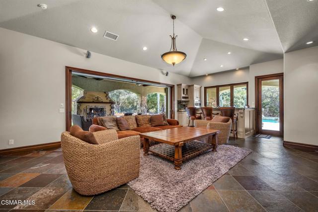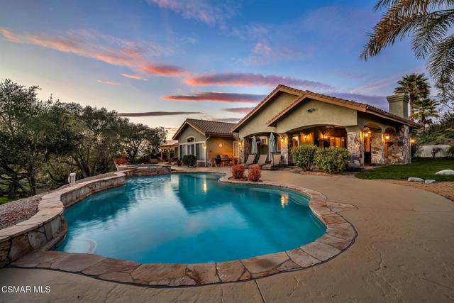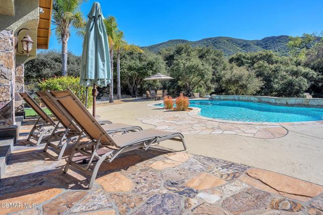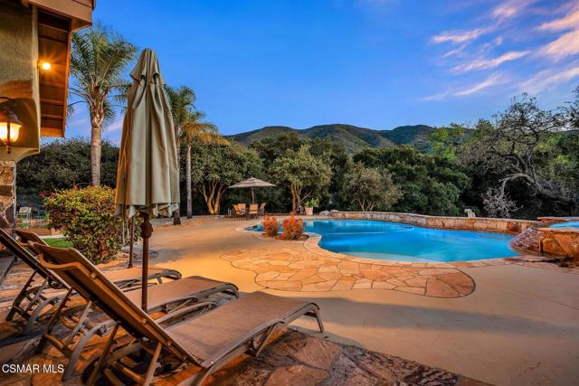 Now relisted with flexible seller financing incentives designed to lower your monthly payment. This private, single-story estate in Newbury Park offers a rare blend of timeless design, natural beauty, and lifestyle flexibility-set on over three-quarters of an acre. Tucked behind a long private drive with potential for gated access, this 4,417 sq ft residence delivers expansive single-level living, indoor-outdoor flow, and stunning mountain views.The backyard is a true retreat, backing to open space with multiple patios, a sparkling pool and spa, and a 740 sq ft covered pavilion with fireplace, TV hookups, and built-in outdoor kitchen. Fruit trees, garden beds, and mature landscaping complete the experience.Inside, wide-plank hardwood and slate tile floors connect generous living and dining spaces. The kitchen offers ample storage, a large granite island, built-in refrigerator, double ovens, and a five-burner gas range-ready to be personalized by the next owner. A full laundry room, mudroom, and an entertainer's bar with passthrough window offer practical everyday function.Custom 16-foot lift-and-slide doors open completely to the backyard, blending the interior with nature. The layout includes a guest/in-law suite with separate entrance, all en-suite bedrooms, and a spacious primary retreat. The oversized lot also offers room for a future ADU.Energy-efficient and safety-minded, the home includes solar with two Tesla Powerwall 3 units, ember-resistant roof and vents, a dedicated fire gel pump system, dual Navien tankless water heaters, fiber internet, and fresh interior/exterior paint.Motivated sellers have thoughtfully repositioned this offering to create opportunity. A rare single-level estate with exceptional privacy, just minutes from trails, open space, and the 101.