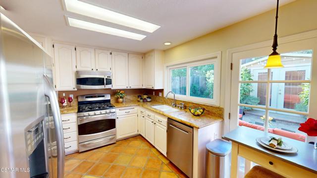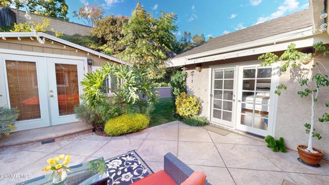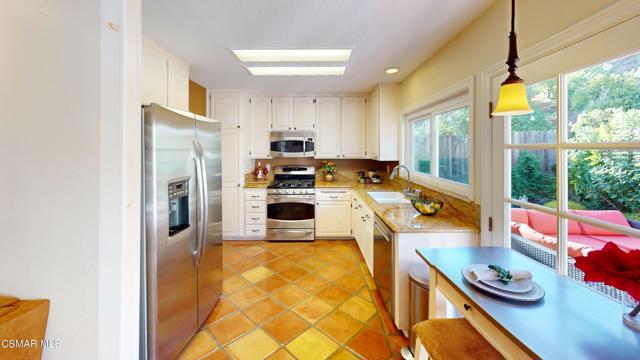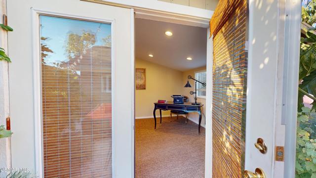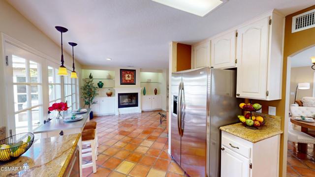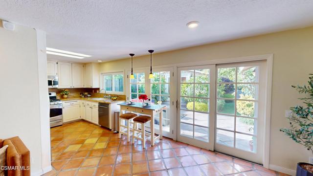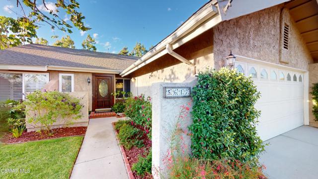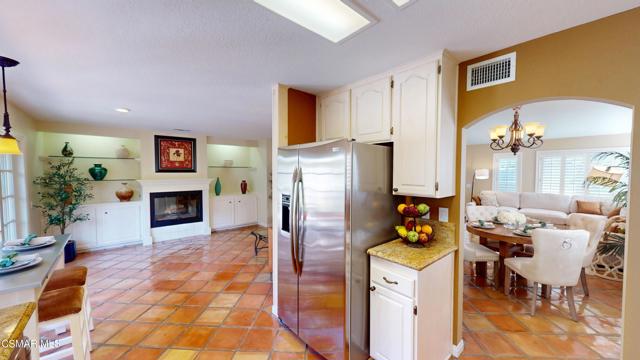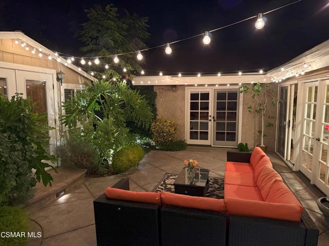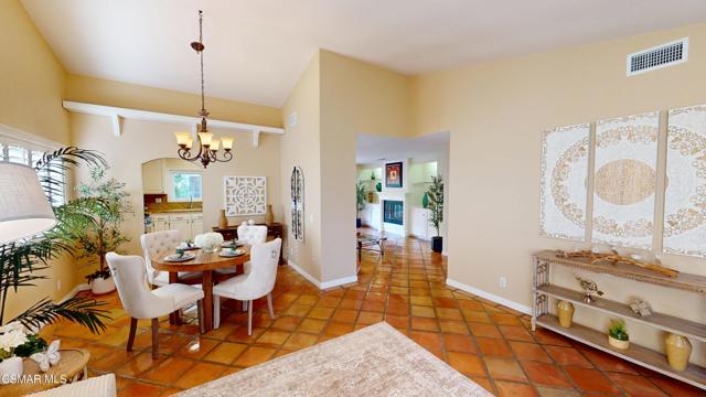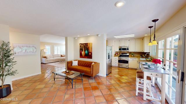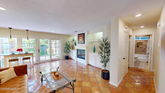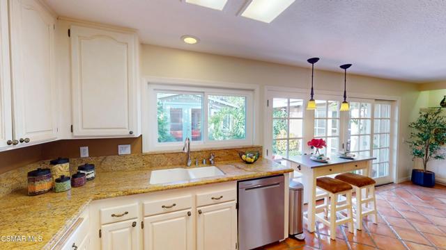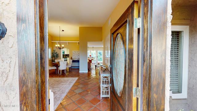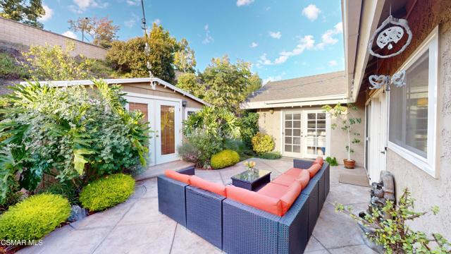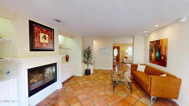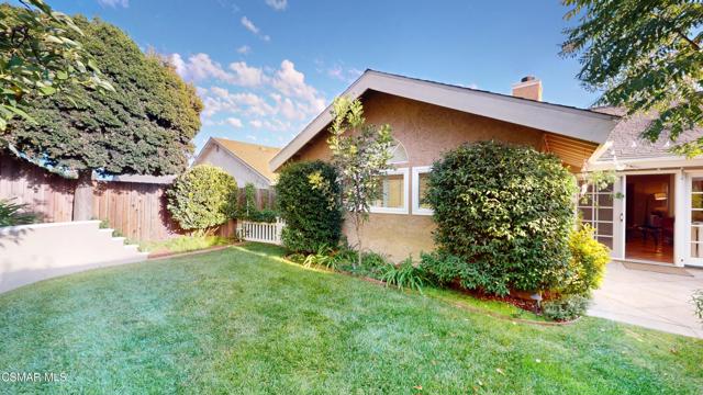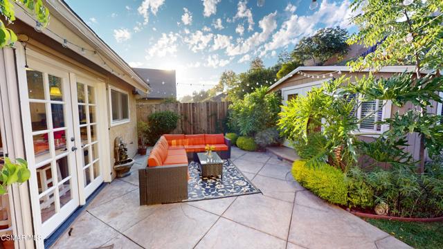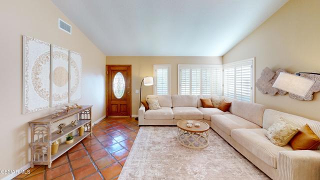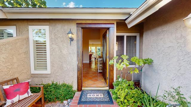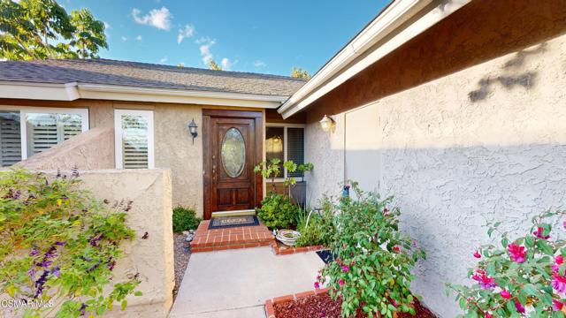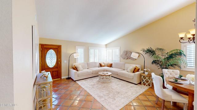 Nestled in Camarillo's coveted Mission Oaks, this move-in-ready, single-story Spanish-style gem blends elegance with seamless indoor/outdoor living. Lush landscaping and a newly stained wood door with beveled glass welcome you inside, where polished terracotta floors lead to a bright living room and formal dining area with high ceilings. The cozy family room, featuring custom built-ins and a wood-burning fireplace, invites relaxation. A remodeled gourmet kitchen shines with refinished cabinetry, granite countertops, a new garbage disposal, and stainless-steel appliances. The private primary suite, tucked in its own wing, offers his-and-her closets, high ceilings with a ceiling fan, French doors to the backyard, and a luxurious en-suite with a spa-like shower, granite vanity, high-end fixtures and tile and marble finishes. Two spacious bedrooms sit near a remodeled hall bathroom with a custom granite vanity and tub/shower combo also complete with high-end fixtures, tile and marble finishes. A French slider opens to a stunning backyard with lush landscaping, a stamped concrete patio, a pet-friendly fenced yard, and a retaining wall holding up nice hillside planted with mature fruit trees and ensuring privacy. Meticulously maintained for nearly 25 years, this home boasts a tankless water heater, whole-house water softener, Milgard dual-pane windows, plantation shutters, and copper plumbing. A detached 16x12 office/hobby room offers future ADU potential. A two-car garage with automatic roll-up door, large driveway, and side yard provide ample parking. Located in the acclaimed Pleasant Valley School District, near Mission Oaks Dog & Play Park, Roxy Movie Theater, and shopping, this home offers an ideal lifestyle. Don't miss this rare gem in Camarillo's premier neighborhood. Please schedule your tour today before it's gone!
