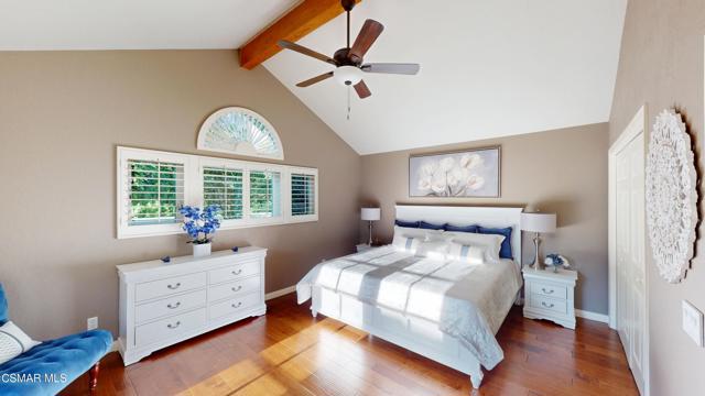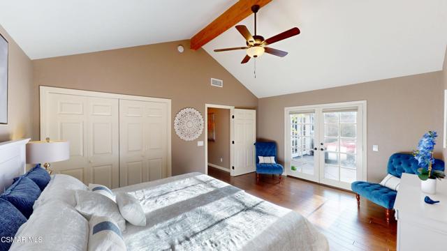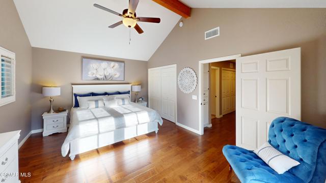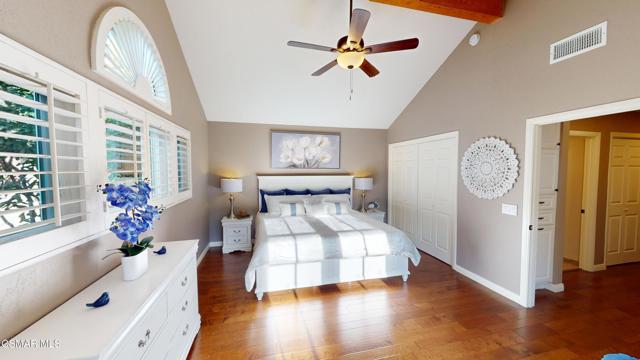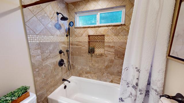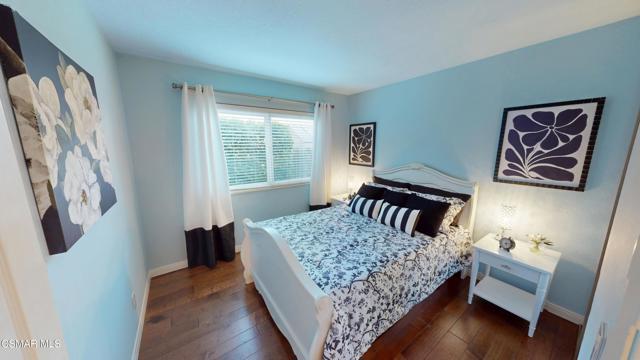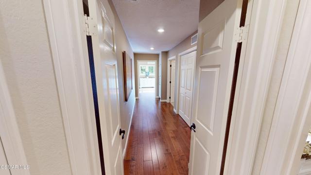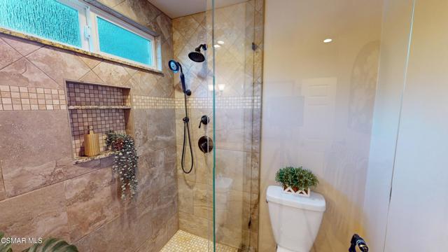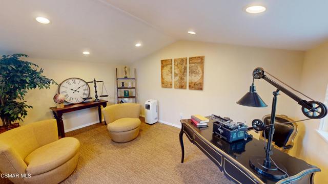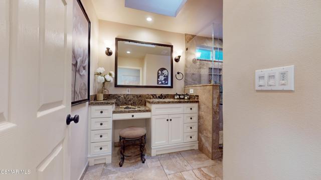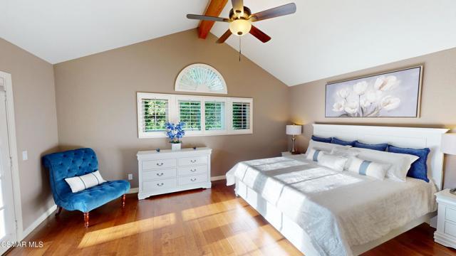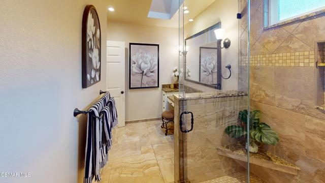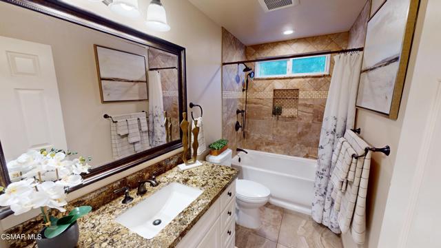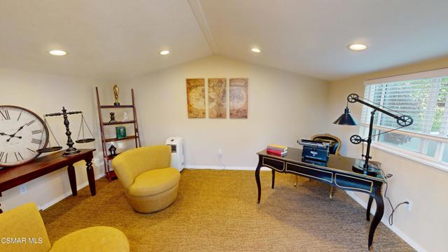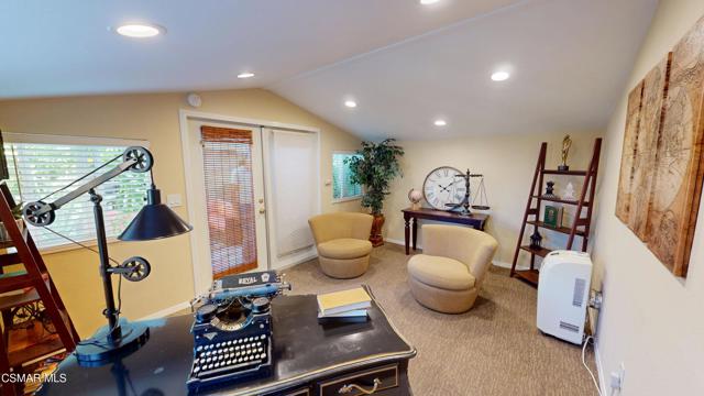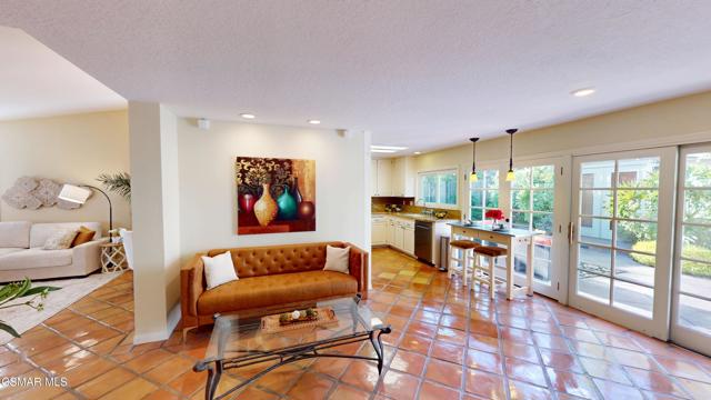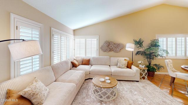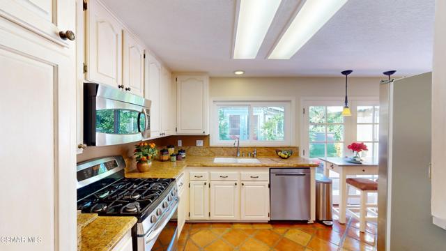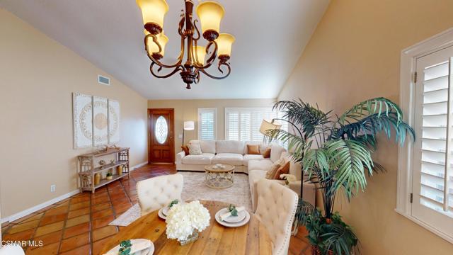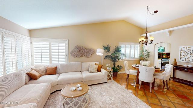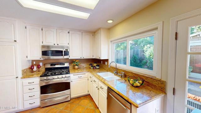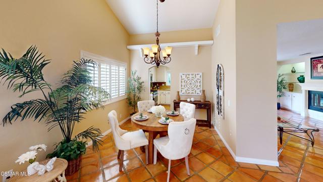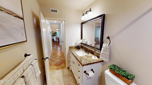 Nestled in Camarillo's coveted Mission Oaks, this move-in-ready, single-story Spanish-style gem blends elegance with seamless indoor/outdoor living. Lush landscaping and a newly stained wood door with beveled glass welcome you inside, where polished terracotta floors lead to a bright living room and formal dining area with high ceilings. The cozy family room, featuring custom built-ins and a wood-burning fireplace, invites relaxation. A remodeled gourmet kitchen shines with refinished cabinetry, granite countertops, a new garbage disposal, and stainless-steel appliances. The private primary suite, tucked in its own wing, offers his-and-her closets, high ceilings with a ceiling fan, French doors to the backyard, and a luxurious en-suite with a spa-like shower, granite vanity, high-end fixtures and tile and marble finishes. Two spacious bedrooms sit near a remodeled hall bathroom with a custom granite vanity and tub/shower combo also complete with high-end fixtures, tile and marble finishes. A French slider opens to a stunning backyard with lush landscaping, a stamped concrete patio, a pet-friendly fenced yard, and a retaining wall holding up nice hillside planted with mature fruit trees and ensuring privacy. Meticulously maintained for nearly 25 years, this home boasts a tankless water heater, whole-house water softener, Milgard dual-pane windows, plantation shutters, and copper plumbing. A detached 16x12 office/hobby room offers future ADU potential. A two-car garage with automatic roll-up door, large driveway, and side yard provide ample parking. Located in the acclaimed Pleasant Valley School District, near Mission Oaks Dog & Play Park, Roxy Movie Theater, and shopping, this home offers an ideal lifestyle. Don't miss this rare gem in Camarillo's premier neighborhood. Please schedule your tour today before it's gone!