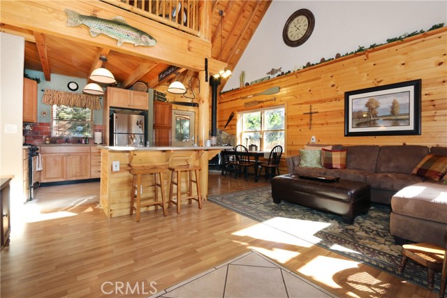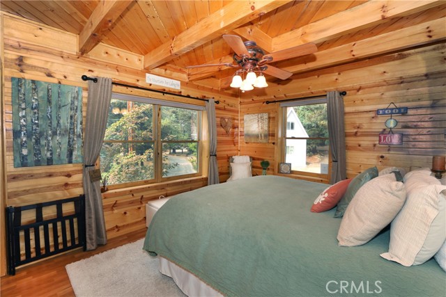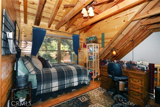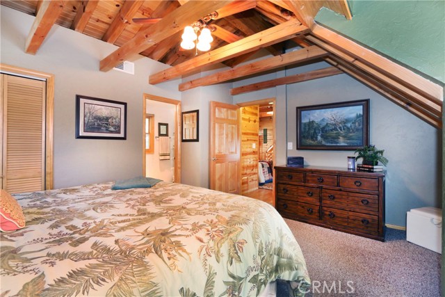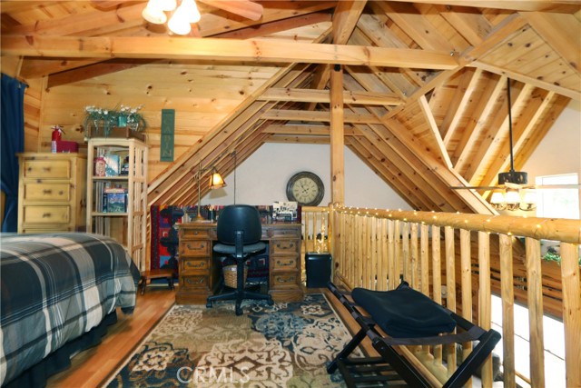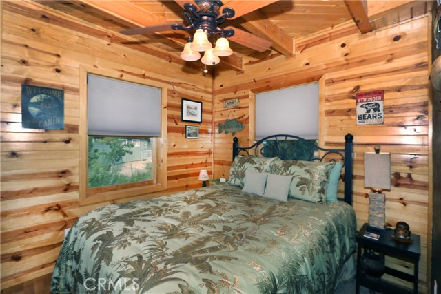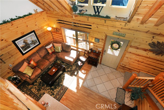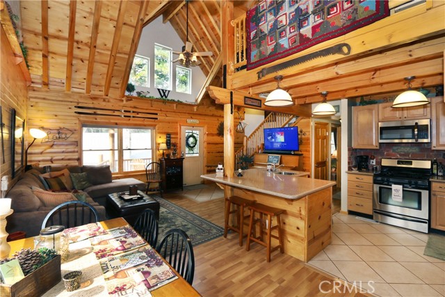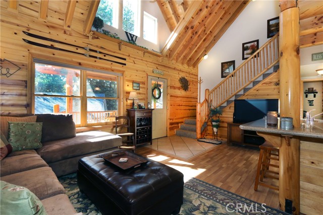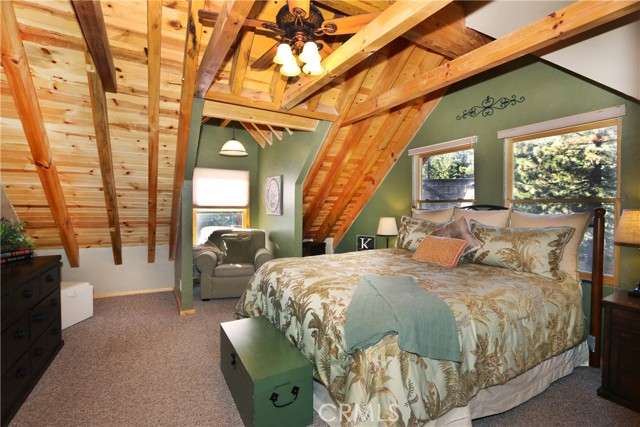 This is one of the, if not THE, most prominent cabins in the heart of this mountain lake town! It’s a testament to both rustic log charm with its exposed knotty pine beams, yet exudes modern comfort in stainless steel appliances, granite countertops, and Generac generator. Set back just 3/10th mile from the private lake for a peaceful location. The lake is stocked for fishing, has a beach, boat rentals, a dog area, and is next to the community center (pickleball, tennis, playground and more). The open beams and great room floor plan encourage a far larger feel + don’t forget to add the extra space in its amazing 936 sf buildup with 2 workbenches/storage/yard tools + a wood-room underneath the elevated front porch + note its large LOFT with double bed, dresser and desk set up. A multiple car driveway makes it easy to enter with minimal steps at front & back porches. The exterior features warm, honey-hued logs and gorgeous stonework, blending harmoniously with the professional landscape (sprinkler & drip system) and is striking against the skyline. Nature views from all windows. Inside enjoy dining at the table or around the large island with 4 barstools, a second sink and built-in dishwasher. Amazing family holiday memories have been made here with fun, food, laughter and games. Warm yourself with a roaring fire in the wood-burning stove, or with central heat. Luxurious high-end bedding offers a restful retreat and most furnishings + household are negotiable. The bedroom upstairs is a suite in itself with a window-sitting area, walk in closet, and jetted-tub. Comes with a peddle-BOAT with awning for seasonal lake fun. JUST IN TIME FOR THE HOLIDAYS! DON'T MISS IT. (K+K+Q+Dbl beds). Wifi thermostat and cameras. Owner is licensed real estate broker.