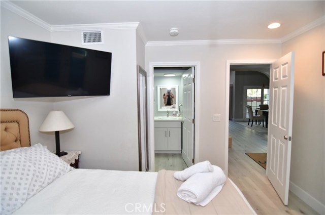 This stunning, fully remodeled residence masterfully blends modern luxury with functional design. Spanning 2,120 square feet on a generous 4,900-square-foot lot, this exquisite home offers ample space for both indoor and outdoor living. The property boasts 3 bedrooms and 3 full bathrooms, plus an elegant powder room, ensuring comfort and privacy for all residents. Each bedroom features an en-suite bathroom and a ceiling fan, creating a private retreat. The spacious master suite is a haven, complete with a double-sink en-suite bathroom, a sleek standing shower, and a freestanding soaking tub. A STANDOUT FEATURE IS THE VERSATILE DOWNSTAIRS SUITE, EQUIPPED WITH A UPGRADED MINI KITCHEN, REFRIGERATOR, COOKTOP, AND PRIVATE ENTRANCE—PERFECT FOR RENTAL INCOME OR AS AN IN-LAW SUITE FOR MULTI-GENERATIONAL LIVING. The living area impresses with a vaulted ceiling, skylights that flood the space with natural light, and a cozy fireplace with a chic marble mantel. This open-concept design flows seamlessly into a dining area framed by large windows, inviting abundant natural light. The chef’s dream kitchen features a expansive quartz island with a sink, matching countertops, modern pendant lighting, crisp white cabinetry, and professional-grade stainless-steel appliances. Light wood flooring and thoughtful decor elevate the space, while a door provides convenient access to the side yard. Recent upgrades include a state-of-the-art, energy-efficient air conditioning system and a tankless water heater, ensuring modern comfort and sustainability. The outdoor spaces are equally captivating. The front exterior features a meticulously maintained driveway lined with palm trees and manicured shrubs, creating striking curb appeal. The backyard patio is a serene retreat, boasting a brick-paved walkway, low-maintenance artificial turf, and a shaded seating area—ideal for entertaining or relaxing amidst mature trees and lush landscaping. Inside, the home continues to shine with thoughtful upgrades. The two-car garage features epoxy flooring, a laundry area with a utility sink, a work desk, and ample, well-designed storage. Located in the heart of Irvine, 8 Monticello offers a perfect balance of tranquil residential living and proximity to vibrant community amenities, including top-rated schools, shopping, dining, and recreational opportunities. This exceptional property is a rare gem, combining contemporary upgrades, versatile living spaces, and a serene, enviable location.