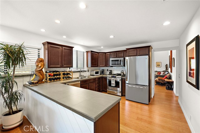 Welcome to 1 Starfish Court, a stunning and rare single-story end-unit in the coveted Newport Terrace community, ideally positioned for privacy and surrounded by mature birch trees that create a very special and tranquil natural setting. This unique and rare gem is a thoughtfully upgraded 2-bedroom, 2-bathroom featuring new bamboo flooring throughout, vaulted ceiling channeling privacy and natural light with interior laundry. The open living area includes a stacked stone fireplace and flows into a fully remodeled kitchen with GE Café appliances, fine wood cabinetry and stone countertops. Dual sliding glass doors lead to a private patio, perfect for relaxing, entertaining as well providing direct access to your 1 car garage and carport. The primary suite offers high ceilings, additional direct patio access, including generous closet space, while the second bedroom will offer up flexibility for guests or a home office. Bordered by the Talbert Nature Preserve and Canyon Park, Newport Terrace surrounds itself with miles of trails, bike paths, with direct access to the Santa Ana River Trail leading to the beach. Community amenities include two pools, a spa, sport court, and lush green spaces surrounded by mature trees, a coastal setting that feels private yet connected. Welcome to 1 Starfish Court delivering an exceptional blend of location, privacy, and tranquility!