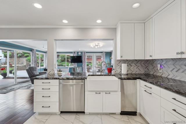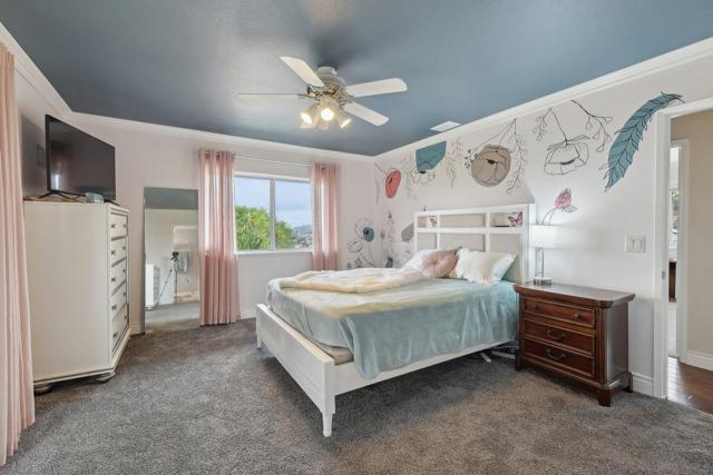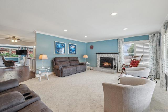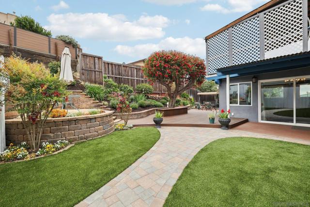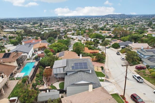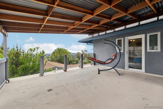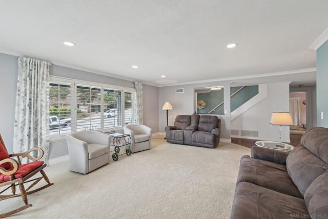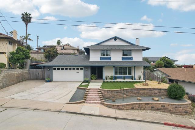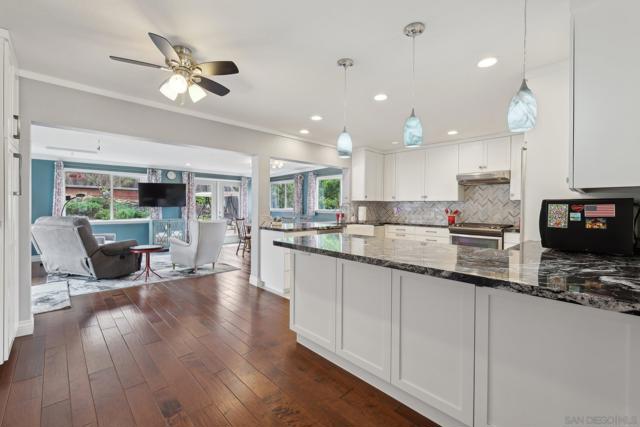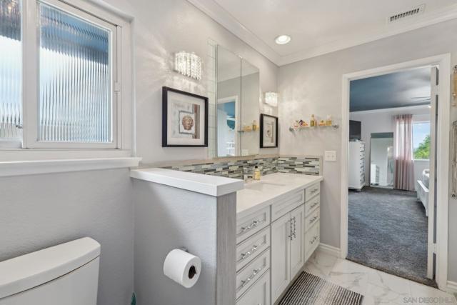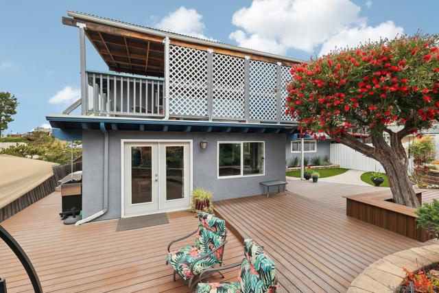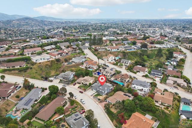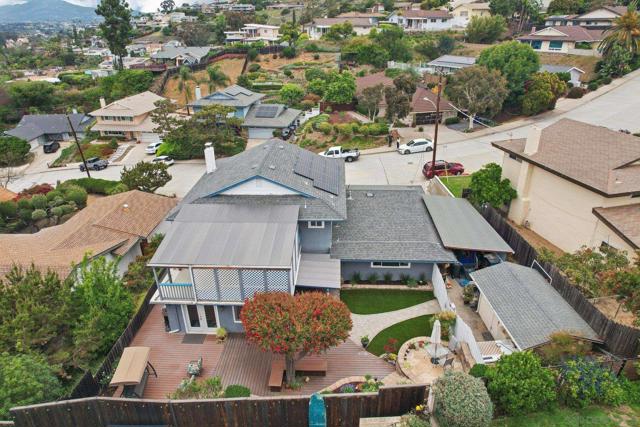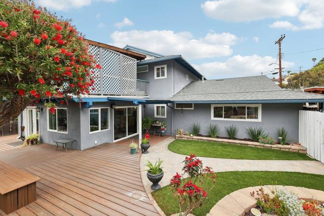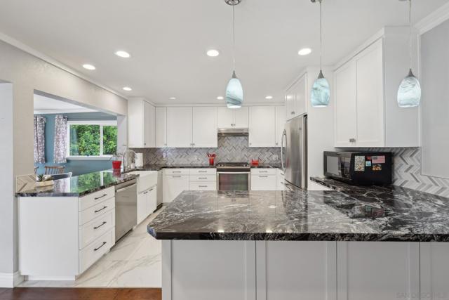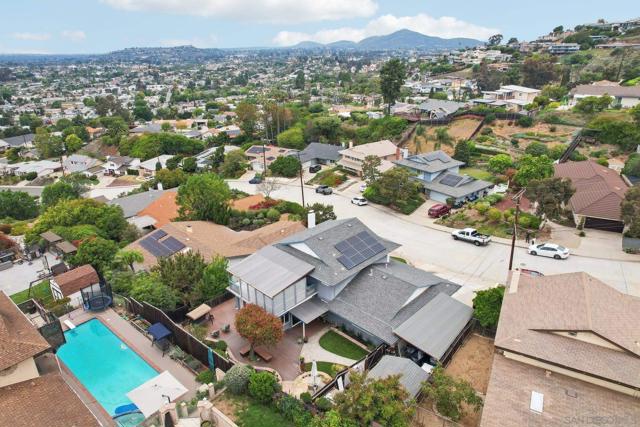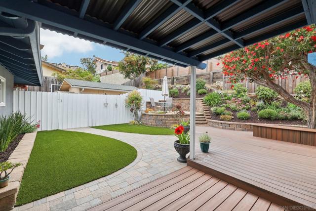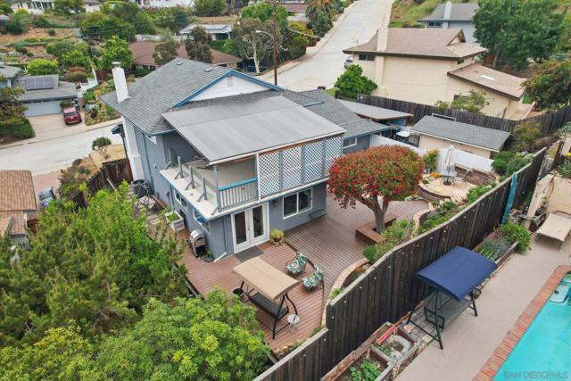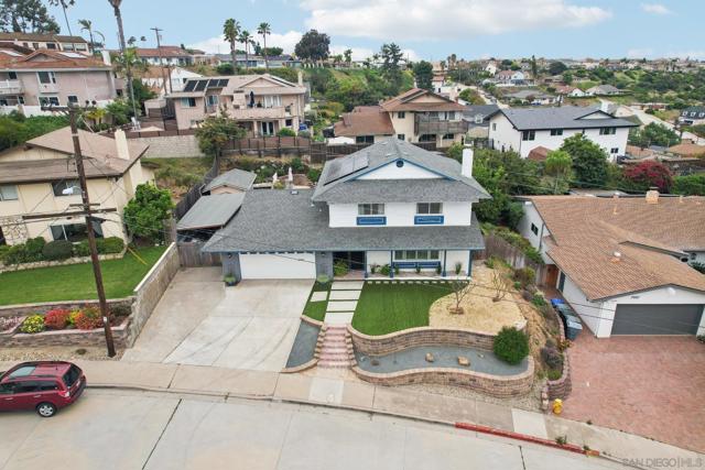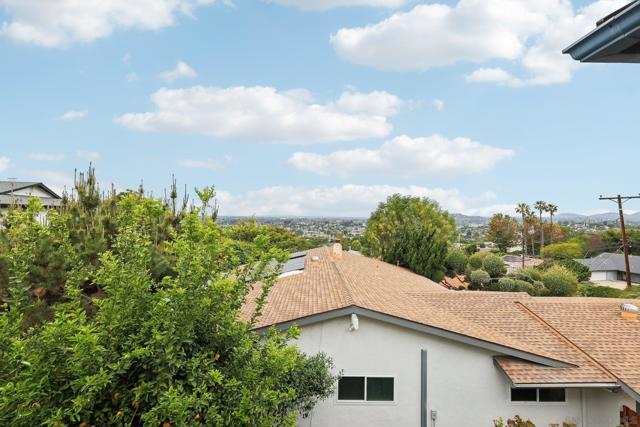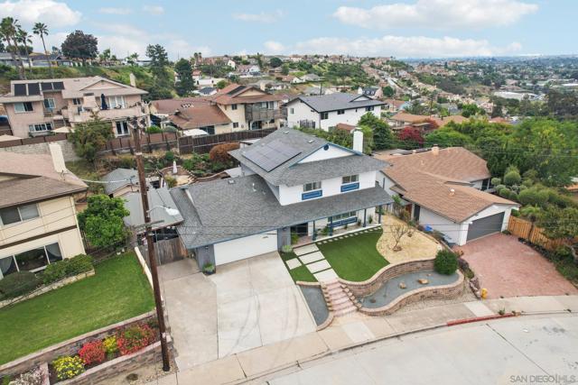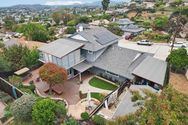 BEAUTIFULLY UPGRADED LA MESA HOME | 4 BEDROOMS + BONUS ROOM | FIRST-FLOOR BEDROOM & BATH | STUNNING MOUNTAIN VIEWS | PAID-OFF SOLAR. This beautifully updated La Mesa home combines exceptional curb appeal with a spacious, open-concept layout and a variety of high-end upgrades throughout. Upon entering, you're greeted by a bright and welcoming living space that flows seamlessly into the kitchen and bonus room, all framed by large windows that fill the home with natural light and offer easy access to the backyard. The first floor features a bedroom and bathroom, ideal for guests, extended family, or a private home office setup. The gourmet kitchen features white shaker cabinetry, dark stone countertops, a wishbone tile backsplash, a farm-style sink, stainless steel appliances, and an oversized peninsula with bar seating. Both bathrooms have been tastefully remodeled with upscale finishes, modern vanities, tile work, and updated flooring. Upstairs, you'll find three additional spacious bedrooms. The primary suite includes access to a private balcony with panoramic eastern mountain views—ideal for morning coffee or relaxing evenings. Throughout the interior, you'll find custom paint, recessed lighting, crown molding, wood flooring, and plush carpet that bring warmth and sophistication to every room. The fully landscaped backyard is perfect for entertaining, complete with multiple seating areas, a composite deck, stacked stone raised walls, synthetic grass, and paver walkways. The side yard offers built-in storage and room for RV or boat parking. This home includes a two-car attached garage, a fully paid-off 10-panel solar system for energy savings, a newer HVAC system, a tankless water heater, and energy-efficient windows. Prime Location: Convenient access to the 8, 94, and 125 freeways. Just minutes from shopping at Grossmont Center, Costco, Trader Joe’s, Target, and local favorites on University Avenue. Close to Helix Charter High School and other excellent La Mesa schools. All appliances convey, all kitchen appliances (excluding the microwave), & includes the washer and dryer.