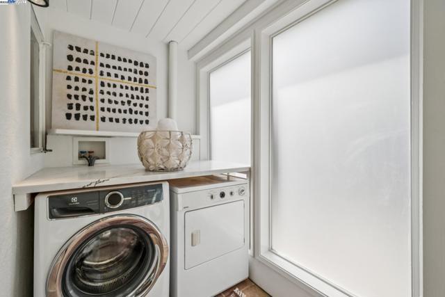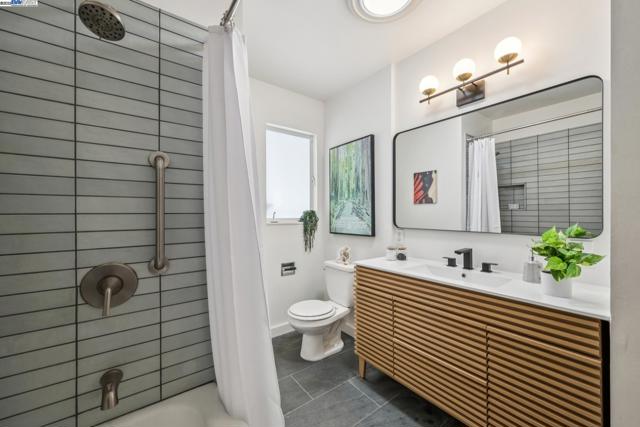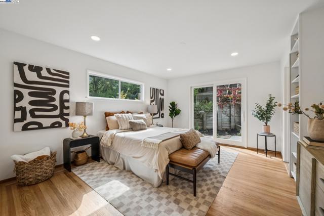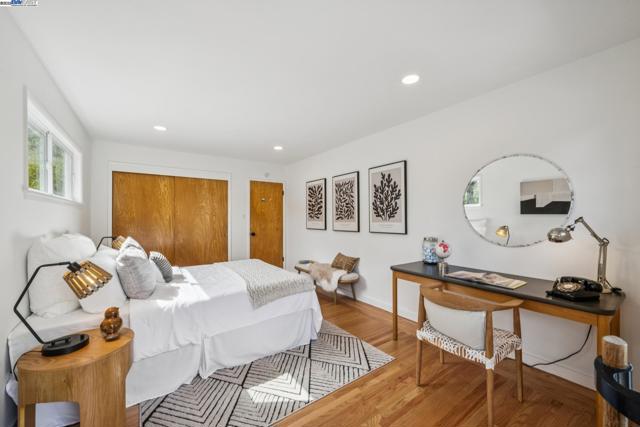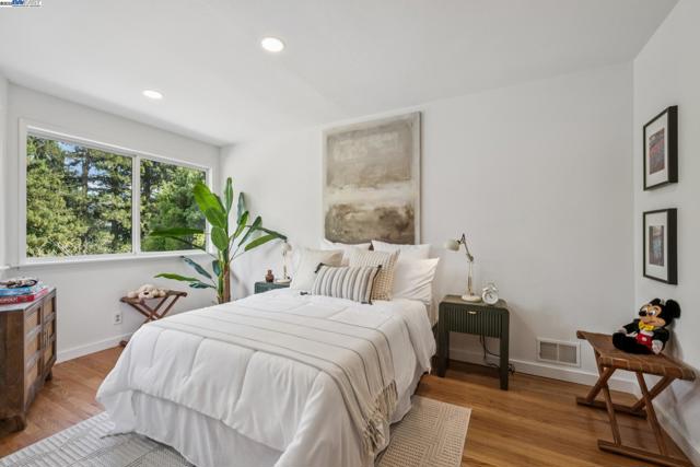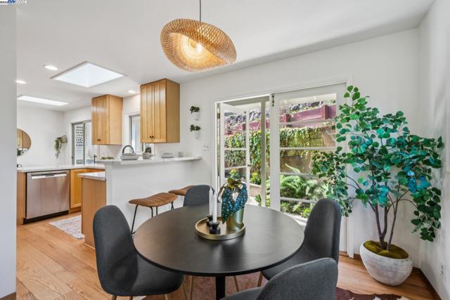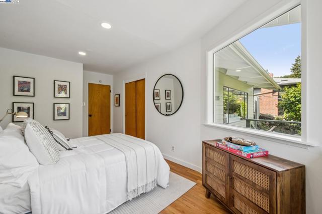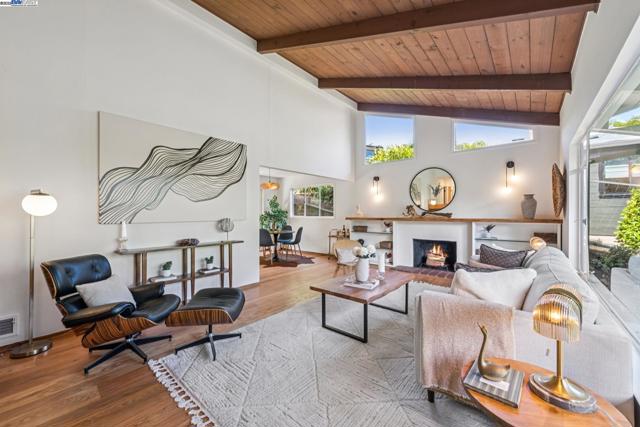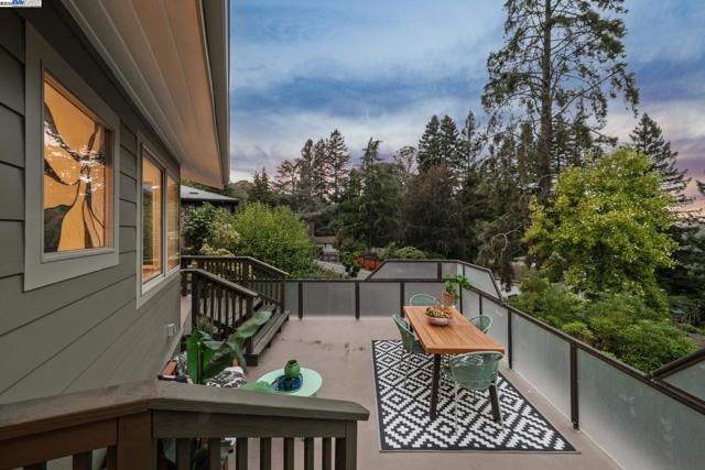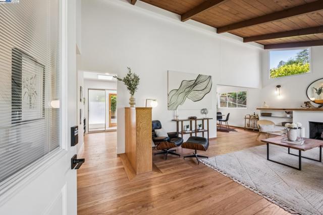Live in a peaceful paradise in this upgraded 3BD/2BA Mid-Century home in Berkeley’s historic Park Hills neighborhood. Designed to enjoy nearby Tilden Park’s natural beauty, this 1,473 SQFT home overlooks gorgeous vistas, with a front deck and back patio for indoor/outdoor living, and a nearby neighborhood trail directly to the park. The sunny living room awes with a vaulted redwood ceiling, a picture window with treeline view, and a fireplace with built-in bookcases. Hardwood floors span into the dining room featuring French doors to the backyard. Dine al fresco on the patio, or garden to your heart’s content in the extensive terraced raised beds. With two skylights, windows, and backyard access through a laundry area, the kitchen also feels part of the outdoors while offering modern upgrades in appliances, countertops, and recessed lighting. The sleeping wing is tucked away where two bedrooms with roomy closets share a stylish full bath, and one of the bedrooms enjoys doors to the deck. The primary bedroom features an ensuite bath and glass doors to the backyard. A 2-car garage provides off street parking. Out your front door, Berkeley’s world-class amenities and Tilden is a playground for all ages with golfing, swimming, a botanical garden, trails, and so much more!
