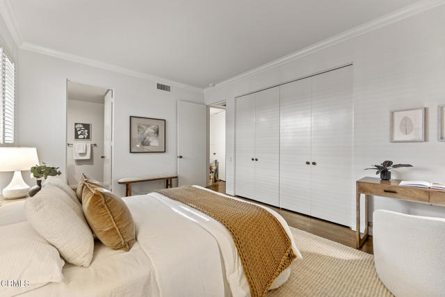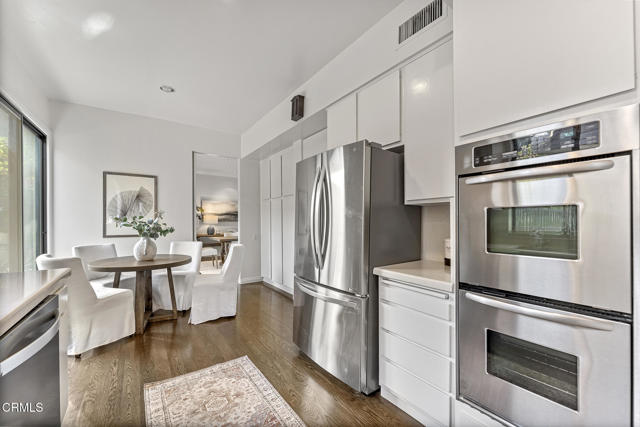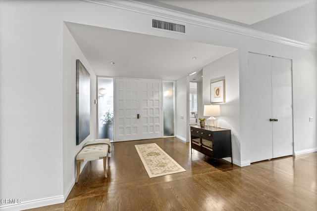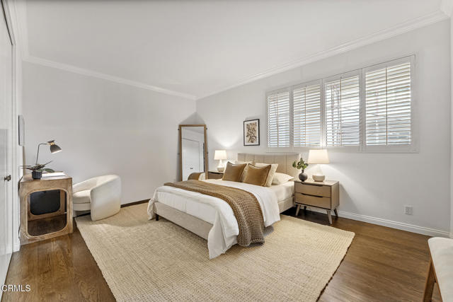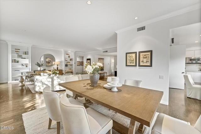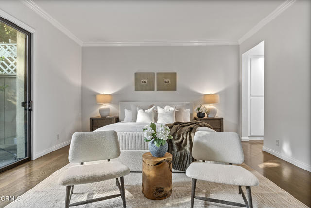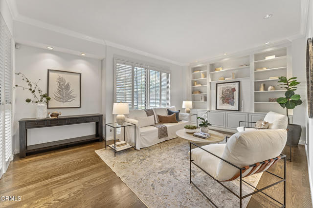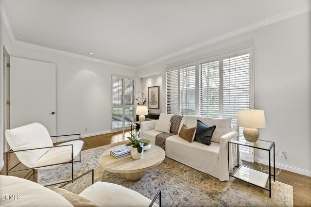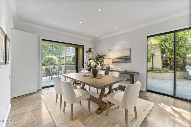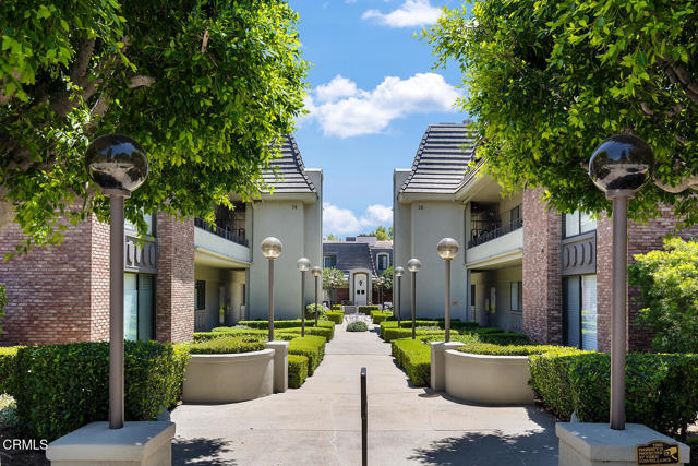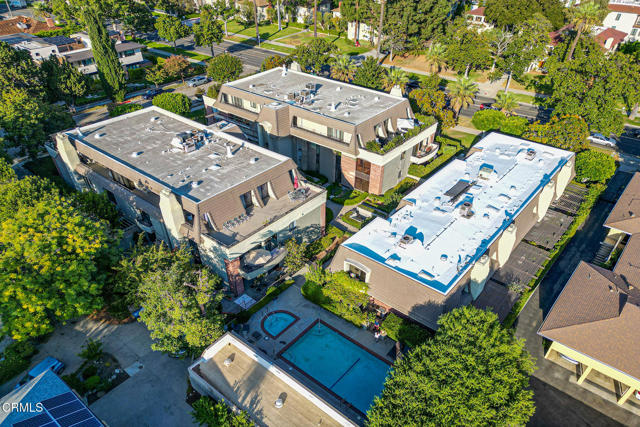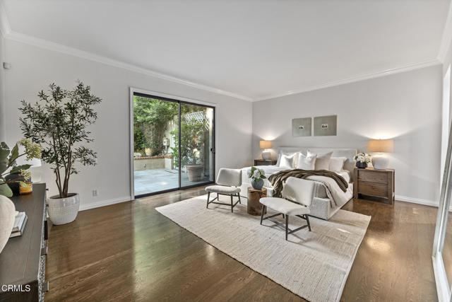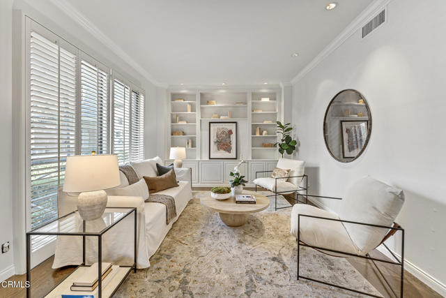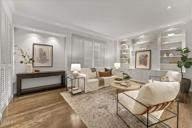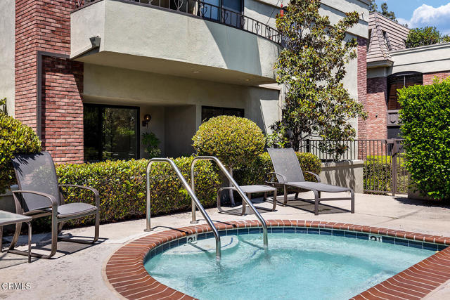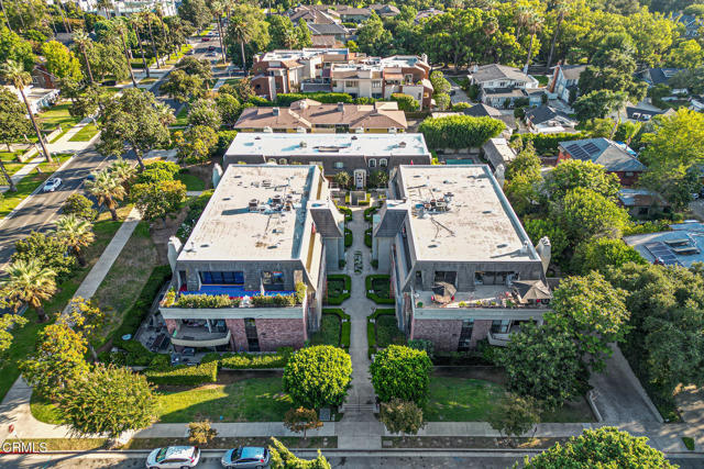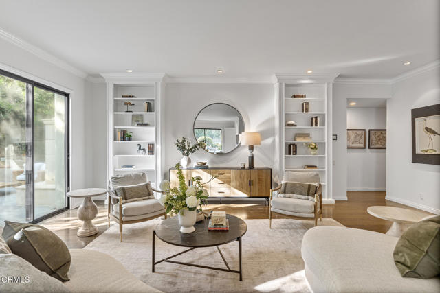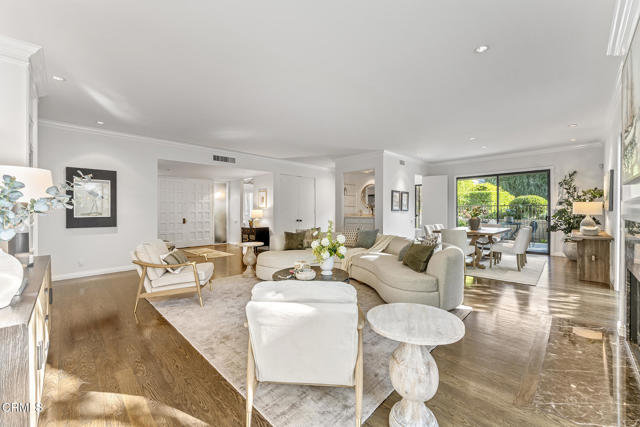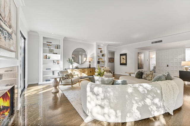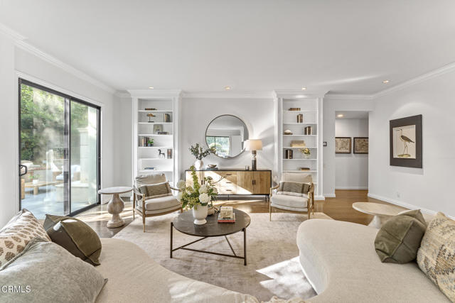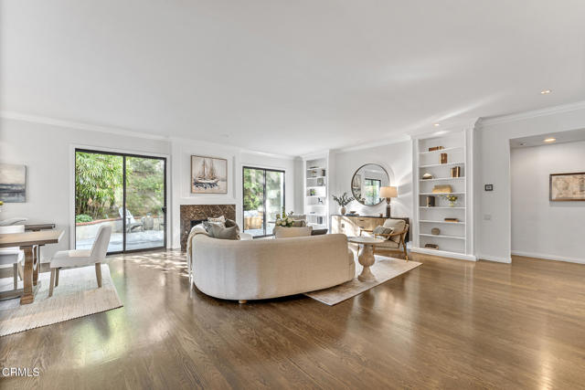 Situated in one of the most sought-after condominium communities along Pasadena's prestigious Millionaires' Row, this ground-floor residence is one of only 14 units in the complex. The home features soaring ceilings, an open floor plan, and expansive sliding glass doors that seamlessly connect the interior to an impressive wraparound patio of over 1,000 square feet. Designed for both relaxation and entertaining, the patio is enhanced with stone pavers, a lush green backdrop, abundant seating areas, and an outdoor fireplace, creating a private retreat ideal for entertaining or quiet relaxation. Inside, the spacious layout offers two generous bedroom suites plus a versatile den with custom floor-to-ceiling built-in shelves and cabinetry, perfect as a study, library, or optional third bedroom. Thoughtful details include hardwood floors, crown molding, plantation shutters, a living room fireplace, and extensive built-in bookshelves. Community amenities include a sparkling pool and spa conveniently located near the unit. Additional highlights are a gated garage with elevator access, assigned side-by-side parking, a large private storage closet in the garage, an exterior utility closet on the patio, and an in-unit laundry room. HOA fees include trash, common area maintenance, pool and spa, roof, water, and earthquake insurance.