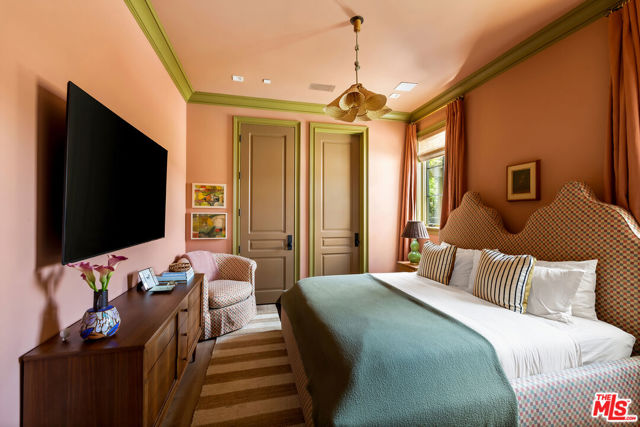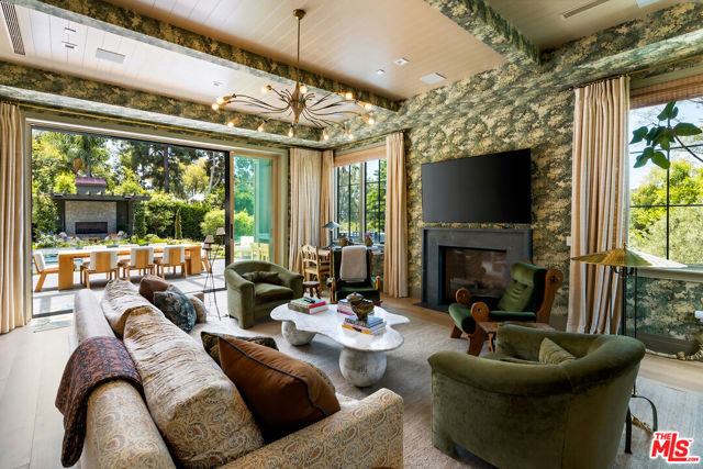 Perfectly situated in the coveted Pacific Palisades Riviera and set behind gates amidst lush and spectacular landscaping is this remarkable estate. The flawlessly executed interiors created by the renowned interior design firm Pierce and Ward, along with the home being a newly built Ken Ungar estate, make this home truly-one-of-a-kind. Every inch of the home, inside and outside, has been transformed to capture the striking canyon views and beams of light glowing through soaring windows and doors from sunrise to sunset at carefully designed vistas throughout the day. Enter through a stunning glass door to ultra-inviting living and dining rooms designed for daily enjoyment, with lavish yet welcoming interiors that appeal to all, featuring a London-chic flair mixed with mid-century design that will surely rival the best home designs executed in all of Los Angeles. The super-inviting family kitchen, with double banquet nooks you won't want to leave all day, offers counter seating, a top-of-the-line Wolf range, multiple ovens, double sinks, and wall-to-wall refrigeration, all opening to a large, stunning family room reminiscent of a chic boutique hotel. This space seamlessly transitions to a large outdoor dining table and chef's barbecue area, ideal for cooking and entertaining guests, all with stunning canyon views. The first floor also features a tucked-away office and a spacious downstairs suite, all carefully laid out with the architect's clear understanding of a masterful floor plan. The second floor boasts a primary suite tucked in its own wing, with dual doors, a fireplace, two walk-in closets: one on each end, a luxurious bath suite, for two, with an oversized double shower, soaking tub, two water closets, separate sink areas, and make-up seating for her, all with beautiful views of the meticulously landscaped grounds and a balcony completing this truly intimate and cozy suite. Across the landing, the second floor also offers a cozy upstairs family room set between three suites, each designed with extraordinary interiors and beautiful tree-top views. An elevator services all three floors, including the lower level, which features the single most inviting screening room, clearly designed for family and friends' movie nights. The lower floor also boasts a large open family room/pool and game room, a stunning bar area, and a wine room, all opening to a cozy patio with plenty of room to enjoy a cold plunge after Pilates in the custom-designed double studio suite and sauna. Down the hall, there is a jaw-dropping four-bed bunk room suite, perfect for late-night sleepovers or additional holiday guests. To complete this lush estate, there is an infinity-edge pool, oversized Baja shelves and spa, a built-in trellis with a fireplace, and a lower-level multiple seating area for guests, parties, and late-night conversations in this award-worthy landscape design encasing the entire estate. Simply exquisite and clearly one of Pierce and Ward's finest design and landscape visions.