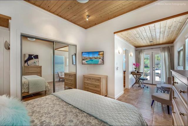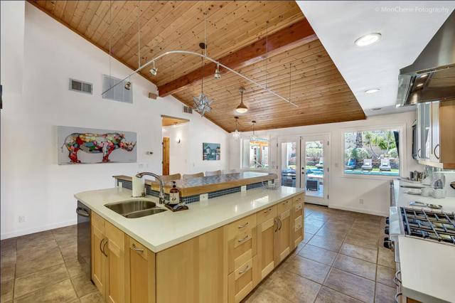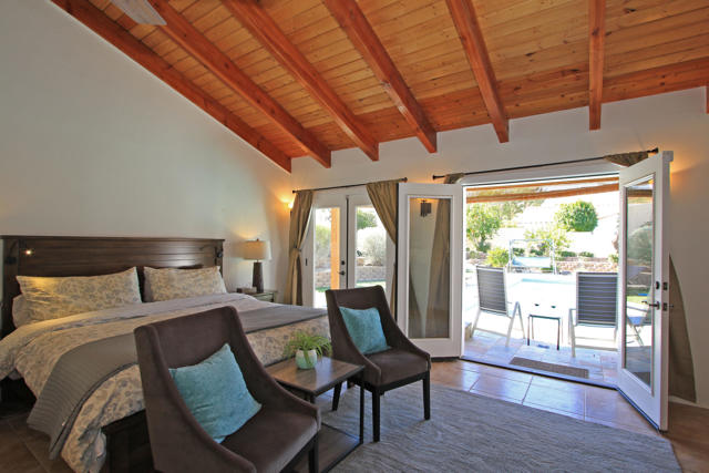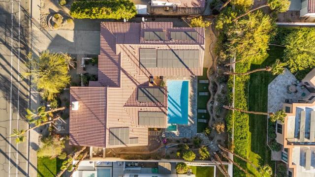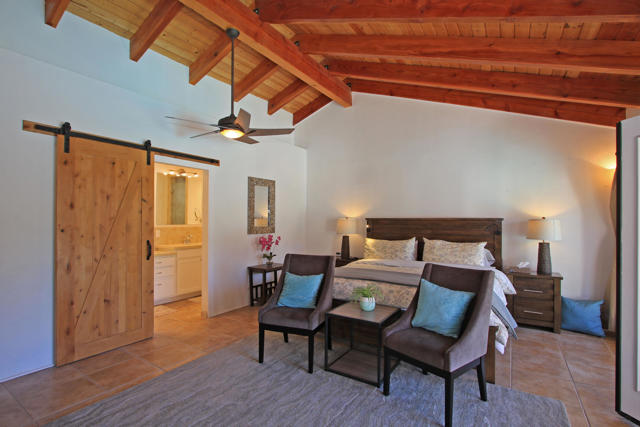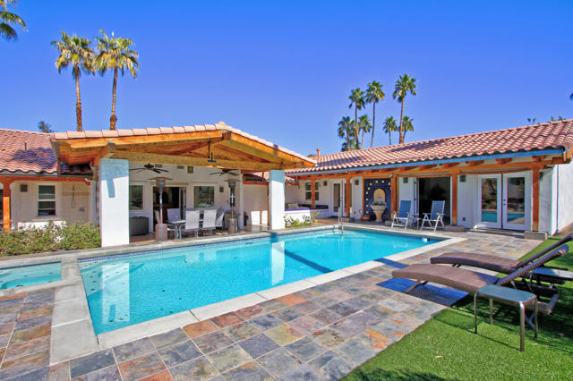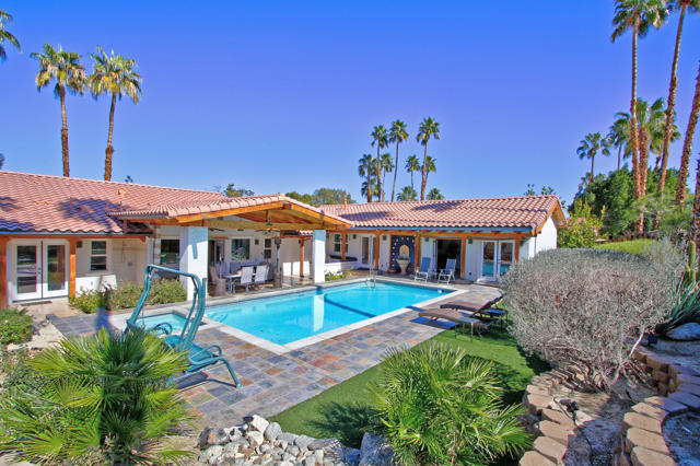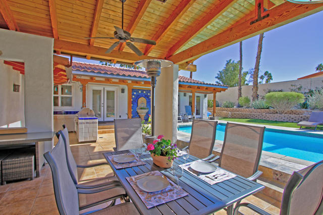 This house has everything you need to relax, entertain and to make it home. Here in the heart of South Palm Desert rests a rustic Southwestern Ranch style home - a generous 2900 square foot retreat on 11,760 square feet of land. It is just minutes away from El Paseo Drive with its many high-end shops and restaurants. This 5BR 4BA home is turn-key furnished. You will love the light interior, featuring exposed beams and wood-planked ceilings throughout most of the home. The heart of the home is the sunny kitchen with its soaring ceilings. There is a casual eating area plus an eat-in bar. Adjacent spaces include a formal dining room for hosting your dinner parties with access to the front yard patio, and the living room with a fireplace which provides a comfortable and warm area to entertain or just to relax. The home is presently has five bedrooms including a large very private master ensuite bedroom which opens directly onto the back patio and pool. There are two additional ensuite bedrooms and two additional smaller rooms that are configured as bedrooms. The large laundry room is centrally located for convenience.The backyard provides a wonderful gathering spot, featuring a pool/spa, outdoor shower, covered patio, with an outdoor kitchen and dining area. Lush landscaping frames the pool with the remaining property landscaped in low-maintenance desert-scape. An oversized two car garage provides loads of storage.