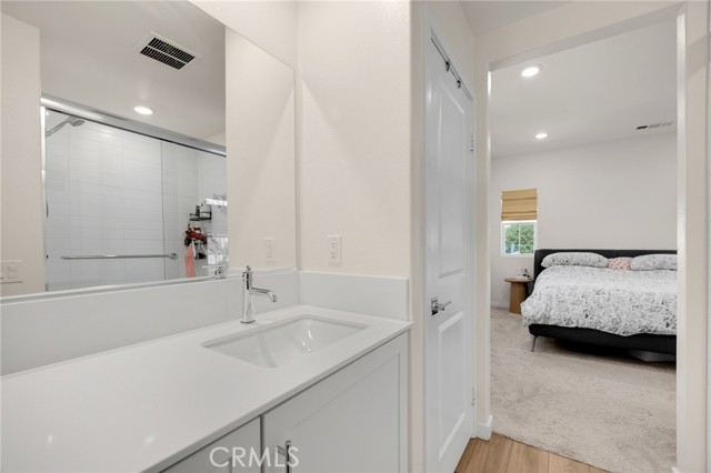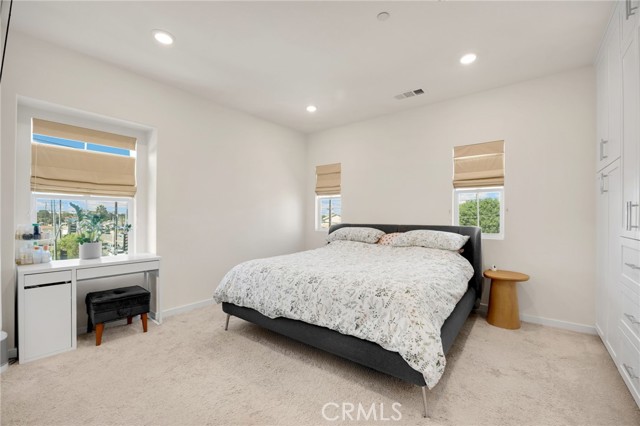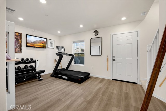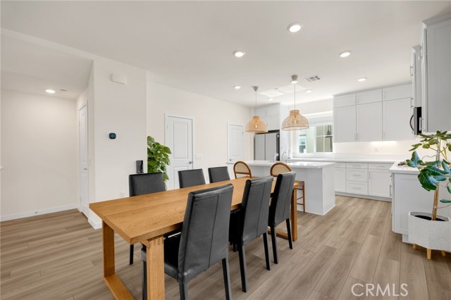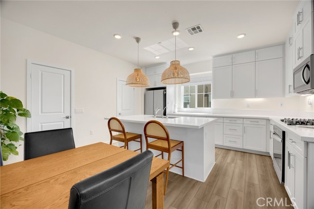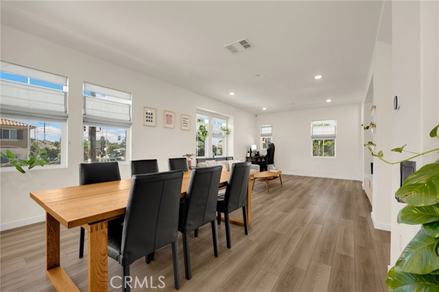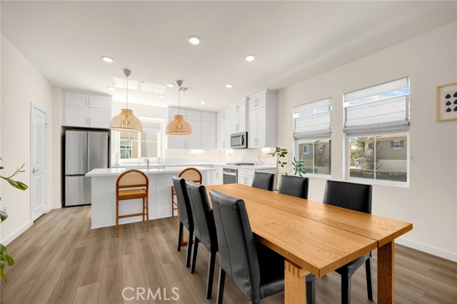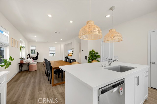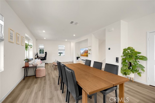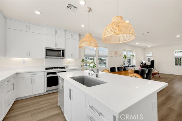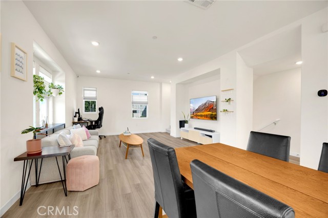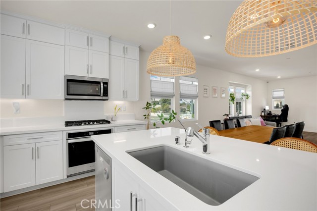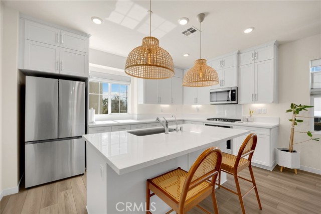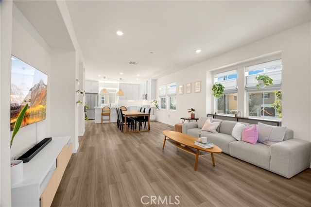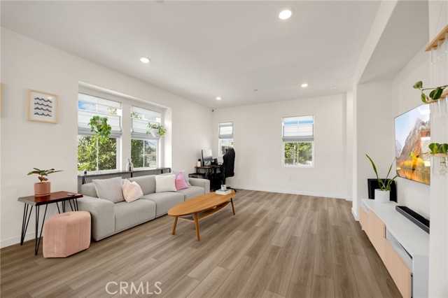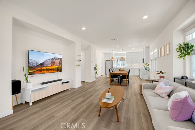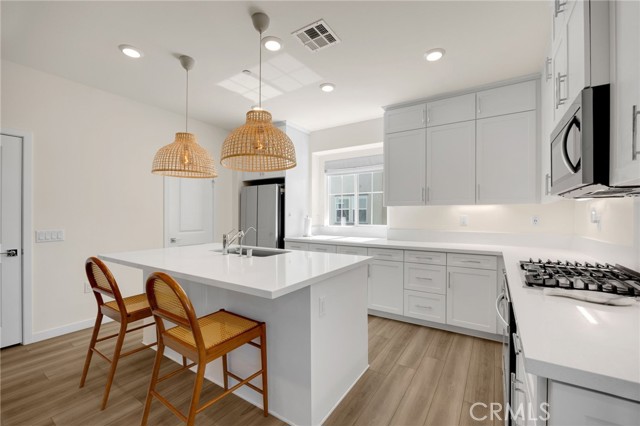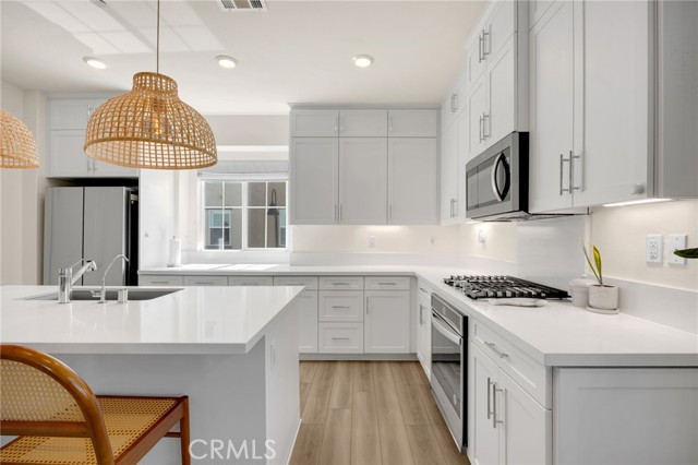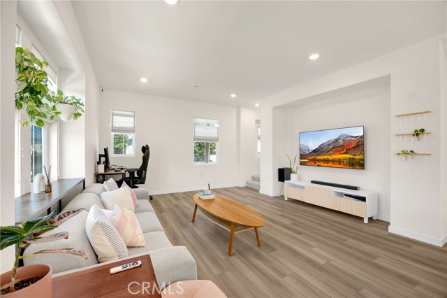 Discover elevated living in this stunning 3-story energy-efficient home, perfectly positioned as a desirable end unit for added privacy and exceptional natural light. Nestled within a gated community, this residence offers enhanced security and a tranquil lifestyle. The inviting front porch leads to a rear-facing 2-car garage and a versatile lower-level den with generous storage. The second floor showcases a spacious great room and a uniquely upgraded chef’s kitchen—exclusive to this home—featuring a stunning stone center island, walk-in pantry, Whirlpool stainless steel appliances, soft-close drawers, stacked upper cabinets, under-cabinet lighting, and sleek modern finishes. Upstairs, enjoy three bedrooms, two full baths, and a convenient laundry area. The luxurious primary suite includes a frameless glass shower, dual vanity, and a full-wall custom closet system. Smart home features include lien-free solar panels, Wi-Fi-enabled thermostat and oven, tankless water heater, and EV charging conduit. With easy access to major freeways, top employers, parks, shopping, and dining, this home blends comfort, style, and convenience in one exceptional offering.