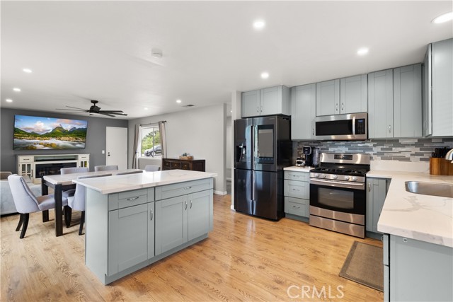 Discover this beautifully updated 3-bedroom, 2-bathroom, 1,553 sq. ft. single-story home, perfectly situated on an expansive 10,685 sq. ft. corner lot with RV parking. Designed for effortless living, this home features no steps inside - ideal for accessibility, comfort, and multigenerational living. Through the double front doors is a warm and inviting living room, anchored by a cozy fireplace perfect for cozy evenings or hosting guests. To the right, the bright family room flows seamlessly into the fully remodeled kitchen, boasting sleek quartz countertops, modern shaker cabinets, and stainless steel appliances. There are two convenient sliders opening to the backyard, blending indoor and outdoor living, in both the kitchen and living room. Down the hall, two generously sized bedrooms share a well appointed full bathroom. The private primary suite is a true retreat, featuring a spacious walk-in closet and a modern ensuite bathroom all with a touch of serenity. Outside, the massive backyard offers endless possibilities, complete with RV parking, a storage shed, and a unique aviary (birds not included). With luxury vinyl plank (LVP) flooring throughout, fresh updates, and a thoughtful single-level design, this home is move-in ready and waiting for you to make it your own.