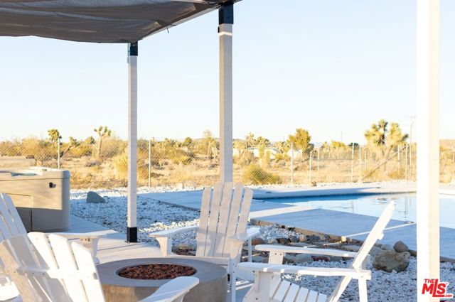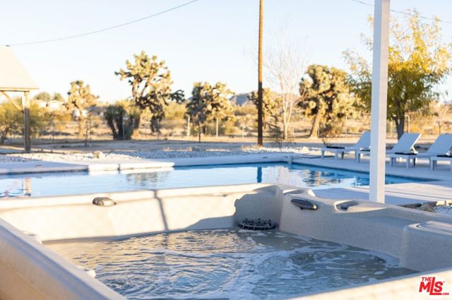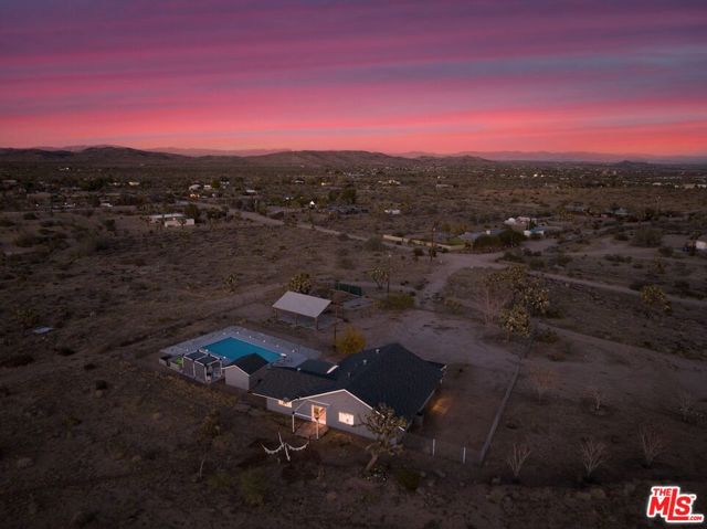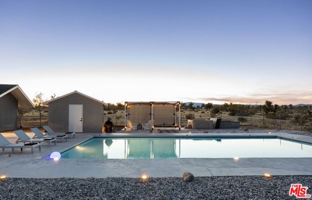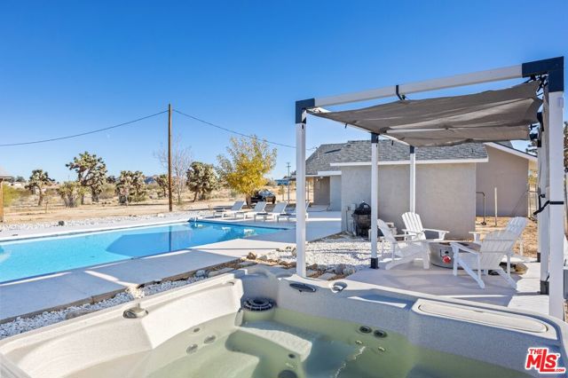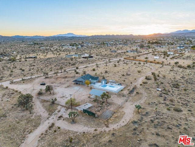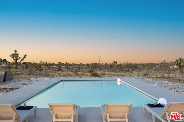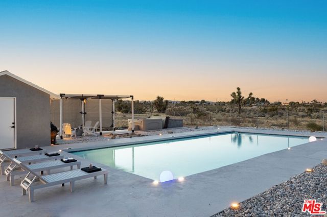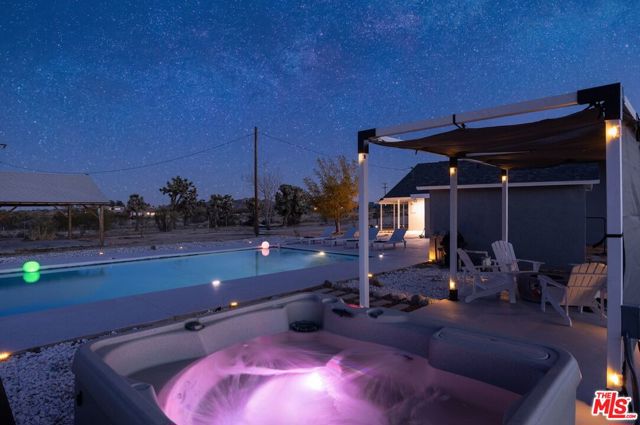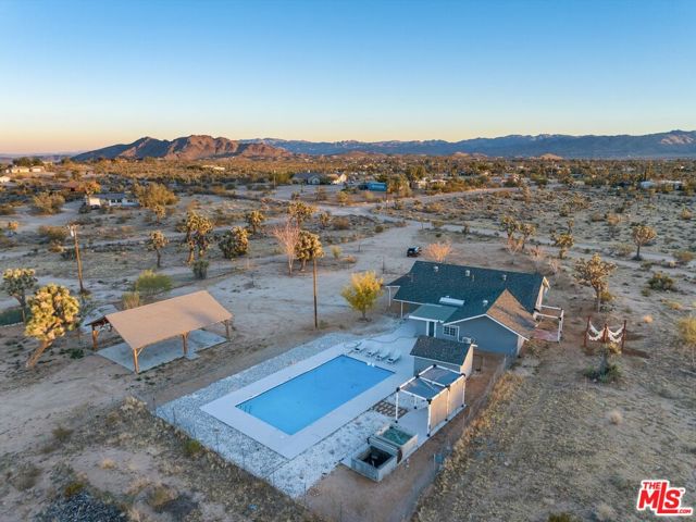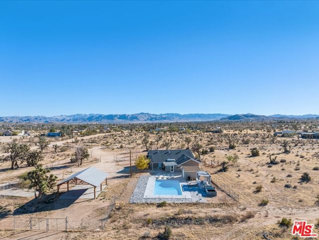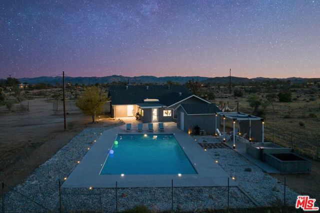 Generating $80,000 in annual gross income, this fully furnished, turnkey 5-bedroom, retreat delivers exceptional short-term rental performance and high-desert luxury. Set on five private acres in Yucca Mesa, the 2,040 sq ft home has been fully remodeled with designer finishes, including luxury vinyl plank flooring, recessed lighting, and a modern kitchen with a new cooktop, Samsung Bespoke refrigerator, shaker cabinetry, and butler's pantry. The open-concept layout is bright and spacious, ideal for entertaining. The primary suite features a spa-inspired en-suite bath, while a fifth bedroom in the pool house offers a private entrance for guests or rental flexibility. Outdoors, enjoy a resort-style setting with an Olympic-sized pool, hot tub, firepit, hammocks, and a custom Linx patio cover, all surrounded by sweeping desert and mountain views. Additional features include RV hookups, 220V carport, a storage unit, and a custom enclosed area suitable for events or parking. With HV/RL zoning, and room to expand, this property offers both immediate cash flow and long-term growth potential just minutes from Joshua Tree National Park and Pioneertown.