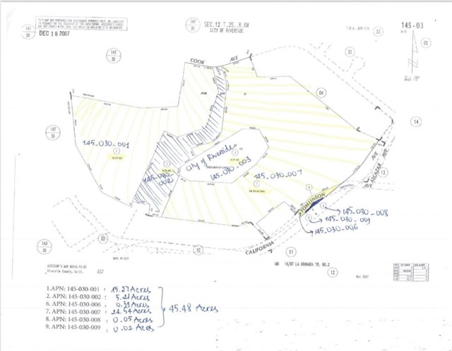 Exceptional development opportunity in the rapidly growing city of Riverside. This ±45.48-acre property offers frontage on both Cook Street and California Avenue with convenient access and nearby utilities, including public sewer, water, electricity, and gas. The mostly flat to gently sloping terrain rises to a scenic hilltop with panoramic city lights, hills, and mountain views — ideal for a future residential subdivision or custom hillside estates. Just one mile from the Galleria at Tyler Mall, AMC Theatres, and minutes to the 91 Freeway, this rare infill land consists of six contiguous parcels surrounded by established neighborhoods, parks, schools, and shopping centers. With strong residential growth across the Inland Empire, this property presents an outstanding investment opportunity in Riverside’s desirable suburban core.