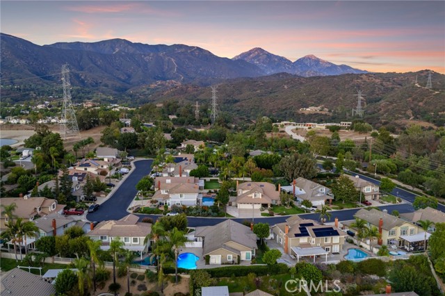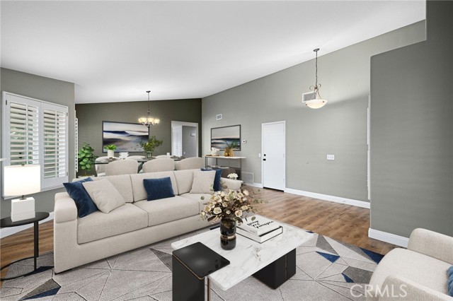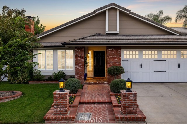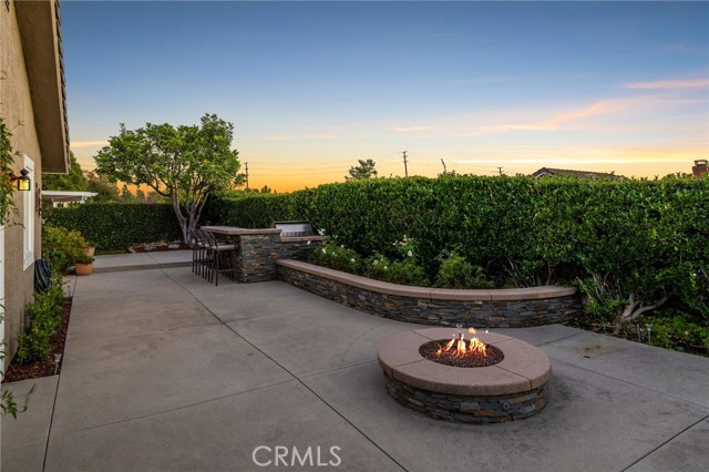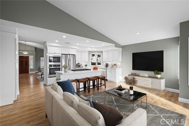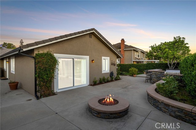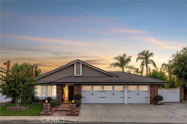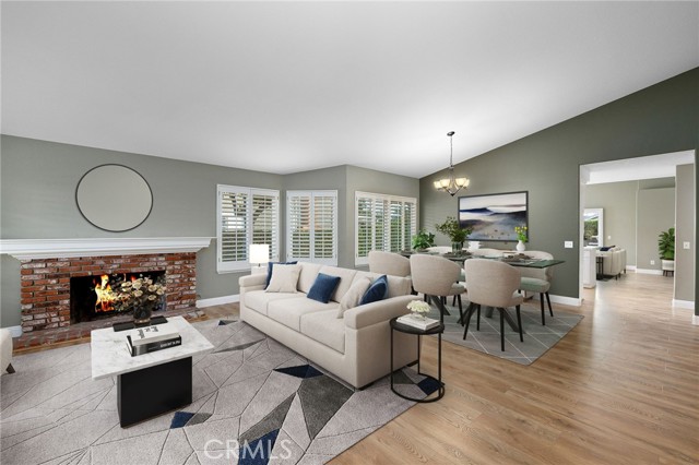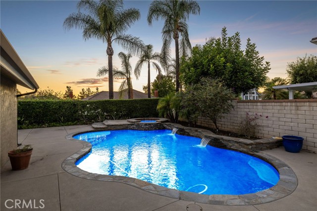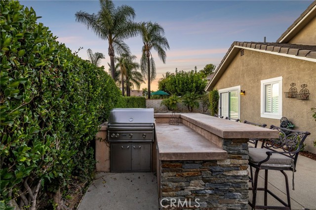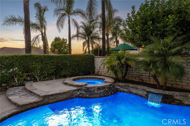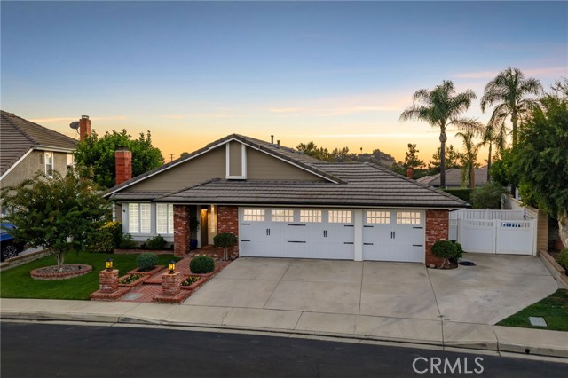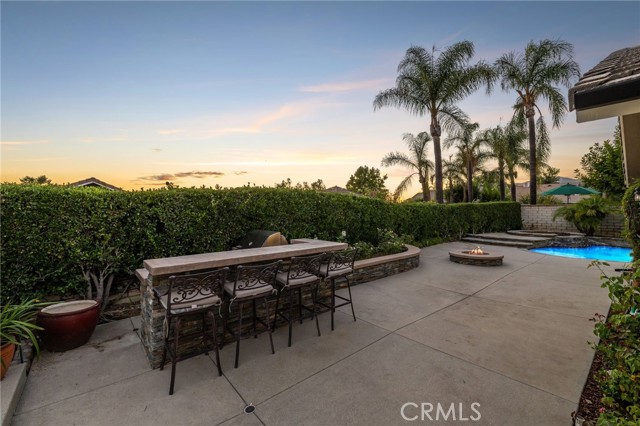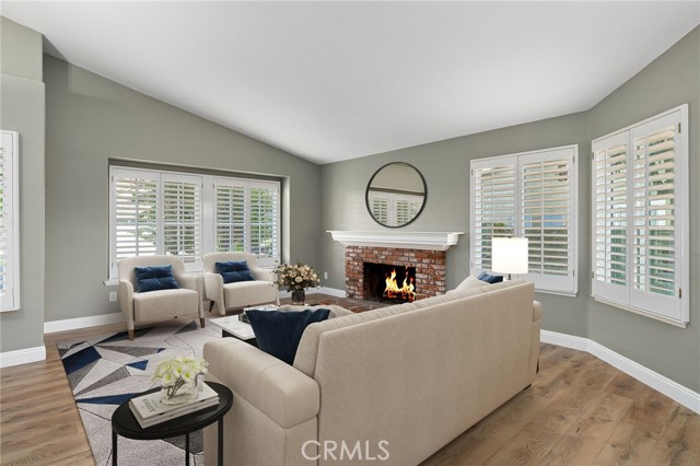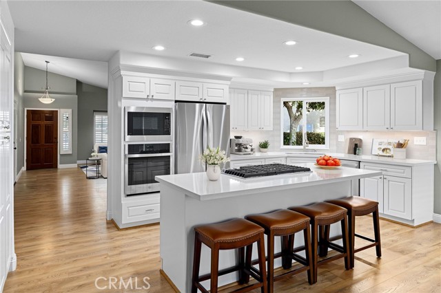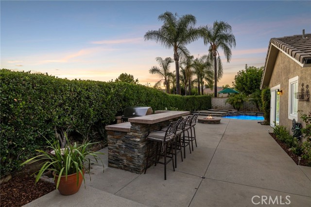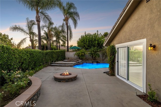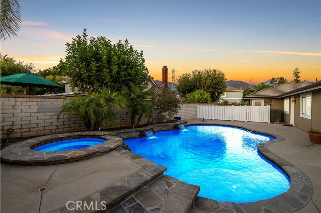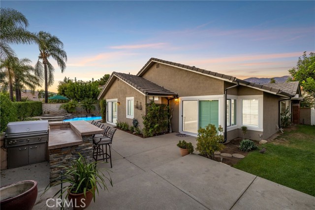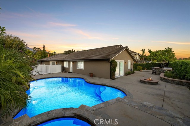 Stunning single-story pool home, completely remodeled, in the gated Emerald Ridge at Live Oak community. The front yard is meticulously landscaped with lawn and manicured planters, carriage-style garage doors, and a herringbone brick walkway leading to a covered front porch. Inside, the living room anchors an open layout and features light oak-style LVP flooring, high vaulted ceilings, plantation-shuttered windows facing the front yard, and a brick fireplace with a white mantel. An adjacent dining room includes a chandelier and its own shuttered window overlooking the side yard. The remodeled kitchen offers white cabinetry, quartz countertops, a full tiled backsplash, recessed lighting, and a center island with countertop seating; GE Profile appliances include a convection oven, microwave, 36" gas cooktop, dishwasher, and refrigerator. The kitchen opens to the family room, which has vaulted ceilings, windows, and a shuttered sliding door to the backyard. A hallway with ample storage leads to the primary bedroom with vaulted ceilings, a ceiling fan, a walk-in closet, and a slider that frames the backyard and provides easy access. The primary bath features new cabinetry with quartz countertops, dual sinks, a walk-in shower, and a separate tub. Two additional bedrooms offer vaulted ceilings, shuttered windows, and spacious closets, served by a remodeled hall bath. A dedicated laundry room provides storage and a door to the side yard. The attached three-car garage includes extensive built-ins and rafter storage. The backyard showcases a pebble-finish pool and spa with a stepped-stone spillway and stone coping, a built-in barbecue with counter seating, stacked-stone accents that carry into raised planters, a fire pit, perimeter privacy hedges, mature trees, and a grass area. A wrought-iron rear fence affords neighborhood and hillside views with light trimming. Additional upgrades include: dual paned windows and sliding doors, new garage doors, and ducting throughout. Remodeled single-story homes in this community are rare, don’t let this one pass you by.