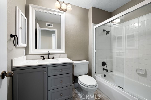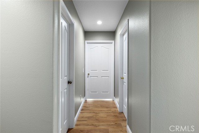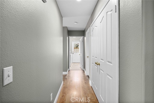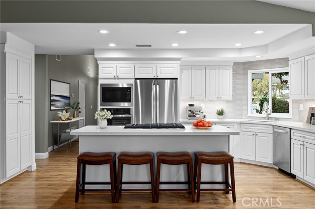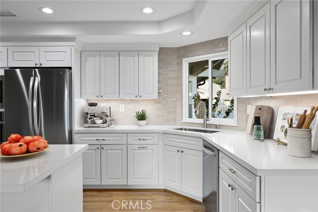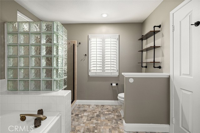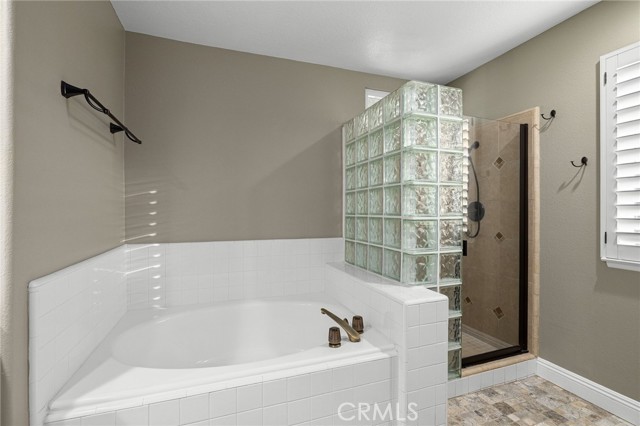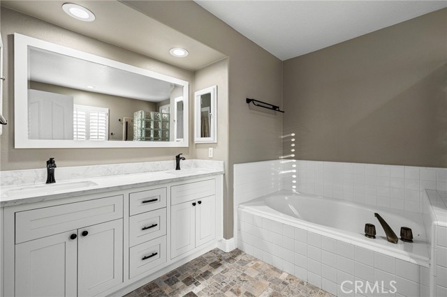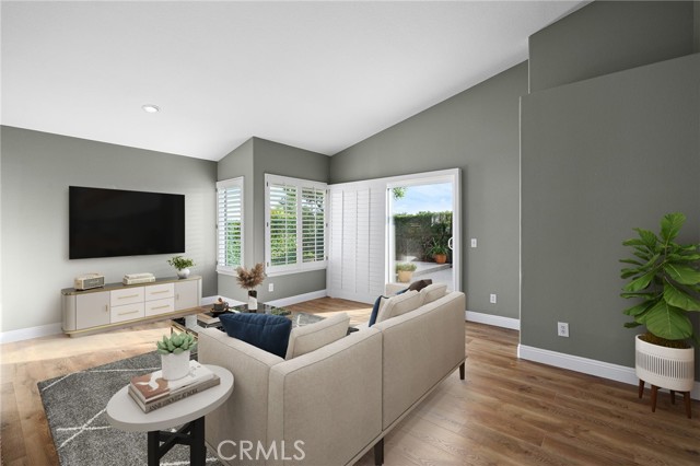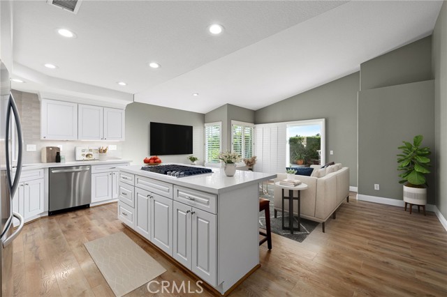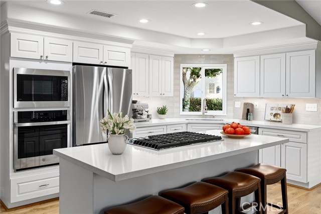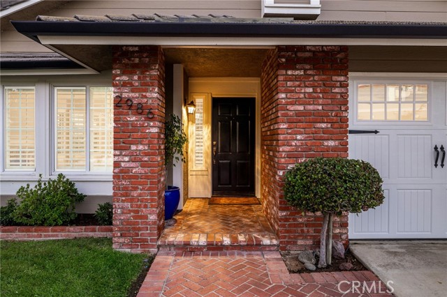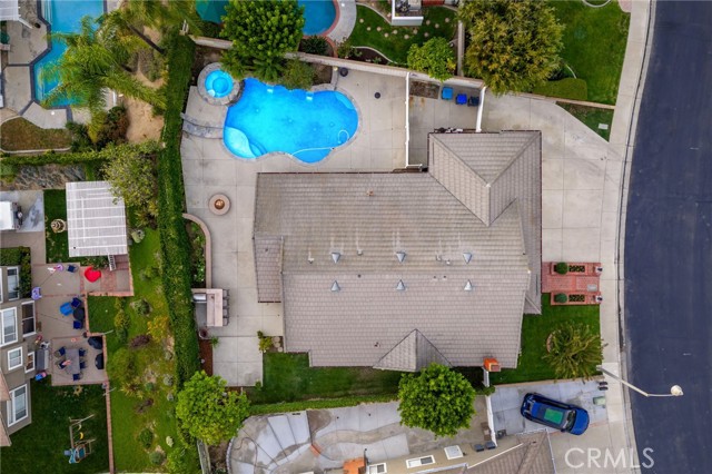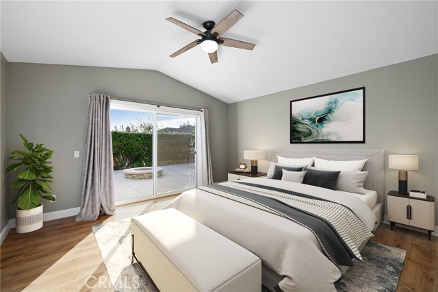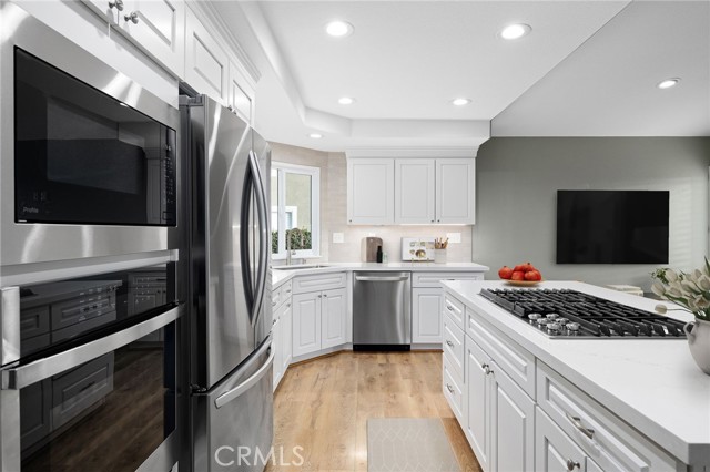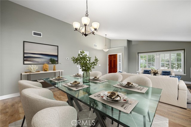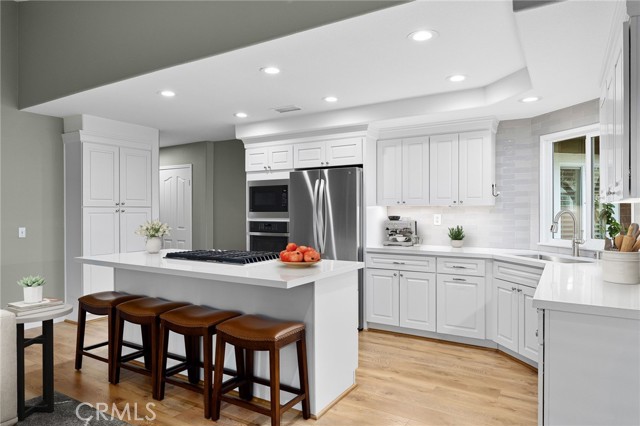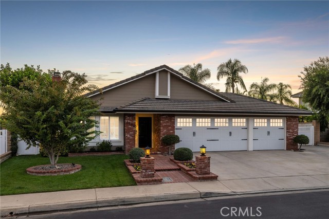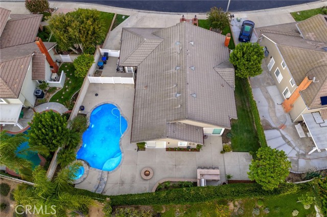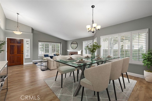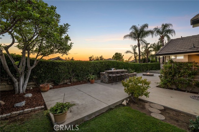 Stunning single-story pool home, completely remodeled, in the gated Emerald Ridge at Live Oak community. The front yard is meticulously landscaped with lawn and manicured planters, carriage-style garage doors, and a herringbone brick walkway leading to a covered front porch. Inside, the living room anchors an open layout and features light oak-style LVP flooring, high vaulted ceilings, plantation-shuttered windows facing the front yard, and a brick fireplace with a white mantel. An adjacent dining room includes a chandelier and its own shuttered window overlooking the side yard. The remodeled kitchen offers white cabinetry, quartz countertops, a full tiled backsplash, recessed lighting, and a center island with countertop seating; GE Profile appliances include a convection oven, microwave, 36" gas cooktop, dishwasher, and refrigerator. The kitchen opens to the family room, which has vaulted ceilings, windows, and a shuttered sliding door to the backyard. A hallway with ample storage leads to the primary bedroom with vaulted ceilings, a ceiling fan, a walk-in closet, and a slider that frames the backyard and provides easy access. The primary bath features new cabinetry with quartz countertops, dual sinks, a walk-in shower, and a separate tub. Two additional bedrooms offer vaulted ceilings, shuttered windows, and spacious closets, served by a remodeled hall bath. A dedicated laundry room provides storage and a door to the side yard. The attached three-car garage includes extensive built-ins and rafter storage. The backyard showcases a pebble-finish pool and spa with a stepped-stone spillway and stone coping, a built-in barbecue with counter seating, stacked-stone accents that carry into raised planters, a fire pit, perimeter privacy hedges, mature trees, and a grass area. A wrought-iron rear fence affords neighborhood and hillside views with light trimming. Additional upgrades include: dual paned windows and sliding doors, new garage doors, and ducting throughout. Remodeled single-story homes in this community are rare, don’t let this one pass you by.
