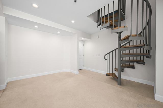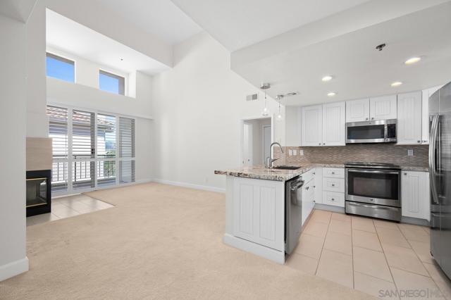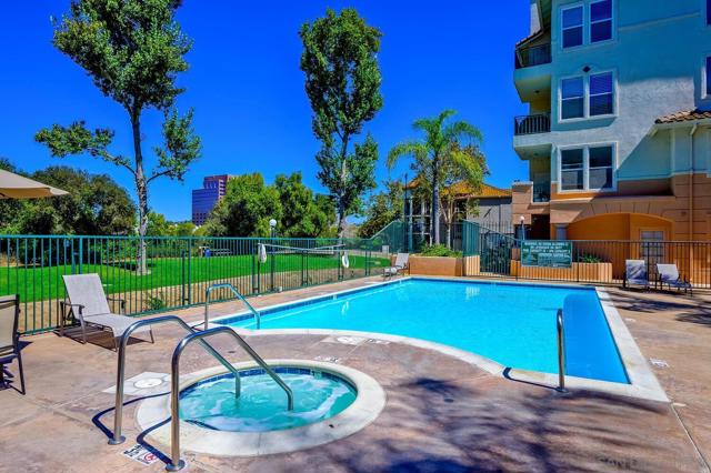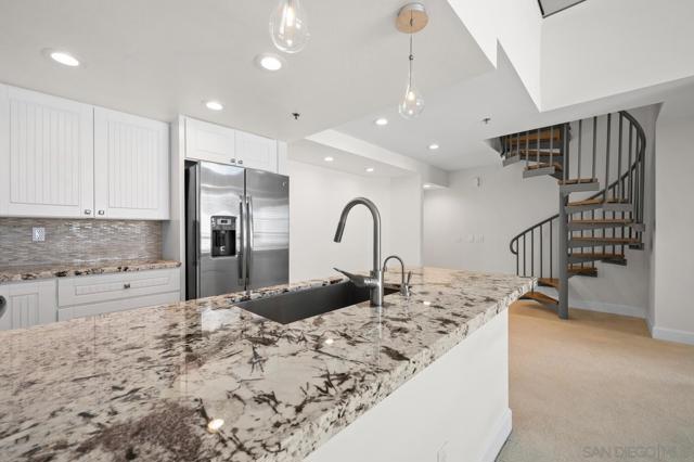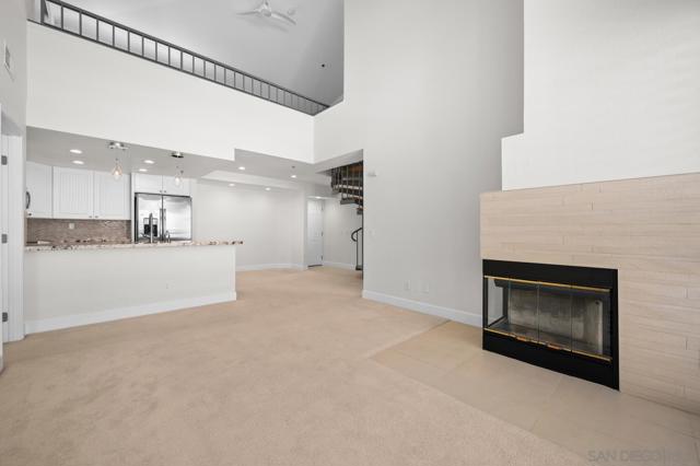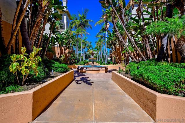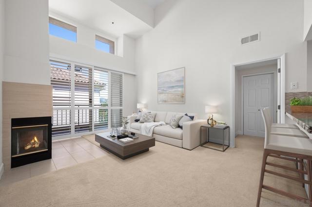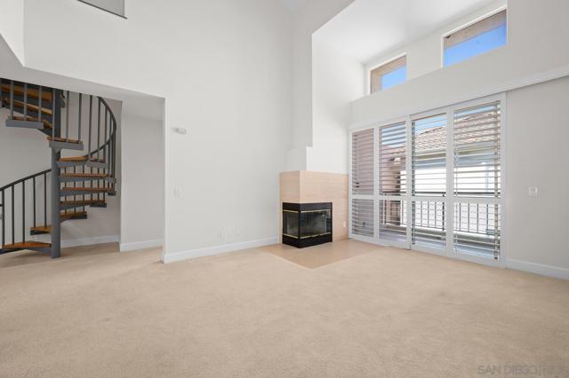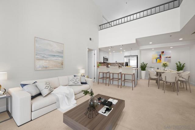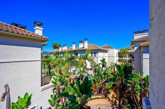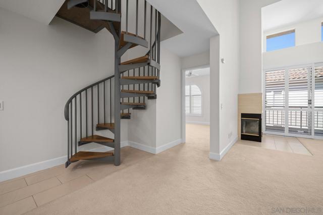 Experience elevated living in the heart of Mission Valley in this stunning top-floor end-unit condominium. With only one shared wall, enjoy exceptional peace and quiet along with soaring vaulted ceilings and a private balcony that create an open and airy atmosphere with tranquil views of the community's inner courtyard. The thoughtfully designed split floor plan features spacious primary and secondary suites on opposite sides of the home, separated by open-concept living areas for maximum privacy. A dramatic spiral staircase leads to a spacious loft, providing the perfect flexible space for a home office, yoga studio, or play area. After a day of work or play, unwind by the sparkling community swimming pool and hot tub, or energize with a workout using the newly upgraded gym equipment. This desirable 2-bedroom, 2-bathroom residence includes in-unit Miele laundry and two dedicated parking spaces in a secure gated garage. Enjoy a beautiful river pathway just behind the building, with grocery stores, retail, coffee shops, restaurants, and bus stops across the street. Fashion Valley and Mission Valley malls and the San Diego Trolley are also just minutes away. This home offers the perfect blend of sophisticated design, natural beauty, and unparalleled central convenience. Some Photos have been virtually staged.