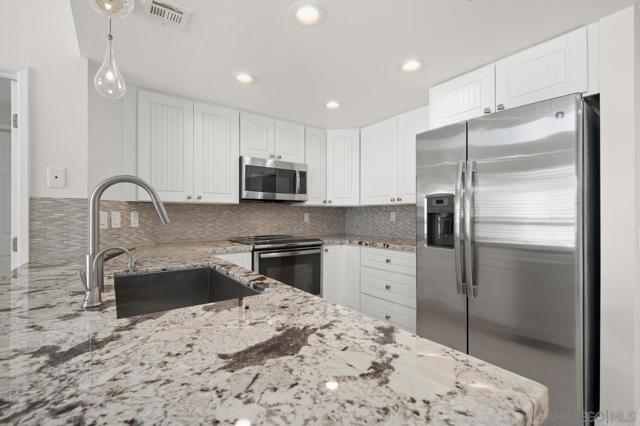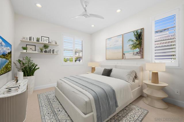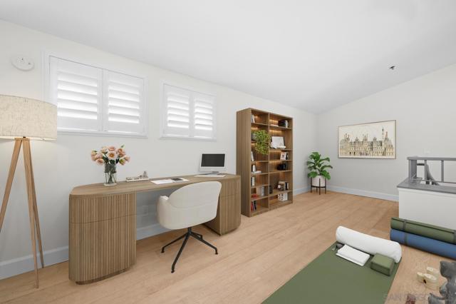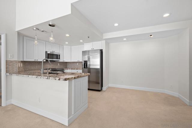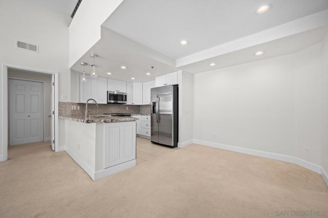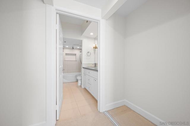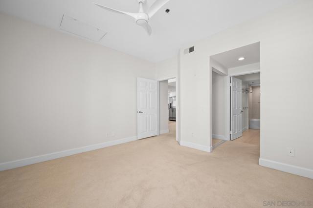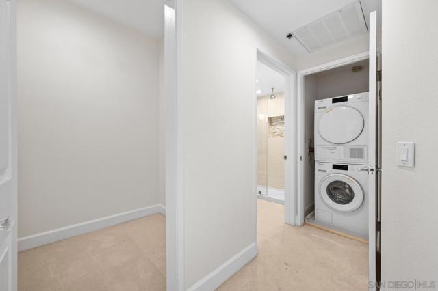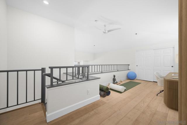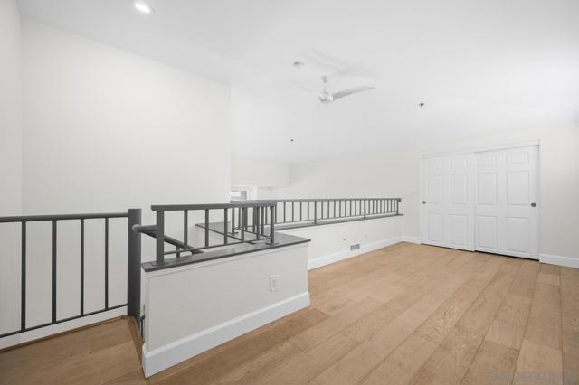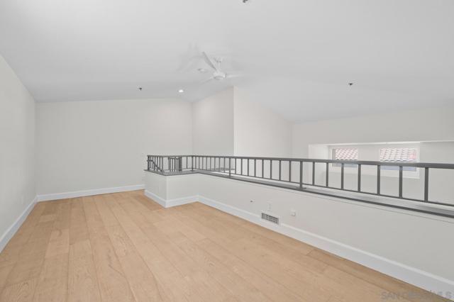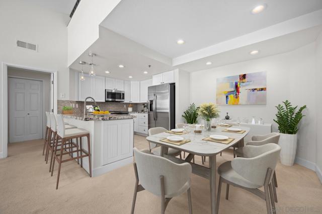 Experience elevated living in the heart of Mission Valley in this stunning top-floor end-unit condominium. With only one shared wall, enjoy exceptional peace and quiet along with soaring vaulted ceilings and a private balcony that create an open and airy atmosphere with tranquil views of the community's inner courtyard. The thoughtfully designed split floor plan features spacious primary and secondary suites on opposite sides of the home, separated by open-concept living areas for maximum privacy. A dramatic spiral staircase leads to a spacious loft, providing the perfect flexible space for a home office, yoga studio, or play area. After a day of work or play, unwind by the sparkling community swimming pool and hot tub, or energize with a workout using the newly upgraded gym equipment. This desirable 2-bedroom, 2-bathroom residence includes in-unit Miele laundry and two dedicated parking spaces in a secure gated garage. Enjoy a beautiful river pathway just behind the building, with grocery stores, retail, coffee shops, restaurants, and bus stops across the street. Fashion Valley and Mission Valley malls and the San Diego Trolley are also just minutes away. This home offers the perfect blend of sophisticated design, natural beauty, and unparalleled central convenience. Some Photos have been virtually staged.