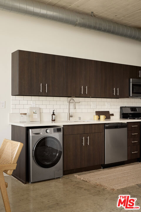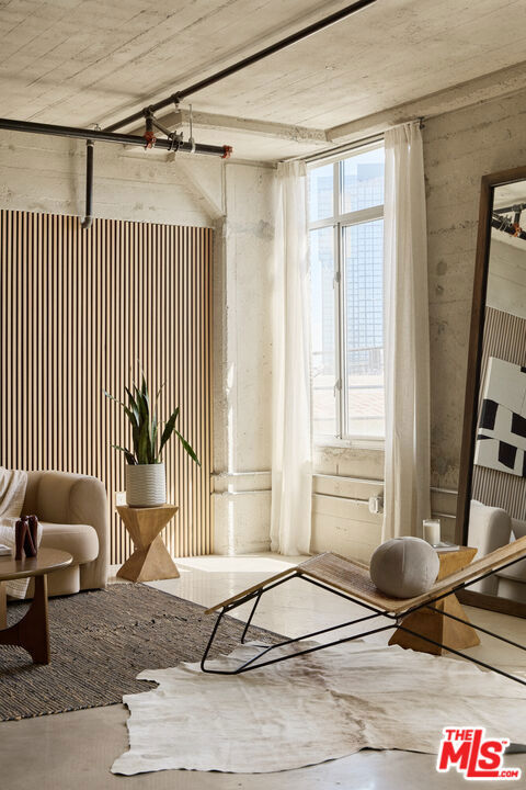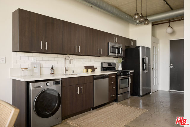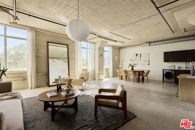 Welcome to the Beacon Lofts, a sought-after Arts District retreat where industrial character meets contemporary comfort. This spacious 1,031 sq. ft. residence boasts soaring ceilings, exposed concrete walls and floors, tall south-facing windows, and an open and airy layout. The full kitchen comes equipped with a dishwasher, range, microwave, and a brand-new combination washer/dryer for everyday convenience. The bathroom features a tub/shower combo, adding both function and comfort to the space. Residents enjoy an array of building amenities, including a rooftop communal hot tub, outdoor kitchen and BBQ area with breathtaking city views, a newly installed dog run, and secure parking with one deeded space in the attached lot. HOA dues cover parking, water, trash, gas, and general liability/fire insurance, with residents only responsible for electricity and TV/internet. Security and peace of mind come standard with callboxes at all entries, controlled access, and on-site evening security personnel. Perfectly situated in DTLA's Arts District, you're moments from some of the city's most acclaimed dining and cultural destinations, including Urth Caf, Bestia, Bavel, Manuela, Girl & the Goat, Soho House, and Little Tokyo. Pet-friendly, design-forward, and immersed in the vibrant Arts District lifestyle, this Beacon Lofts residence is the ideal blend of history, style, and urban convenience.