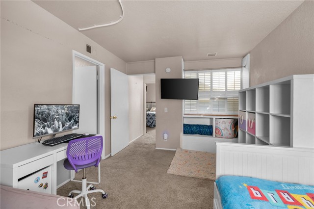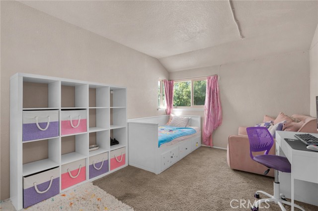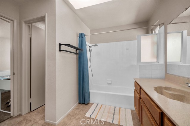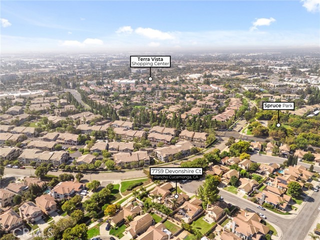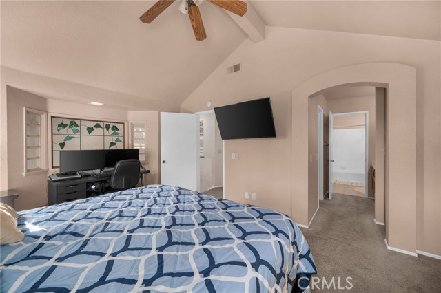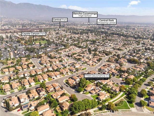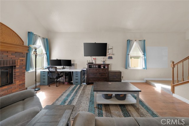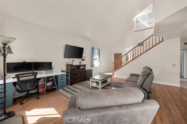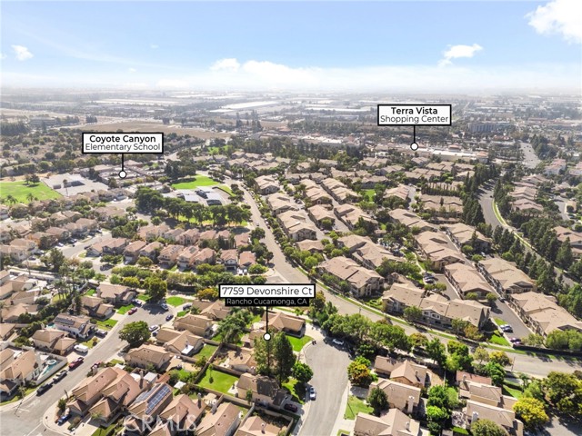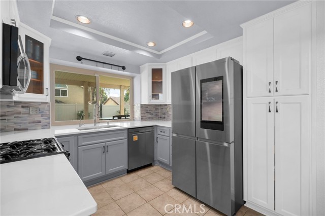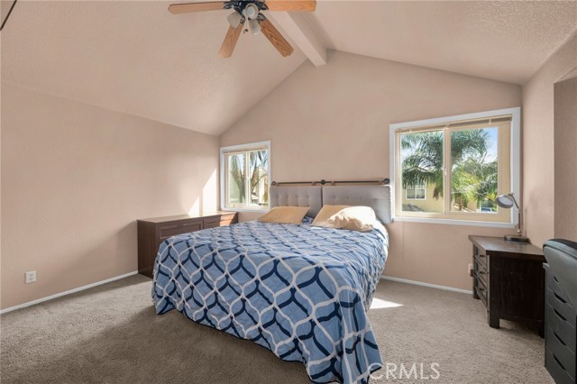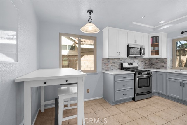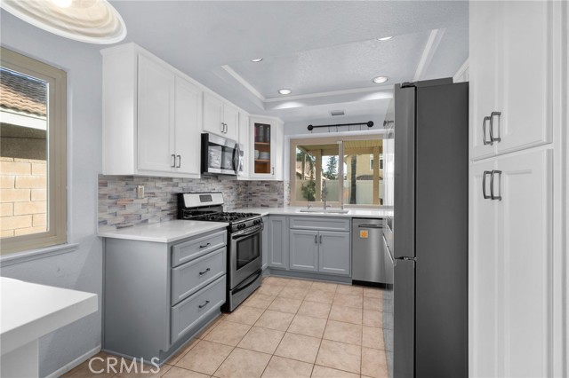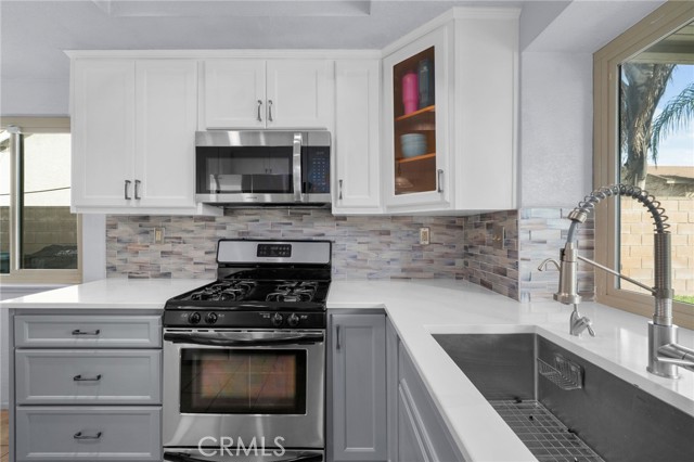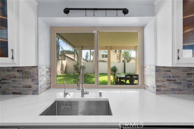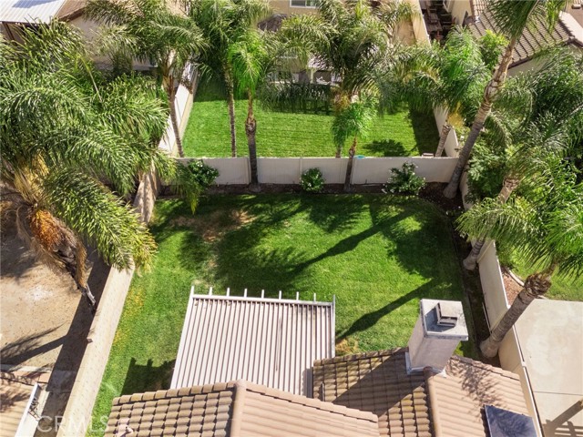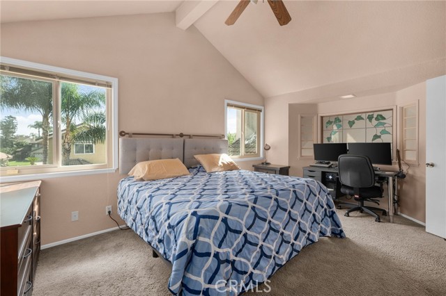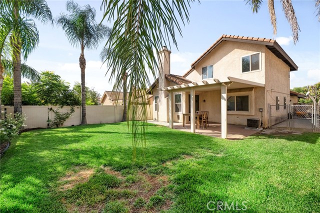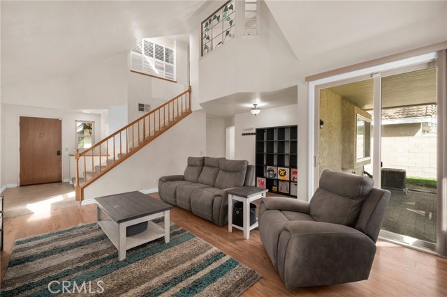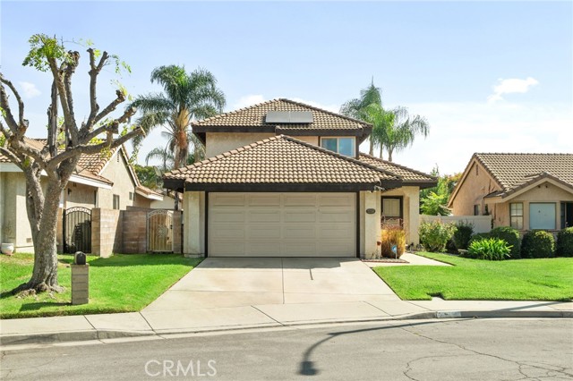 This charming home at the end of the cul de sac offers incredible curb appeal with lush green grass and beautiful landscaping that welcomes you in. Step inside to a spacious family room featuring a cozy fireplace, high ceilings, and an open-rail staircase. Sliding glass doors lead to the backyard, filling the space with natural light. The kitchen includes a cheerful breakfast nook, upgraded cabinets, quartz countertops, and a stylish tile backsplash. Conveniently, there’s a downstairs bedroom and a full bathroom—perfect for guests or multi-generational living—plus an indoor laundry room. Upstairs, the primary suite features dual sinks and plenty of space to unwind, along with another comfortable bedroom. This home also boasts new windows throughout for energy efficiency and comfort, along with solar panels for added savings! Outside, the backyard is an entertainer’s delight with a covered patio, lush lawn, palm trees, and a fenced side yard—ideal for play or pets. Located close to parks, shopping, and top-rated schools, this home truly has it all!