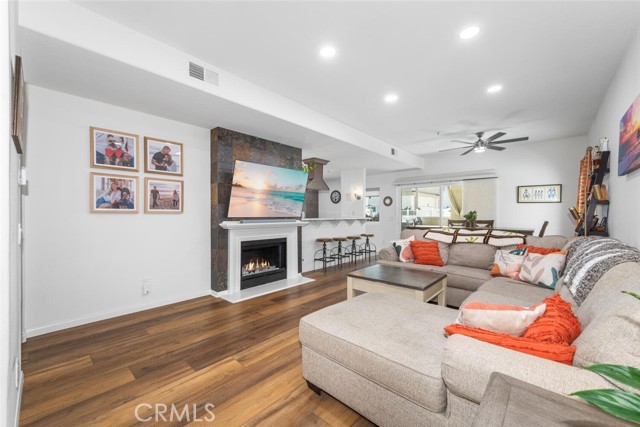Live the California dream with sand, surf, and sunsets just steps from your door. Perfectly positioned along Pacific Coast Highway, this ground-level Huntington Beach condo captures the laid-back coastal lifestyle with a modern, upgraded twist. Step inside and you’ll instantly feel at home in the open floor plan, highlighted by newer luxury vinyl plank flooring, a newly renovated gas fireplace, and natural light pouring in through brand-new windows with custom treatments. The kitchen is a total standout — thoughtfully redesigned with pull-out shelving, under-cabinet lighting, a gas stove with a custom vent hood, sleek countertops, and bar seating that flows effortlessly for entertaining. There’s even a wine fridge for those impromptu happy hours after a day at the beach. Through the new sliding glass doors, your private patio becomes an easy extension of the living space — perfect for morning coffee or watching the colors of the evening sky. Both bedrooms offer ensuite bathrooms for comfort and privacy, while the spacious primary retreat features a deep walk-in closet and serene ambiance you’ll love coming home to. With a brand-new HVAC system, every detail has been considered for effortless year-round living. Simply walk across PCH to the sand or the walking and biking trails. Head to Main Street, Huntington Beach Pier or the popular 2nd & PCH Shopping plaza all just minutes away! Whether you’re searching for your full-time beach home or a coastal weekend escape, this turn-key condo delivers the best of Huntington Beach — ocean air, walkable access, and a lifestyle that feels like vacation every day.