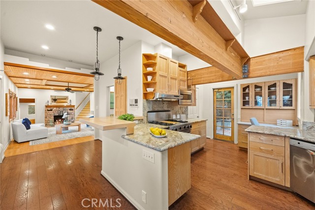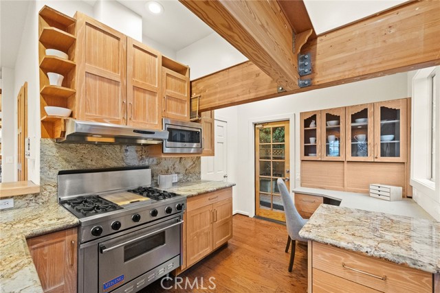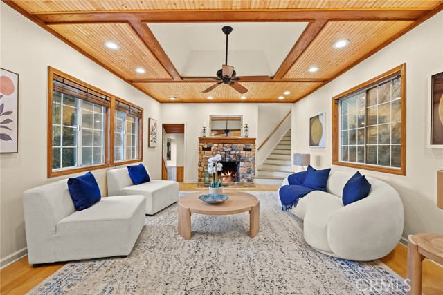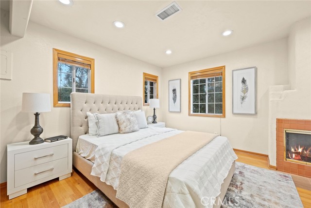 Welcome to your perfect foothill retreat, sheltered by oak trees and where every room has a view overlooking the San Gabriel Valley. This split level ranch was expanded to a second level in 1990 and is now a 3 bedroom/3 bath hillside home that is nearly 2,000 square feet with hardwood floors throughout and fully air-conditioned. The addition boasts a suite encompassing the entire upper floor with a sitting area and a primary bedroom with a gas fireplace, walk-in closet, and an adjoining full bathroom that has a jetted bathtub. The spacious open living room has a rustic stone fireplace that is wood burning, perfect for cozy entertainment with family and friends. This warm homey feel extends into the expansive kitchen and dining area that has a high beamed ceiling with end to end skylights bringing in sunshine throughout the year. The kitchen has an abundance of storage including a walk-in pantry. Finally, there is a step-down den that can be transformed into a man cave dream or a game room for kids. This mountain property sits only blocks away from Mary’s Market, the Mount Wilson Trail, nearby “Turtle” Park and the quaint charm of Sierra Madre with its unique shops, parks and restaurants. This is your opportunity to experience the foothill lifestyle and enjoy the deer and buck wandering the neighborhood, take in the breathtaking sunrise and sunset views from the oak tree sheltered gazebo, and sit out on the deck looking over the flagstone pond and views of the Valley.