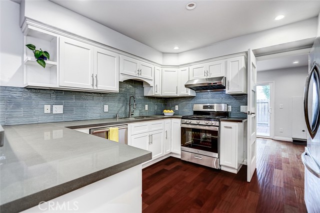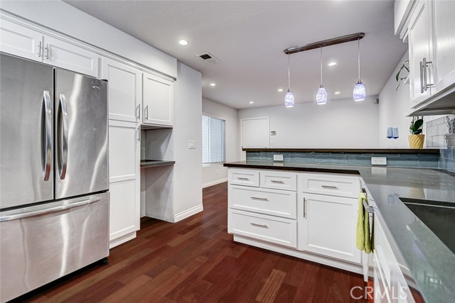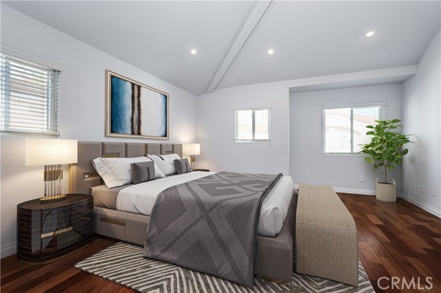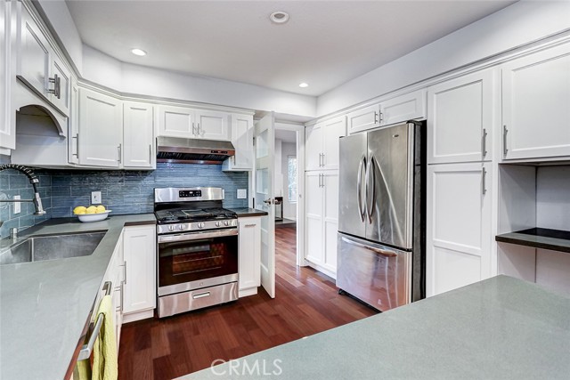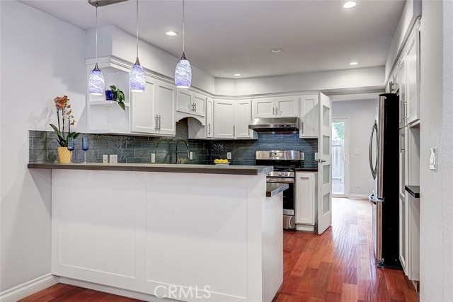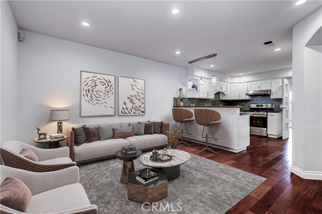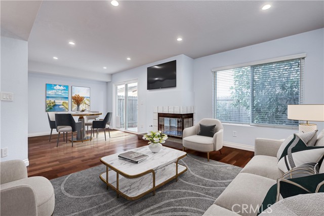 Turnkey remodeled 3-bedroom, 2.5-bath townhome in a desirable gated Gardena community. The home features a bright, welcoming layout with a spacious living and family area downstairs, complete with beautiful flooring and a cozy gas fireplace. A skylight over the stairs fills the space with natural light, and high vaulted ceilings upstairs create an open, airy feel. Large sliding doors open to a private backyard, perfect for relaxing, entertaining, or picking lemons from your own tree. The interior location ensures peace and quiet, away from street noise. The remodeled kitchen boasts modern white cabinetry, quartz countertops, and stainless-steel appliances, including a dishwasher. A convenient half bath is located on the main level, along with direct access to the attached two-car garage, which features built-in storage cabinets. All bedrooms are located upstairs, with the laundry area nearby for convenience. The primary suite offers two walk-in closets with custom shelving and a beautifully remodeled bathroom with dual sinks, a tub/shower combo, and a separate vanity area. Both bathrooms have been tastefully updated. Additional highlights include air conditioning for hot days, an upgraded electrical panel, and a gated community sparkling pool. Nothing to do but move in!