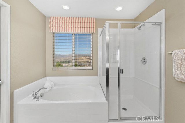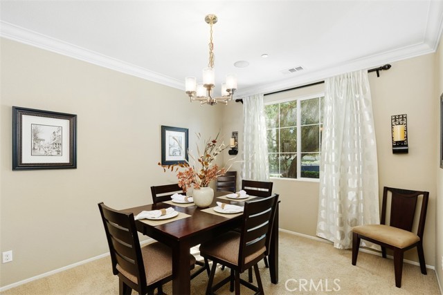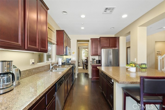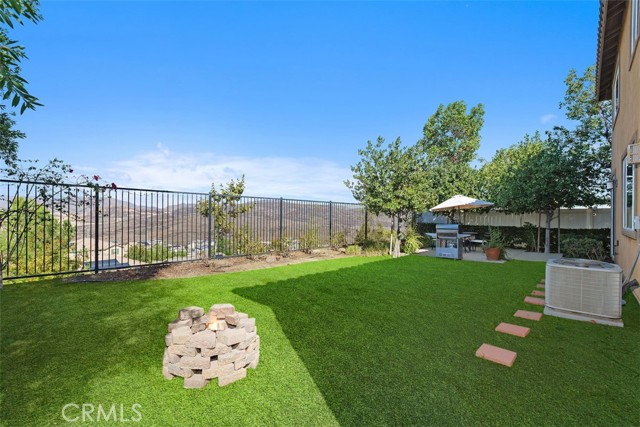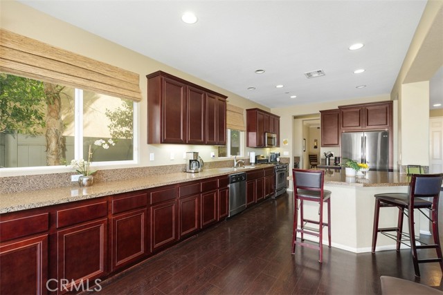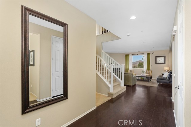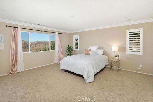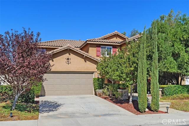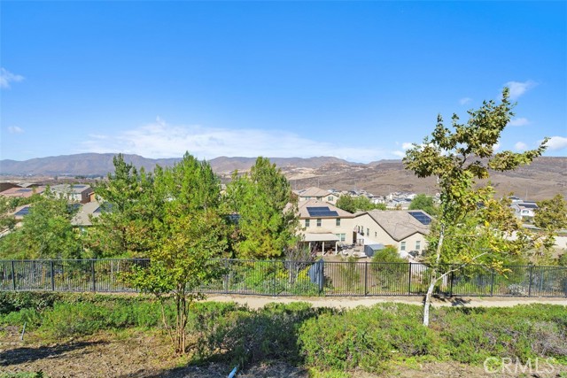 This stunning former model home in Amberhill Ranch offers panoramic mountain views from its elevated 5,663 sq ft lot and features five spacious bedrooms, (including a main-floor suite), plus a versatile upstairs loft. The formal dining room has a butler's pantry and flows seamlessly into a gourmet kitchen equipped with rich wood cabinetry, wood floors, granite countertops, stainless steel appliances, a large island, and abundant storage. The great-room style family room boasts surround sound, a cozy fireplace, and breathtaking views. The nearby main floor bedroom with en-suite bathroom is great for guests. Upstairs, the luxurious upstairs primary suite includes crown molding, built-in speakers, and a spa-like bathroom with travertine floors, dual sinks, a soaking tub, separate shower, and oversized walk-in closet. Additional highlights upstairs include the large bonus room/loft, three additional bedrooms, dual-sink bathroom, an upstairs laundry room, whole-house fan, and dual-zoned A/C. The flat, usable backyard offers privacy, breezes, and space for a pool or play area. 3 car tandum garage offers convenient space options. Located within walking distance to a new elementary school and resort-style HOA amenities including a pool, splash zone, clubhouse, and parks, this home is just minutes from the I-15 freeway, Lake Elsinore Outlets, and the lake, plus offers easy access to Corona, 25 min to Temecula and 50 min to Orange County. This property is the perfect place to call home.