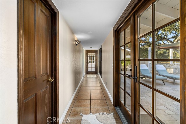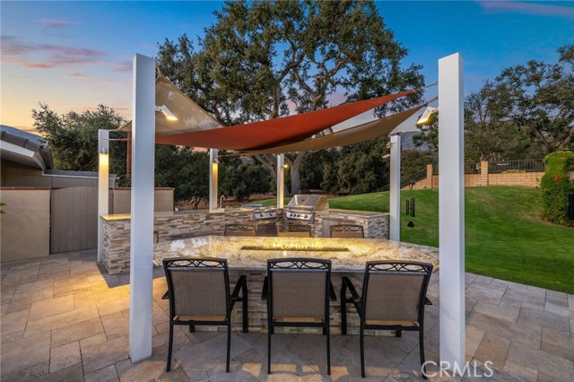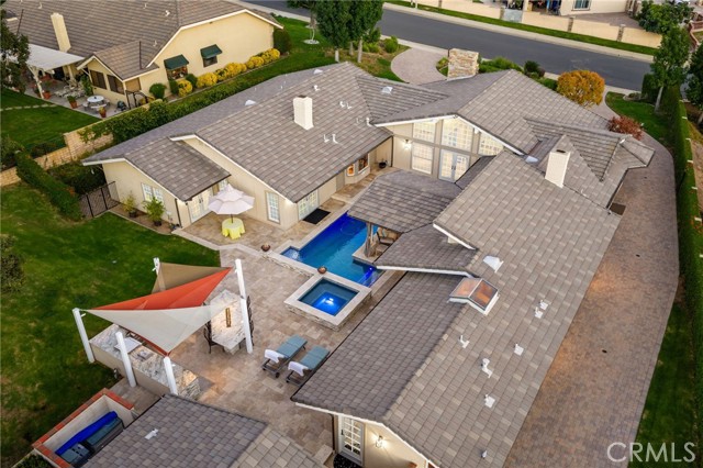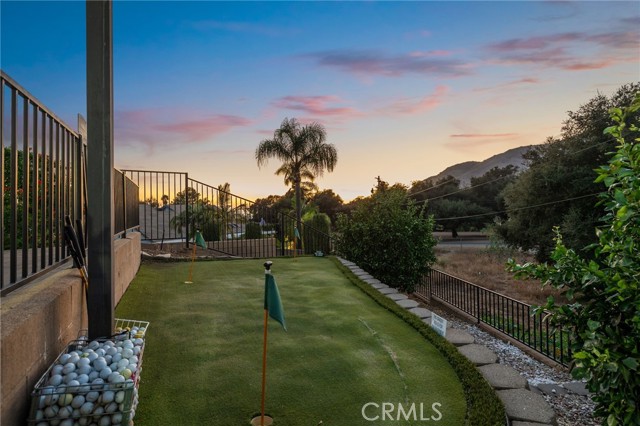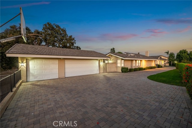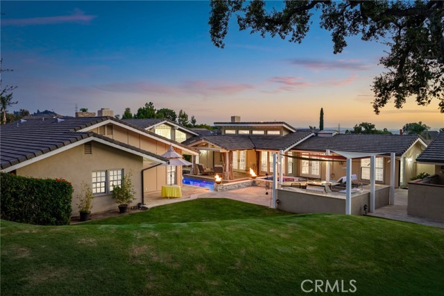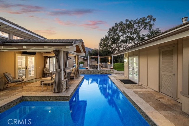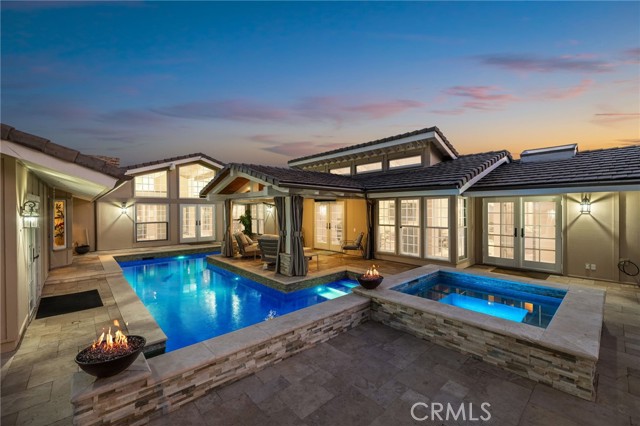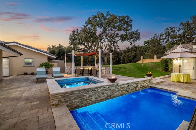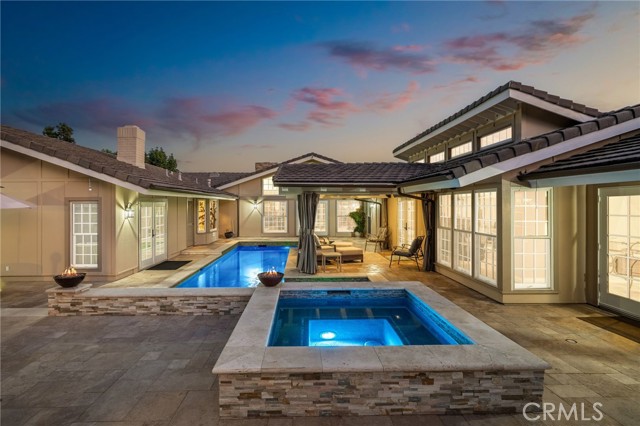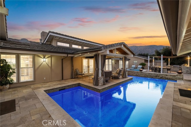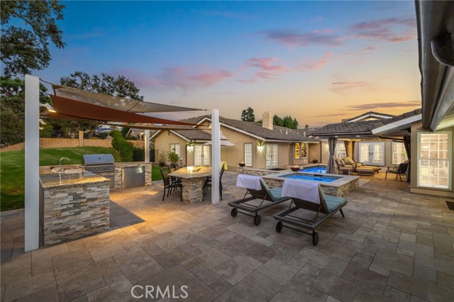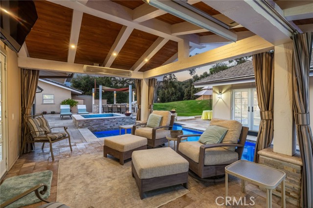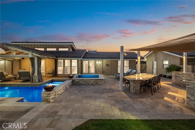 Custom California Ranch-Style Estate featuring a symmetrical façade, circular paver driveway, stacked-stone accents, and meticulousl landscaping. Double iron-and-glass entry doors opens to a light-filled interior framed by floor-to-ceiling windows and wood-trimmed architectural columns, leading seamlessly into the formal living and dining rooms. The living room offers a tray ceiling with crown molding, a fireplace, and windows overlooking the front yard. The dining room offers a mirrored coffered ceiling and French doors that open to a front sitting area. The kitchen features custom wood cabinetry, granite countertops, stainless steel appliances, bar-top seating, and a breakfast nook with a built-in desk area. The adjacent family room offers a dramatic fireplace framed in granite, exposed white trusses, and wood-plank ceiling that blends architectural character. French doors and wood-framed, grid-style casement windows provide views and a seamless transition to the backyard. This wing also includes a bathroom with shower, a laundry room, and access to the three-car garage. On the opposite wing, an executive-style office showcases millwork, coffered ceilings, floor-to-ceiling built-ins, and richly stained cabinetry. The luxurious primary suite is a sanctuary–oversized and appointed with tray ceilings, dual sets of French doors, tall windows, and dual walk-in closets. The spa-inspired en suite bath features a jetted tub set beneath stained-glass windows, a walk-in shower, dual vanities with granite counters, and a double-sided fireplace shared with the bedroom. Additional bedrooms include one with an angled tongue-and-groove plank ceiling, and another with a tray ceiling. The hall bathroom features granite countertops, a frameless walk-in shower, and a jetted tub. The private, resort-style backyard is designed for elevated living–an expansive outdoor retreat ideal for entertaining or everyday luxury. A sleek PebbleTec pool is the centerpiece, paired with a stacked-stone spa, dramatic fire bowls, and cascading water features. A covered cabana lounge with vaulted wood ceiling, recessed lighting, heaters, and drapery offers a year-round outdoor living experience. A built-in BBQ island with stainless appliances, a fire table, sail shades, and paver decking sits beneath a majestic oak tree with views of hillside vistas. The detached three-car garage sits beyond a private gated driveway, where a putting green adds the final touch to this extraordinary estate.