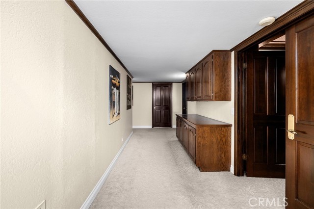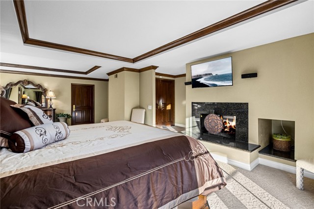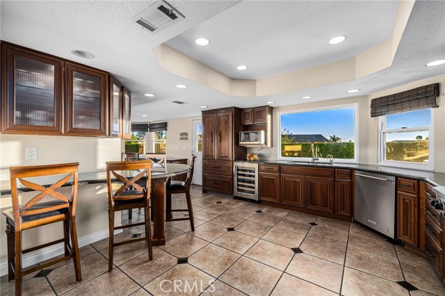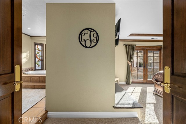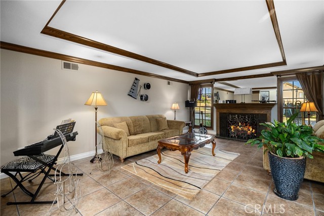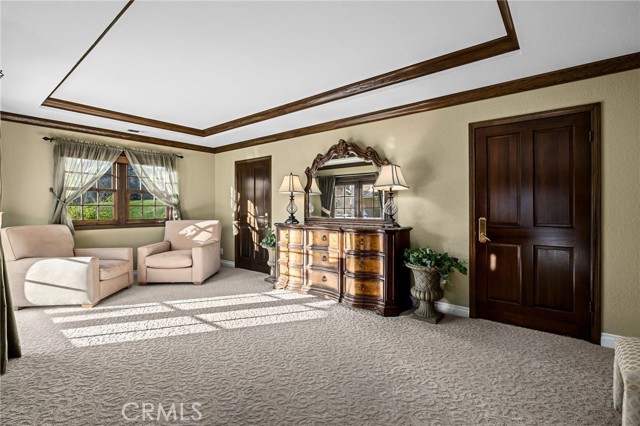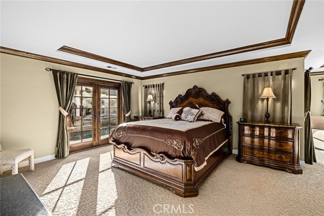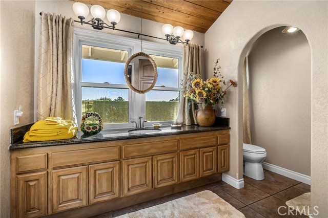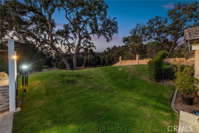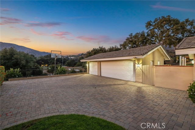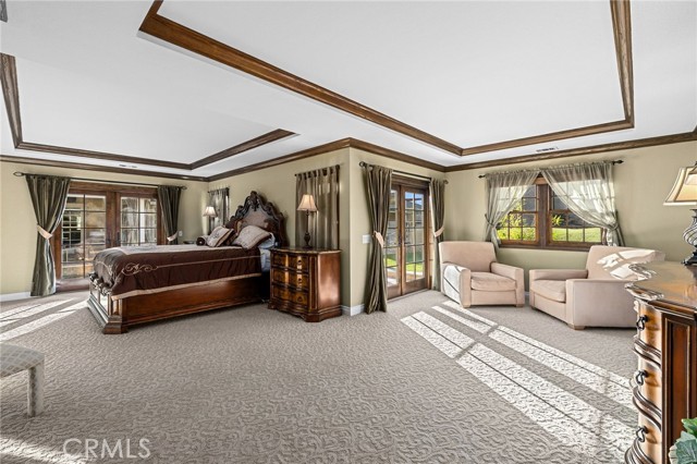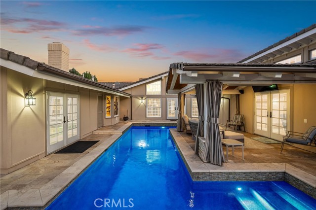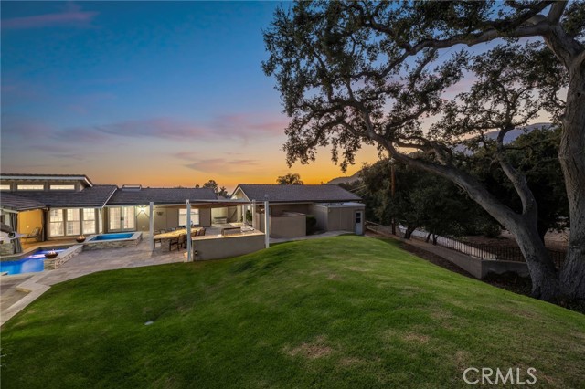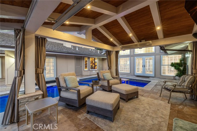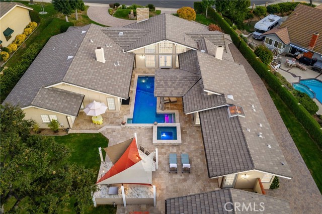 Custom California Ranch-Style Estate featuring a symmetrical façade, circular paver driveway, stacked-stone accents, and meticulousl landscaping. Double iron-and-glass entry doors opens to a light-filled interior framed by floor-to-ceiling windows and wood-trimmed architectural columns, leading seamlessly into the formal living and dining rooms. The living room offers a tray ceiling with crown molding, a fireplace, and windows overlooking the front yard. The dining room offers a mirrored coffered ceiling and French doors that open to a front sitting area. The kitchen features custom wood cabinetry, granite countertops, stainless steel appliances, bar-top seating, and a breakfast nook with a built-in desk area. The adjacent family room offers a dramatic fireplace framed in granite, exposed white trusses, and wood-plank ceiling that blends architectural character. French doors and wood-framed, grid-style casement windows provide views and a seamless transition to the backyard. This wing also includes a bathroom with shower, a laundry room, and access to the three-car garage. On the opposite wing, an executive-style office showcases millwork, coffered ceilings, floor-to-ceiling built-ins, and richly stained cabinetry. The luxurious primary suite is a sanctuary–oversized and appointed with tray ceilings, dual sets of French doors, tall windows, and dual walk-in closets. The spa-inspired en suite bath features a jetted tub set beneath stained-glass windows, a walk-in shower, dual vanities with granite counters, and a double-sided fireplace shared with the bedroom. Additional bedrooms include one with an angled tongue-and-groove plank ceiling, and another with a tray ceiling. The hall bathroom features granite countertops, a frameless walk-in shower, and a jetted tub. The private, resort-style backyard is designed for elevated living–an expansive outdoor retreat ideal for entertaining or everyday luxury. A sleek PebbleTec pool is the centerpiece, paired with a stacked-stone spa, dramatic fire bowls, and cascading water features. A covered cabana lounge with vaulted wood ceiling, recessed lighting, heaters, and drapery offers a year-round outdoor living experience. A built-in BBQ island with stainless appliances, a fire table, sail shades, and paver decking sits beneath a majestic oak tree with views of hillside vistas. The detached three-car garage sits beyond a private gated driveway, where a putting green adds the final touch to this extraordinary estate.