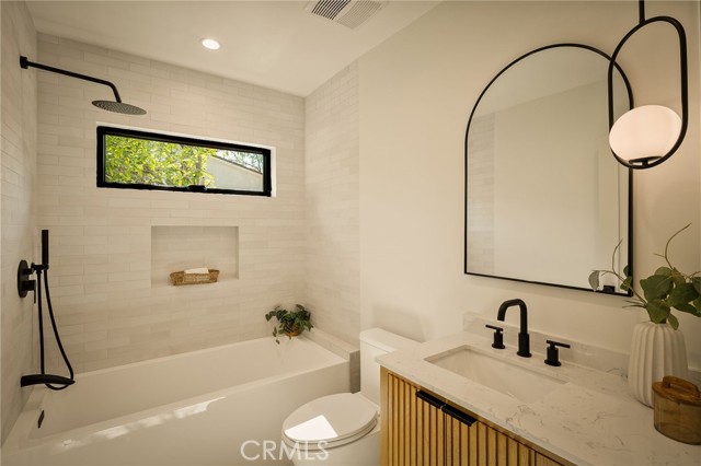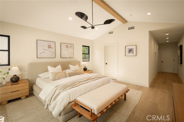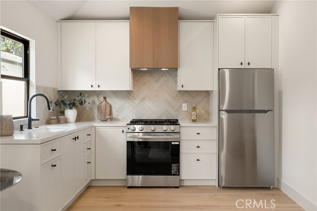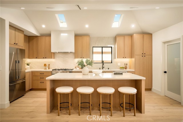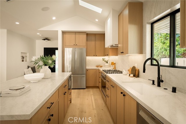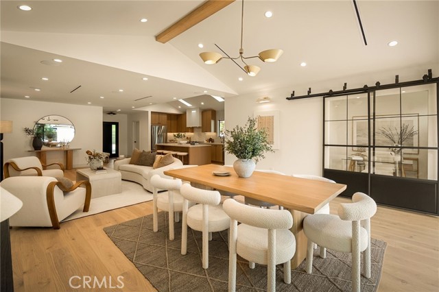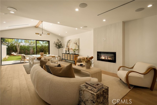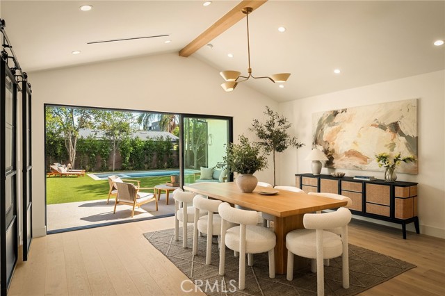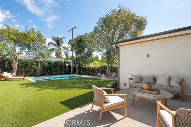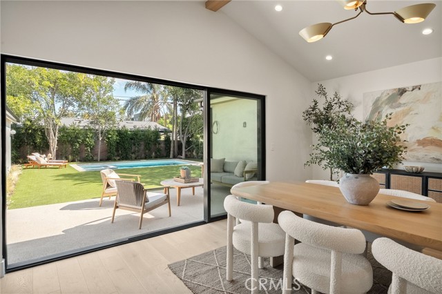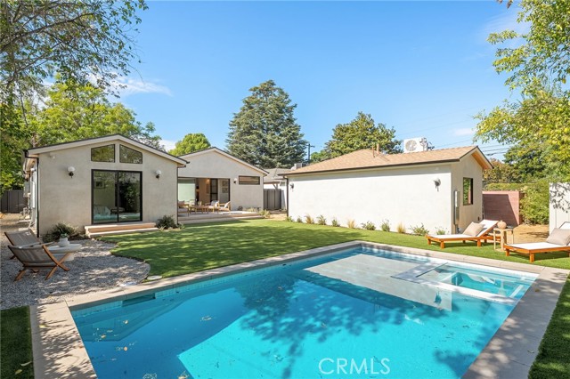 This beautifully reimagined home sits gracefully on a quiet street in one of Valley Village’s most desirable neighborhoods. Thoughtfully redesigned from top to bottom, the 3-bedroom, 2.5-bath residence showcases sophisticated design, natural light, and seamless flow throughout its open-concept layout. The inviting living room, anchored by a cozy fireplace, connects effortlessly to the dining area and a chef’s kitchen featuring a large island, custom White Oak cabinetry, Taj Mahal quartzite countertops, and premium appliances — the perfect setup for gatherings and everyday living. Sliding doors open to a spacious entertainer’s backyard featuring a brand-new pool and spa, surrounded by lush greenery and ambient landscape lighting that create a private, resort-like retreat. The primary suite offers direct access to the backyard and a spa-inspired bath with a freestanding soaking tub. Each bedroom is spacious and filled with natural light, offering comfort and versatility for family, guests, or creative use. The home also features a dedicated laundry room with ample storage, carport parking, and a detached 1-bedroom ADU showcasing high ceilings and abundant natural light.. The property’s extended driveway provides generous parking for several vehicles, including space for an RV. Set on an expansive 8,100 sq. ft. lot, this 2,600 sq. ft. property blends modern luxury with timeless warmth, offering exceptional design and functionality in one of Valley Village’s most desirable neighborhoods — just moments from a House of Worship.
