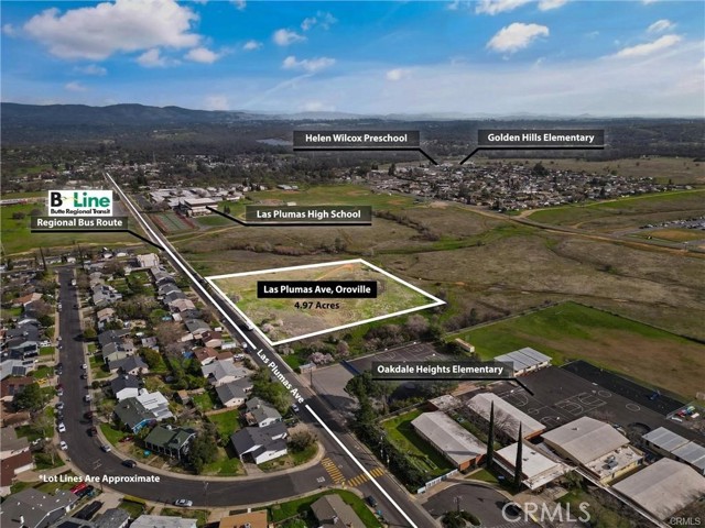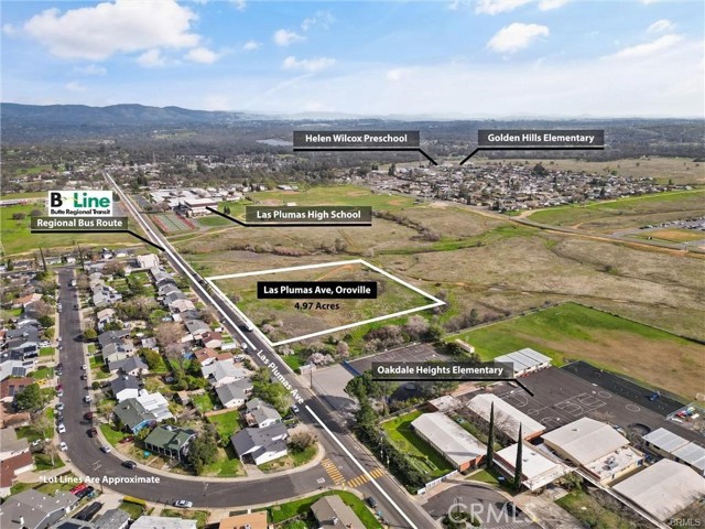 Land Development Potential – Prime MDR-Zoned 4.97+/- Acres in the Path of Growth Don’t miss this rare opportunity to secure nearly 5 acres of land perfectly positioned in the path of ongoing development. Zoned MDR (Medium Density Residential), this property allows a minimum of 6,000+ sq. ft. residential building lots and supports a range of housing types including single-family homes, duplexes, and second units. All essential utilities—power, sewer, water, phone, and internet—are conveniently located at the street and ready to connect, making this an excellent candidate for a new residential subdivision or community project. The location is unbeatable, situated directly next to Oakdale Heights Elementary School, just a parcel away from Las Plumas High School, and within close proximity to Golden Hills Elementary and Helen Wilcox Preschool. The land itself is mostly flat with a gentle roll, offering easy development potential. It’s also located along the B-Line public bus route, providing convenient transportation access. Nearby, ground has already broken on a new housing development, further highlighting the growth and opportunity in this area. MDR zoning supports medium-density residential living while also allowing for various conditional uses such as residential care facilities, daycare centers, clinics, community centers, schools (public or private), and small-scale retail or professional offices. The maximum permitted residential density is six dwelling units per acre. With its prime location, available utilities, and flexible zoning, this property offers an exceptional opportunity for builders, investors, or developers to bring their vision to life in one of Butte County’s most promising growth areas. Assessor Parcel Number: 078-170-045. For more details or to discuss your development ideas, contact Butte County Building & Planning/Public Works.