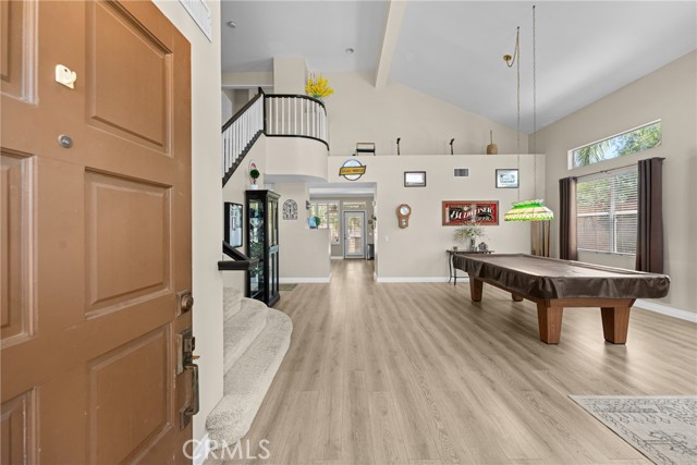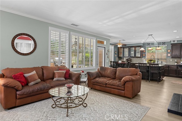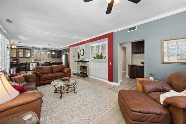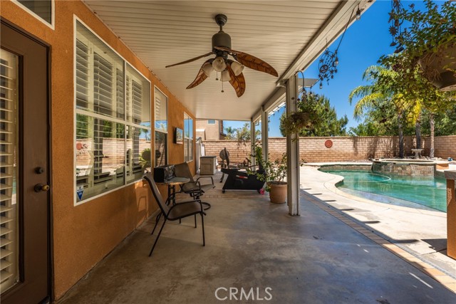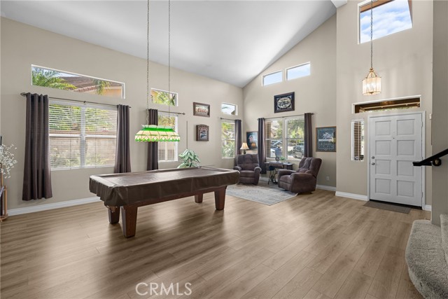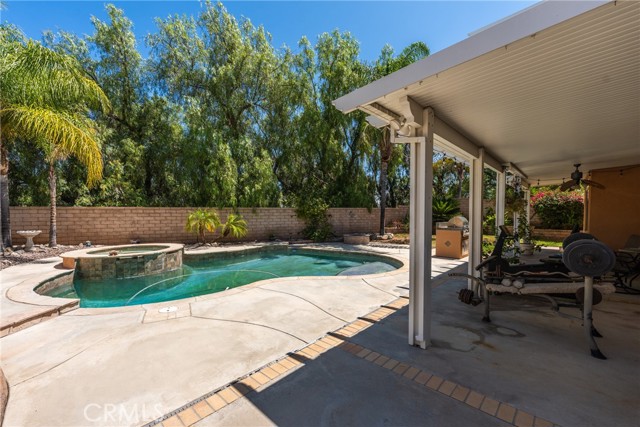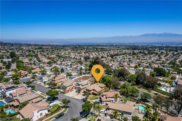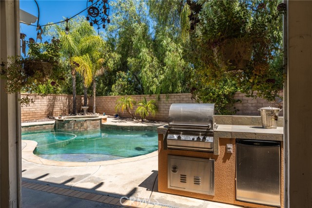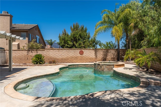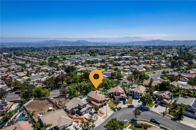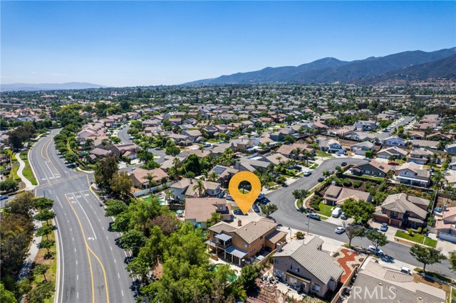This beautiful 4 bed/4bath pool home is ready for the next generation to live and love! Maintained by the original owners, step in to a vast open living area with impressive vaulted ceilings full of windows steaming volumes of natural light, complimented by gorgeous brand new wood-look flooring throughout entire first level. The stunning staircase makes an elegant statement leading to 4 generously sized bedrooms. A grand double door entrance invites you to an oversized primary ensuite with sitting area, large soaking tub, separate walk-in shower, dual sinks and dual walk-in closets. Sliding doors lead to a lovely covered balcony overlooking the sparkling pool with mountain views! Perfect setting for morning coffee or evening cocktail. Down the open hallway overlooking the living room are 3 additional ample sized bedrooms. Jack&Jill w/dual sink bathroom and a separate mini-ensuite with walk-in closet. Saunter into the open yet dreamy kitchen with cooking island, beautiful granite countertops, lovely cherrywood colored cabinetry w/adjustable shelving (lots of storage space!), open to the large family room w/fireplace (a portion of the family room is easily converted to a 5th bedroom - just enclose one wall!). A fourth full size guest bath is conveniently located on the first level along with a generously sized laundry room complete with folding area, sink and exterior door. The 3 car garage provides plenty of storage and parking for multiple vehicles. Relax by the private pool or take a soothing soak in the jacuzzi spa while grilling up some dinner on the built-in natural gas BBQ statin in the treelined backyard.Fertile filled flower bed planters surround this private backyard secured by block wall fencing. A gated side yard is great for securing animals, outdoor equipment and more! Located on a quiet street near award wing schools, nearby shopping, parks, hills for hiking, biking and trails galore! Come to Corona, your home awaits!