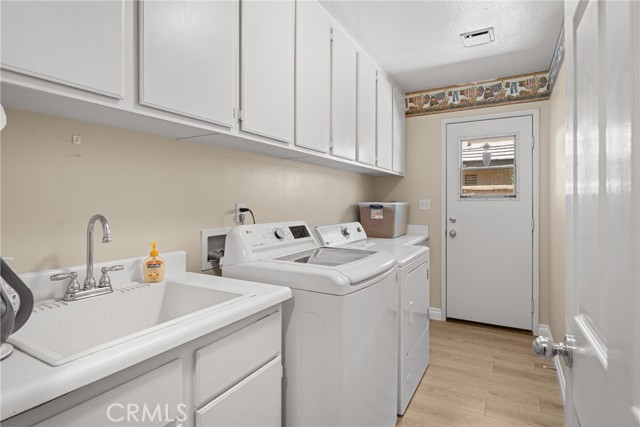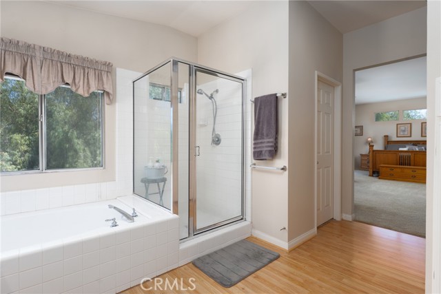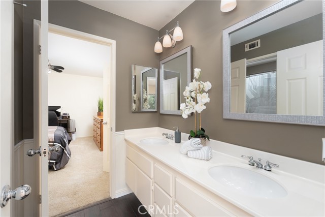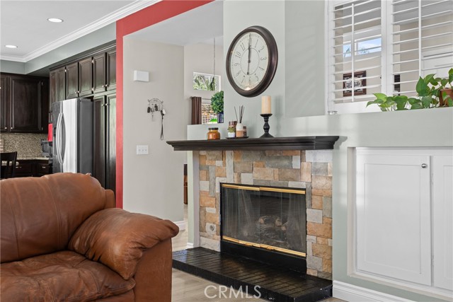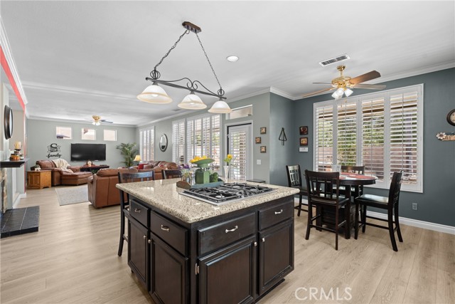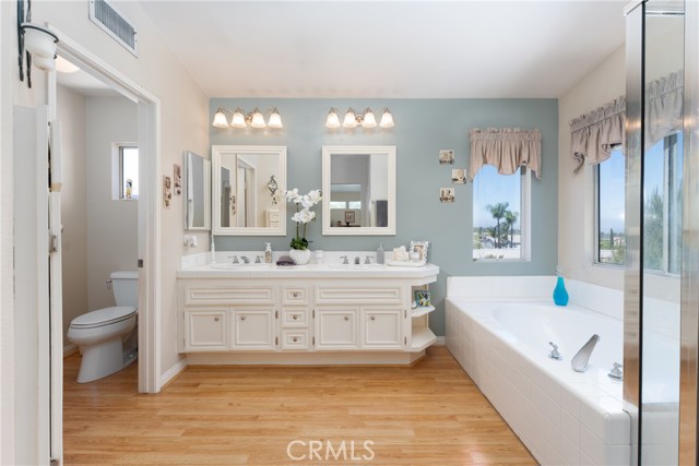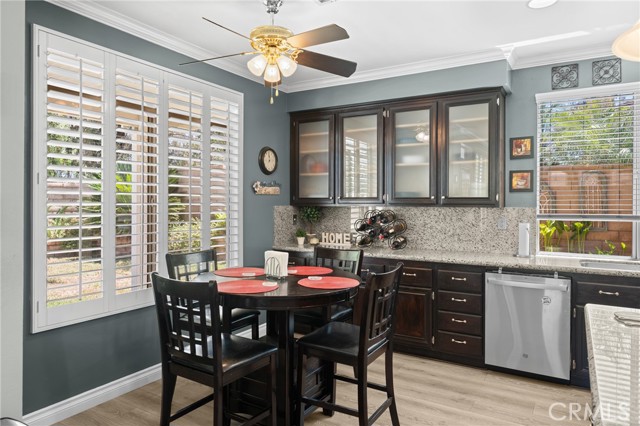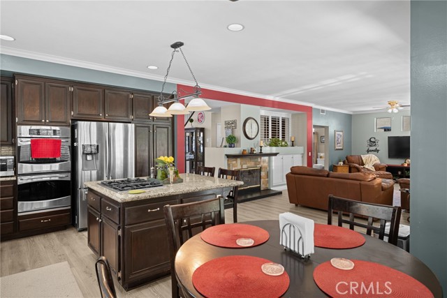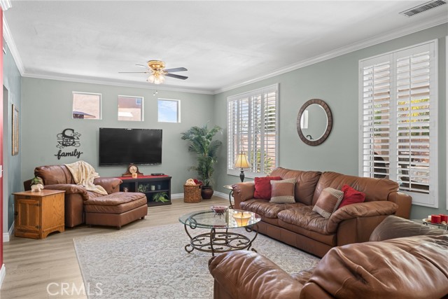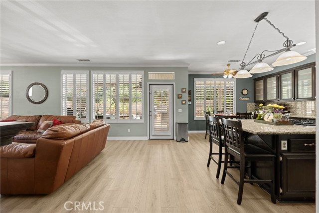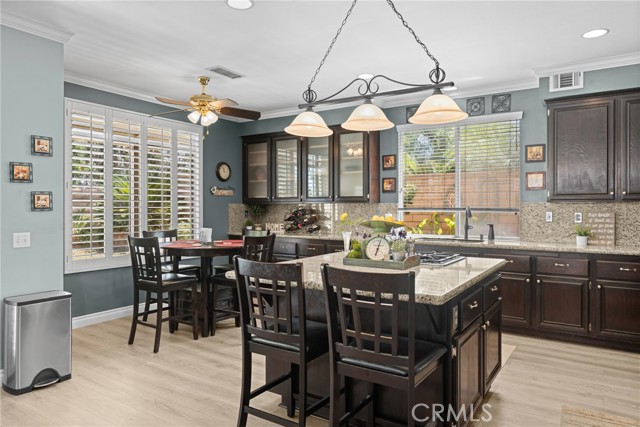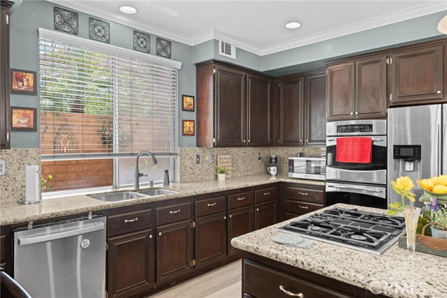 This beautiful 4 bed/4bath pool home is ready for the next generation to live and love! Maintained by the original owners, step in to a vast open living area with impressive vaulted ceilings full of windows steaming volumes of natural light, complimented by gorgeous brand new wood-look flooring throughout entire first level. The stunning staircase makes an elegant statement leading to 4 generously sized bedrooms. A grand double door entrance invites you to an oversized primary ensuite with sitting area, large soaking tub, separate walk-in shower, dual sinks and dual walk-in closets. Sliding doors lead to a lovely covered balcony overlooking the sparkling pool with mountain views! Perfect setting for morning coffee or evening cocktail. Down the open hallway overlooking the living room are 3 additional ample sized bedrooms. Jack&Jill w/dual sink bathroom and a separate mini-ensuite with walk-in closet. Saunter into the open yet dreamy kitchen with cooking island, beautiful granite countertops, lovely cherrywood colored cabinetry w/adjustable shelving (lots of storage space!), open to the large family room w/fireplace (a portion of the family room is easily converted to a 5th bedroom - just enclose one wall!). A fourth full size guest bath is conveniently located on the first level along with a generously sized laundry room complete with folding area, sink and exterior door. The 3 car garage provides plenty of storage and parking for multiple vehicles. Relax by the private pool or take a soothing soak in the jacuzzi spa while grilling up some dinner on the built-in natural gas BBQ statin in the treelined backyard.Fertile filled flower bed planters surround this private backyard secured by block wall fencing. A gated side yard is great for securing animals, outdoor equipment and more! Located on a quiet street near award wing schools, nearby shopping, parks, hills for hiking, biking and trails galore! Come to Corona, your home awaits!