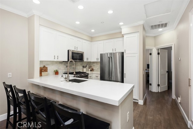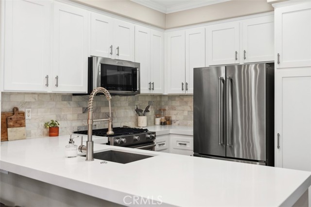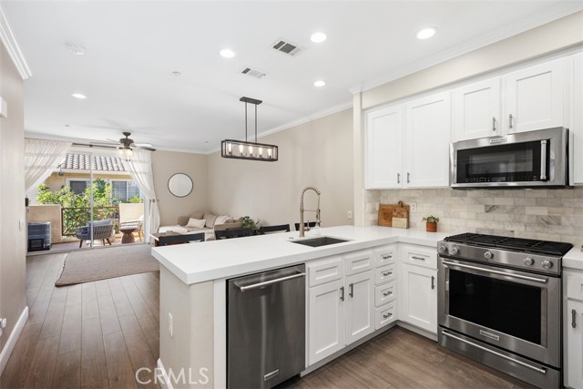 Beautifully remodeled, open-concept townhome featuring custom cabinetry, Quartz counters with marble backsplash, chef-style stainless steel appliances, upgraded lighting and fixtures, wood-look laminate flooring, and Carrara marble bathroom tile. Enjoy cozy evenings by the fireplace or sunsets from your private balcony. Includes direct garage access, low HOA, and no Mello-Roos! Prime location near Portola Community Park, hiking and biking trails, top-rated schools, shopping, dining, and easy 241 Toll Road access.