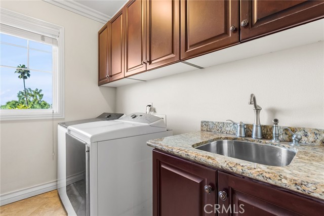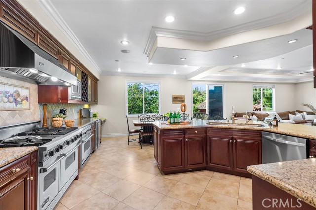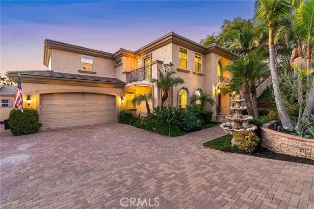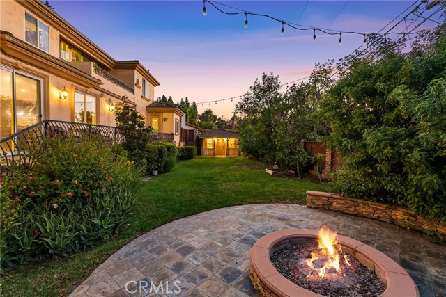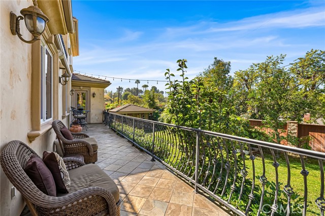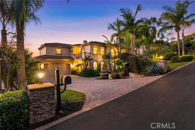 Bask in breathtaking sunset views from this beautifully refreshed North Tustin retreat, where mature palms grace the property and create a tranquil ambiance. Set on a private cul-de-sac, this home blends space, comfort, and timeless style with striking curb appeal. 5 bedrooms, 4 bathrooms, plus a detached office or flex space with 1/2 bath, and approximately 4035 sq. ft. of well-designed living space. 12941 Villa Rose Drive is made for both grand entertaining and everyday living. Step inside to a welcoming entry with formal living and dining rooms that set the tone for gracious gatherings. The heart of the home — a gourmet kitchen — features custom cabinetry, premier Viking stainless steel appliances including three ovens, expansive granite countertops, and coffered ceilings, all opening to a spacious informal dining area and a light-filled, wonderful great room with a cozy fireplace. From here, patio doors invite you to a backyard retreat with expansive patios and decks for dining and lounging, a built-in BBQ, and a grassy yard ideal for play or relaxation. A detached room with its own 1/2 bath adds flexible space for a home office, studio, play room, or creative escape. Upstairs, the primary suite captures stunning sunset views and includes a fireplace, walk-in closet, and spa-inspired bath with dual vanities. Three additional bedrooms, including one en-suite, and a bathroom complete the upper level, while a main-level bedroom and bath offer flexibility for guests or multi-generational living. Fresh interior paint, new carpet, and stone and wood flooring enhance the home’s inviting, move-in-ready appeal. Additional highlights include an oversized tandem three-car garage with a sink and storage galore, plus a convenient upstairs laundry room. Nestled within the award-winning Tustin Unified School District, this exceptional home blends generous living spaces, modern updates, and a peaceful location — where every evening ends with a North Tustin sunset.