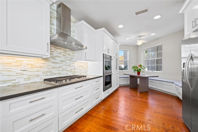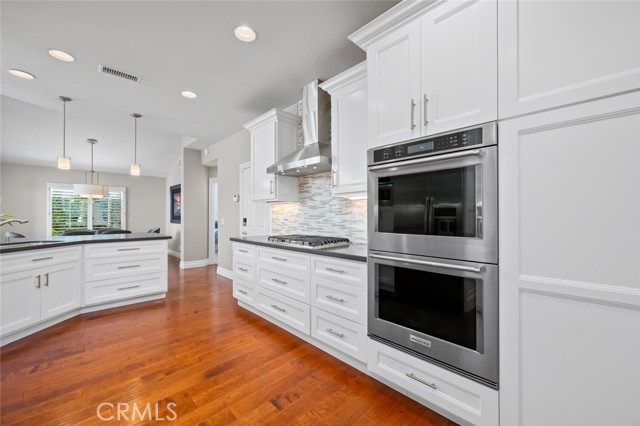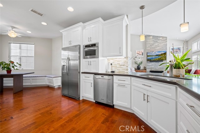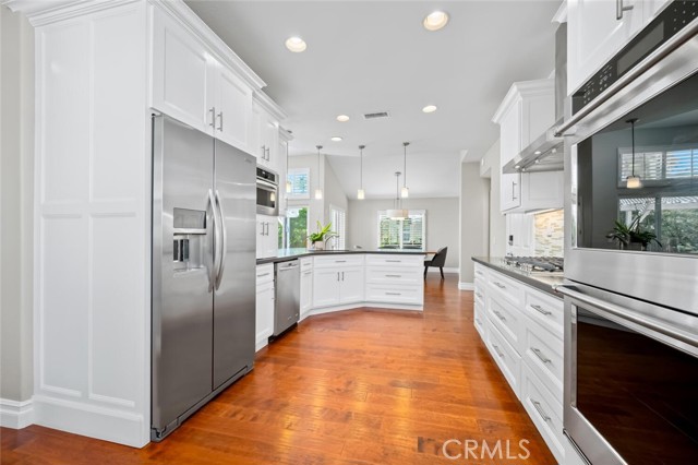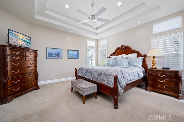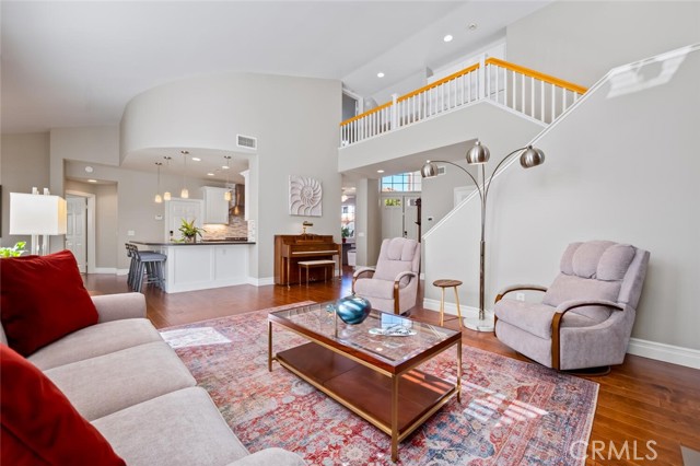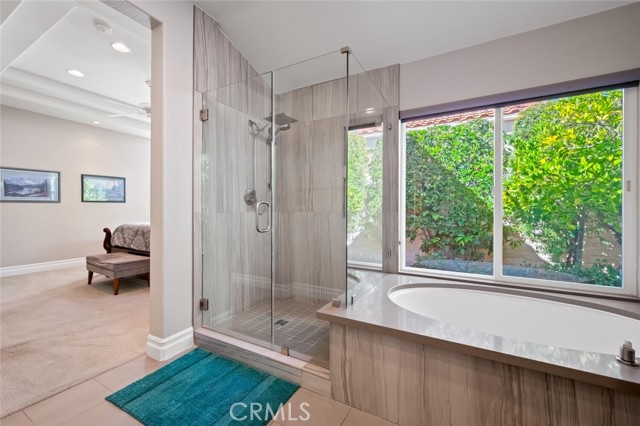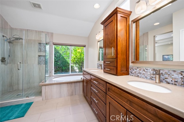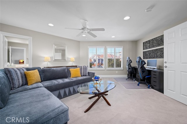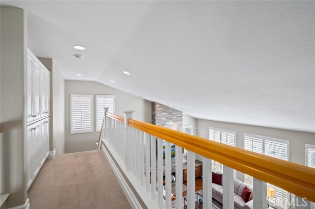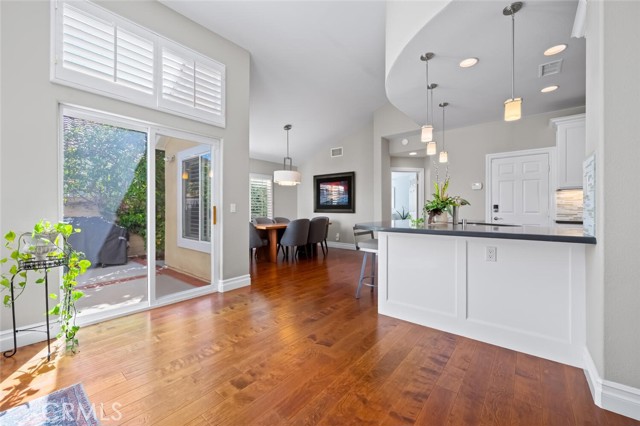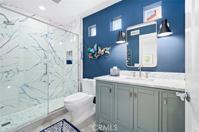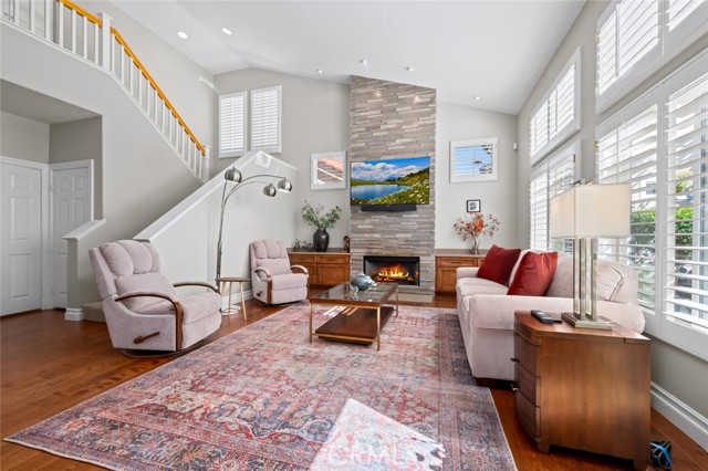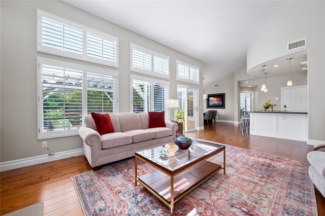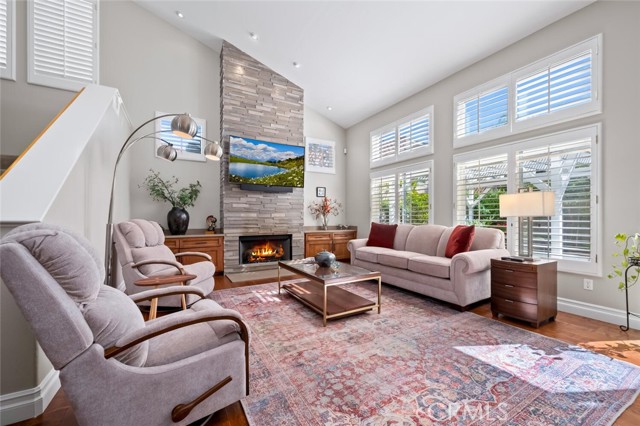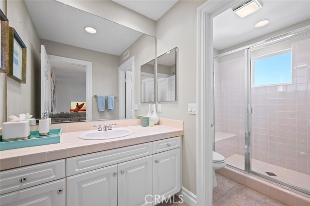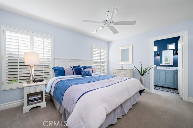 Welcome to this beautifully UPDATED home in the sought-after 55+ community of Palmia! This spacious residence features an open Great Room floorplan with three oversized bedrooms each offering its own ensuite bathroom—PLUS a convenient powder room for guests. The Master bedroom and a Secondary Ensuite bedroom are both on the first level with a Third Ensuite bedroom or flex space on the second level. Filled with natural light, the home showcases vaulted ceilings, neutral décor, and a seamless flow between living spaces. The inviting great room features an updated fireplace with custom cabinetry, engineered wood flooring, and an open layout perfect for entertaining. The remodeled kitchen includes crisp white cabinetry, updated countertops, and newer stainless-steel appliances, a casual banquette eating area in addition to a formal dining area. The private wrap around patio is accessible through the Great room or the Primary Suite. Enjoy a covered patio along with a low-maintenance garden—ideal for relaxing or hosting gatherings. The main-floor primary suite provides comfort and style with a spacious ensuite bathroom that includes dual sinks, a soaking tub, a separate shower, and a large walk-in closet with organizers. A second main-level bedroom with its own ensuite bathroom offers great flexibility for guests or a home office. Upstairs, the expansive third bedroom or bonus suite encompasses a full bath. This space is perfect space for visitors or a multi-purpose room. Additional upgrades include plantation shutters, custom woodwork, and elegant finishes throughout. The home has been re-piped with PEX, updated with owned solar, and features a newer A/C system and water heater. The attached two-car garage offers ample storage, built-in cabinetry, epoxy flooring, and an electric car charger. This exceptional home combines comfort, quality, and style within the vibrant Palmia 55 + community known for its resort-style amenities, social clubs, and active lifestyle. Plus, your membership at Lake Mission Viejo offers boating, beaches, picnics, and live concerts. Don't miss this one - move right in!