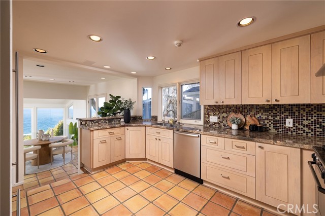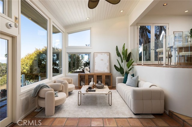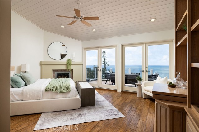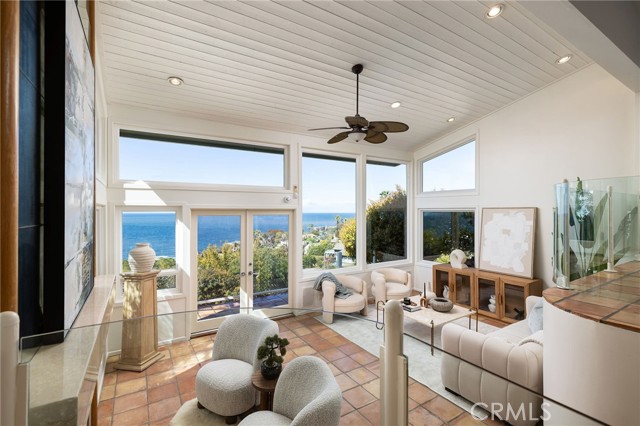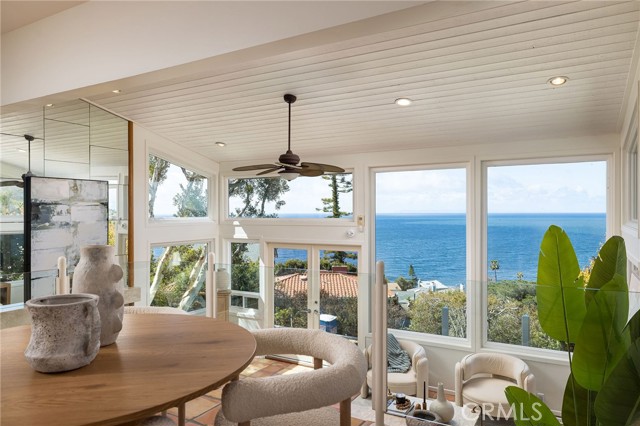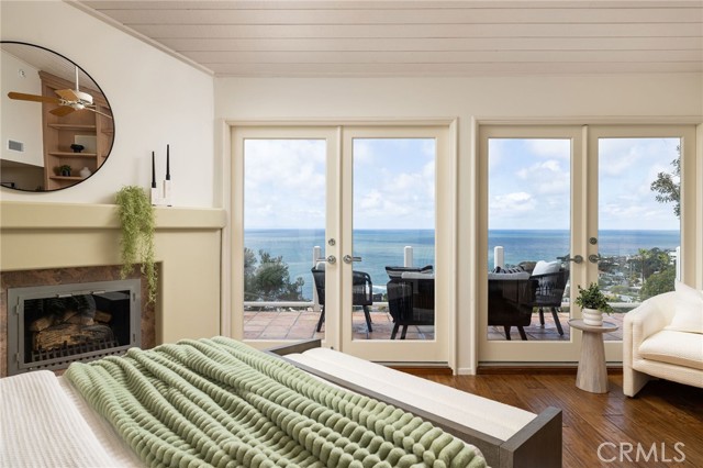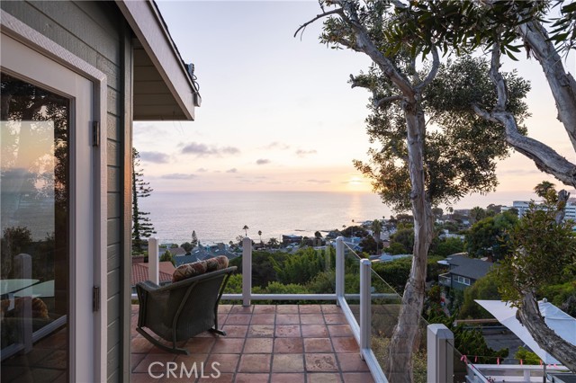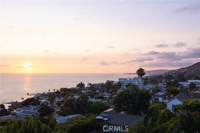 Picture yourself indulging in relaxation, all while the sun dances off the Pacific Ocean, the effervescence of whitewater sparkles along the shore, and, after dusk, lights twinkle on in neighborhoods below you. Welcome to life at 32006 Sunset Avenue in South Laguna Beach, where panoramic ocean views and upscale living combine in a custom home of generous proportions and style. The multi-level residence captures attention with its beautiful curb appeal, embellished with mature, well-maintained landscaping, timeless traditional architecture, and a two-car garage with paver-finished driveway that accommodates off-street parking for two. Numerous French doors and large window expanses bring the outdoors into the three-bedroom design, which features two- and one-half baths, a fireplace-warmed living room with vaulted ceiling and ocean-view deck, and an elevated dining room that overlooks the living room and enjoys ocean views. The dining room leads directly to an open kitchen with breakfast bar, granite countertops, a built-in pantry, and stainless steel appliances including a built-in refrigerator. Flanked by illuminated built-in cabinets, another fireplace is displayed in the home’s family room, where French doors access a tranquil and private backyard with raised planters, towering trees and custom landscape lighting. The family room also opens to a private patio with spa, and an open-concept office includes a built-in desk. Centered around a built-in planter, a multi-tiered staircase leads to the top floor, where the primary suite is appointed with a wraparound ocean-view balcony, fireplace, built-ins and a high ceiling. Completely unique, the primary bath’s custom-tiled shower opens via a pivoting glass door to the balcony for the ultimate indoor/outdoor experience. Plantation shutters add warmth to the home’s style, and Spanish tile, a powder room with pedestal sink and custom tile surrounds, and tongue-and-groove ceilings in select rooms are included. This outstanding South Laguna home is close to gorgeous beaches, luxurious resorts, excellent schools, and downtown Laguna’s Main Beach, village shops, fabulous restaurants and world-famous art galleries.
