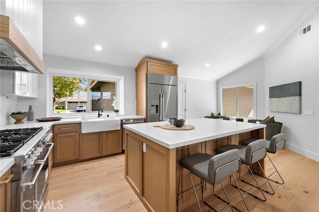Timeless coastal charm nestled in the highly coveted Ridgeview community of Turtle Rock. 16 Morning Glory is one of the finest remodels to ever be offered in the Ridgeview neighborhood. Transformed in 2025 by Pearl 39 with city of Irvine permits!! Featuring a spacious 3-car garage, this 3-bed and 3-bath home can be optioned to a 4 bedroom quite easily. Guests will immediately recognize the large entertainer’s kitchen featuring carefully curated materials. The designer included a custom 84”x 52” island, ample bar seating, and slab countertops. Commercial grade appliances include 48” THOR range and 42” DACOR refrigerator. Beautiful stair railing takes you to the elevated living area where you can enjoy sunset views over the hills, a large balcony or the magnificent custom brick fireplace. The elevated Primary bedroom includes a vaulted ceiling with romantic fireplace addition where you can enjoy Turtle Rock’s beautiful hills and sunset views. The large Primary bathroom includes dual vanity, soaking tub, privacy toilet and expanded and master shower featuring dual shower heads. New PEX piping, water heater, HVAC ducting, and dual sided almond windows. The designer adds warmth with custom wall paneling and crown moulding throughout. Ridgeview is surrounded by master planned parks, community pool, trails, and amenities. Irvine Unified is recognized as one of the top school districts in California and home to UC Irvine, a nationally recognized top public university. 16 Morning Glory is a trophy perched on a hill.