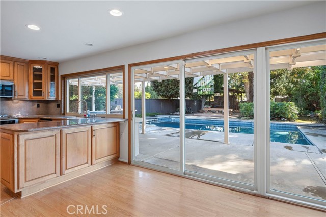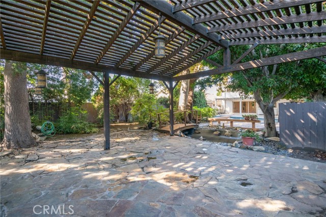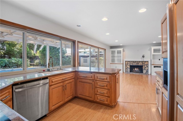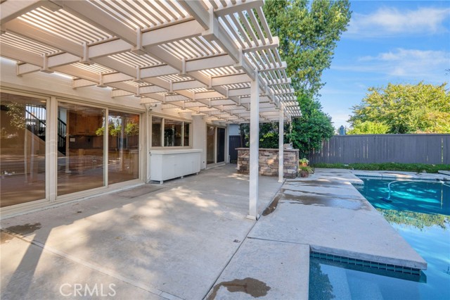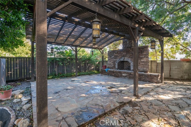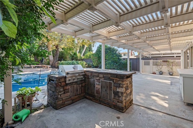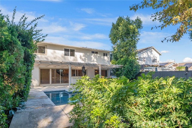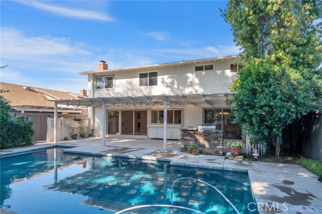 Welcome to this tastefully updated Plan 14 in coveted Tustin Meadows—set on a rare 9,050 sq ft lot with a true resort-style backyard. Freshly painted and thoughtfully upgraded, the home offers bright, refined living with wood-like flooring, dual-pane windows, and updated baths. The remodeled kitchen features custom maple cabinetry, granite counters, brand-new stove, oven, microwave, and last but not least - a beautiful view of the private park-like backyard. The adjoining family room with built-ins and a cozy fireplace enhances the home’s warm, elevated feel. Designed for luxury indoor–outdoor living, the expansive yard showcases a newly replastered pool, mature landscaping, and multiple spaces for outdoor entertaining. A dramatic oversized pergola with a built-in fireplace anchors this private retreat. Additional highlights include a covered patio, large storage shed, and finished garage. The spacious primary suite offers double-door entry, a walk-in closet, and an ensuite with dual sinks. Located in Tustin Meadows, with access to parks, playgrounds, sport courts, picnic areas, two clubhouses, and two pools—this is a rare chance to own one of the community’s premier properties.