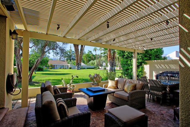 Turnkey, fully furnished, and ready for the season! This beautifully maintained home comes with an updated land lease extended through 2121 and features a rare attached double garage. The property has never been rented and has been lightly used by the owners only four months per year. Inside, you'll find a stunning condo with a one-of-a-kind expanded kitchen, upgraded finishes, and exceptional attention to detail. The open living and dining area features vaulted ceilings and a cozy fireplace, creating an inviting and airy atmosphere. There are two spacious bedrooms and two spa-like bathrooms, offering comfort and privacy for residents and guests. Step outside to a generous private patio furnished with high-quality outdoor pieces and cushions--perfect for relaxing or entertaining while enjoying lovely views of the greenbelt and a nearby pool and spa.