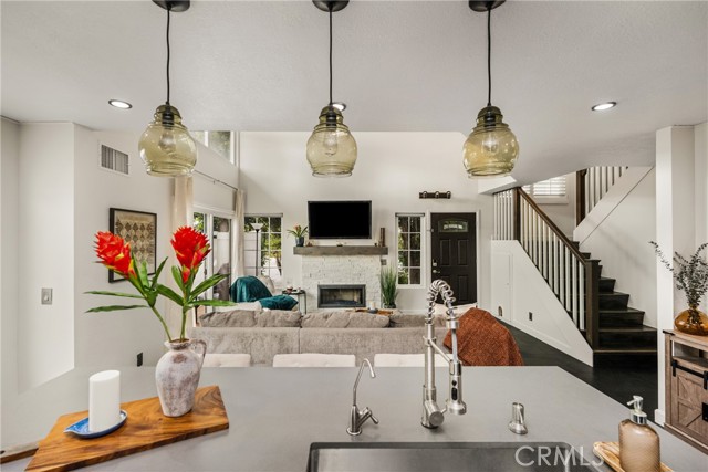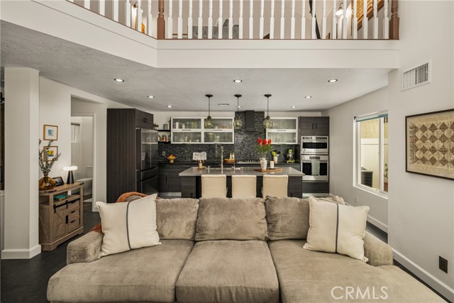 Discover a rare standout where contemporary design meets spacious, airy living. This impeccably renovated 2-bedroom, 2.5-bathroom townhome offers a level of style and volume rarely seen at this price point. From the soaring vaulted ceilings to the high-end finishes, every inch of this home has been curated for the modern buyer. The main level features an extremely open floor plan bathed in natural light. The showstopper is the fully renovated chef’s kitchen, boasting sleek dark cabinetry, premium stainless steel appliances, and a massive waterfall-edge island that overlooks the living area. Transition seamlessly through sliding glass doors to your large private patio, an ideal retreat for summer dining or evening drinks by the fire. Upstairs, the home continues to impress with a huge, versatile loft- whether you need a sophisticated home office, a secondary media lounge, or a guest space, this area provides the square footage to make it your own. The primary suite is a true sanctuary featuring a large footprint, a massive walk-in closet, and a newly renovated ensuite bathroom with designer tile and luxury fixtures. Located in a highly walkable pocket of Tustin, you are just minutes away from local boutiques, trendy dining, and major freeways for an easy commute. Offered at just $820,000, this is an incredibly rare opportunity to own a turnkey, designer-finished home in one of Orange County’s most sought-after communities.