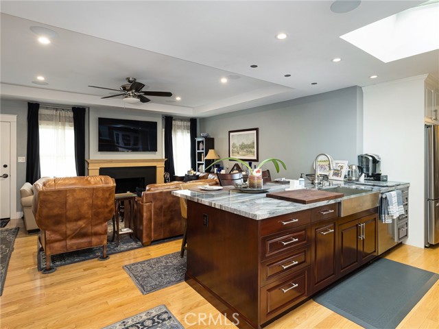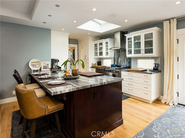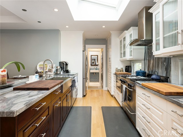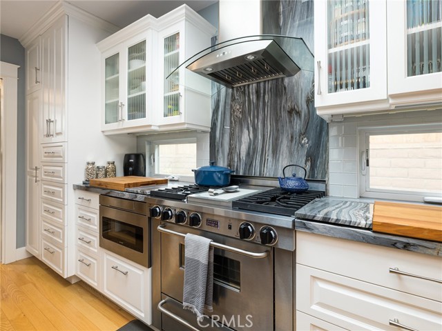 Single-story thoughtfully upgraded home in a central El Segundo location—near all schools, recreation park, city hall, and restaurants! The living room, upgraded kitchen, and large dining areas are designed in a seamless open-concept layout. The living room features recessed lights with dimmers, a wood burning fireplace with granite hearth, and custom built-in maple china hutch/storage with interior lights. The chef’s kitchen features a large peninsula with breakfast bar seating for three, custom built cherry wood and maple cabinetry with soft-close cabinets, marble countertops, stainless steel Kohler sink and faucet with an upgraded ultra quiet Insinkerator disposal, a built-in Sharp drawer microwave, Miele high-end ultra quiet dishwasher, wine refrigerator, large pantry, and Five Star Chef’s Stove with stainless steel/glass hood vent above it. Pocket doors provide separation between the kitchen and laundry areas, and the upgraded bathroom with Velux skylight, for added flexibility. A large Velux skylight in the kitchen brings in abundant light and breezes as well as quadruple-paned windows throughout most of the house provides excellent sound insulation. The east end of the house conveniently presents all of the bedrooms. The main bedroom is generously-sized and opens directly to the private yard through the French doors. The second and third bedrooms are of ample size. The sizable second bathroom sits in between all three bedrooms and offers a separate tub and shower and Velux skylight, recessed lighting with dimmers, and ample storage. The backyard features newer decking with carpet covers, direct ally access, and newer exterior brick walls/privacy fences with custom built extra large heavy duty metal gates. Additional highlights include: new 100-year red oak hardwood floors throughout the home, solid wood doors, custom craftsman trim for doors, windows, and baseboards, Sonos speakers in each room/exterior and surround sound in the living room, new Casablanca fans in each room, an alarm system and Ring doorbells, large central heating that is AC ready, a new water heater, new Windsor-One Craftsman style trim for roof, window, and doors, one-car garage with abundant overhead storage, newly installed porch handrails, and new upgraded garage door with Smart Chamberlain remote. With thoughtful upgrades throughout, quality finishes, and highly functional floor plan, this home is move-in ready.