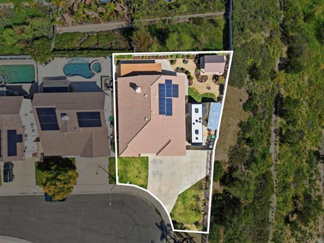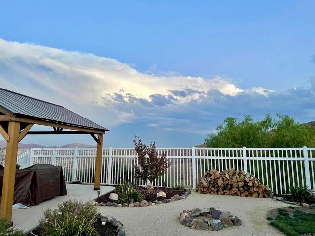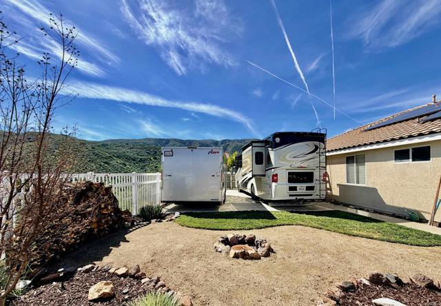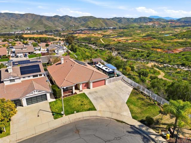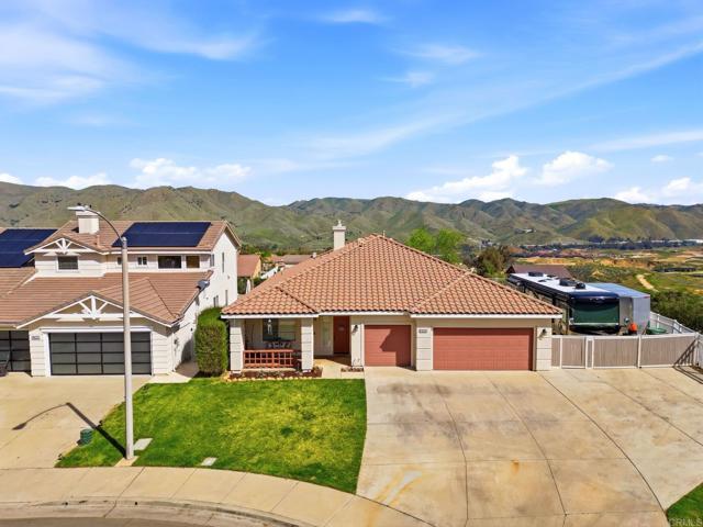 Located at the very top of Horsethief Canyon Ranch Community this home is the one you have been waiting for!! Single level four bedroom, two bath has loads of natural light and forever views. Primary suite is on its own wing of the house with privacy and a beautiful en-suite bath with garden tub and large closet. Bring your toys! Large gated side yard space with full hook-ups can accommodate your RV, trailer, off-road vehicles or boat. High ceilings with crown molding, beautiful designer paint throughout, open floorplan with fabulous entertaining space inside and out. Large lot on a cul-de-sac features fire pit and charming covered pergola and gated dog run. Owned solar system with 18 panels. Community features a K-8 school, dog park, sports fields, tennis courts, beach volleyball, clubhouse, fitness center, two Olympic-size pools, and several neighborhood parks. Bordering Lake Elsinore and overlooking the Cleveland National Forest, this fabulous location is perfect for outdoor enthusiasts with hiking trails, watersports, and wine tasting in Temecula Valley.