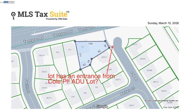 Opportunity knocks in Hayward! Situated on a generous lot, this property offers excellent potential for expansion, additional units, or future development (buyer to verify with City of Hayward). Ideal for investors, builders, or owner-users looking to maximize value. Lot is perfect for RV/Boat Access Contractor trucks. Unique separate entrance from Cole Pl. for your toys. The home is currently configured as a 4-bedroom, 2-bath, offering flexible living space for extended family or rental income (public records reflect 3-bedroom, 1-bath — buyer to verify). The lot size and layout may present an opportunity for an ADU, JADU, or possible SB9 urban lot split, creating multiple income streams or long-term upside. Strong candidate for value-add strategies including ADU development or lot split potential. Conveniently located near schools, parks, shopping, BART, and major commuter routes. Rare chance to unlock the full potential of this property — don’t miss it!